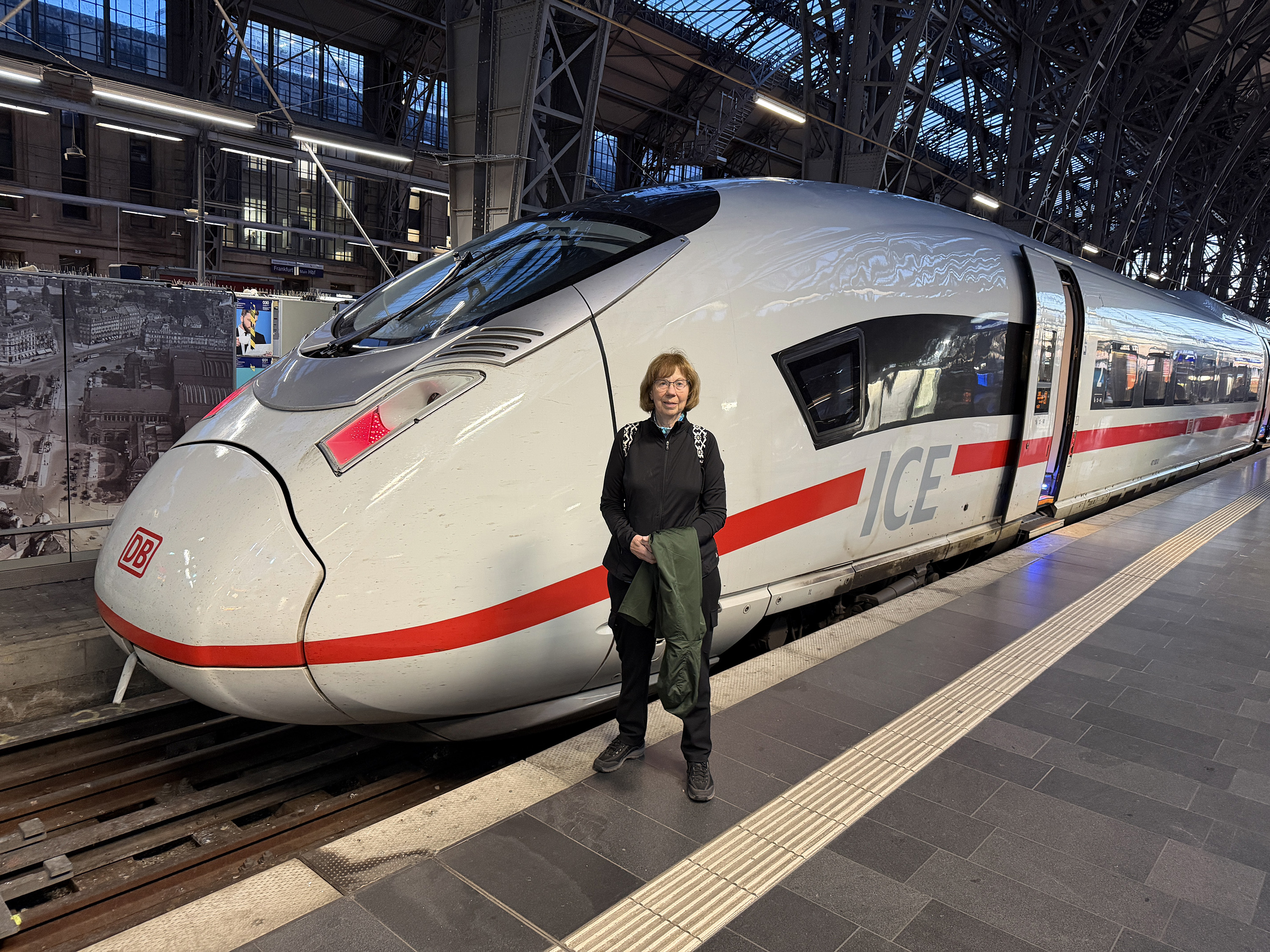 At Frankfurt, we got wheelchair service again, using secret restricted elevators to get to baggage claim. Then our assistant put us on an electric cart to take us to the Sheraton in Terminal 1, otherwise quite a long walk. What a service! The hotel is very large—1,060 rooms, one of the largest in Europe, I am told—and I erred in not asking for a room close to the elevator.