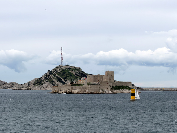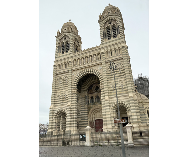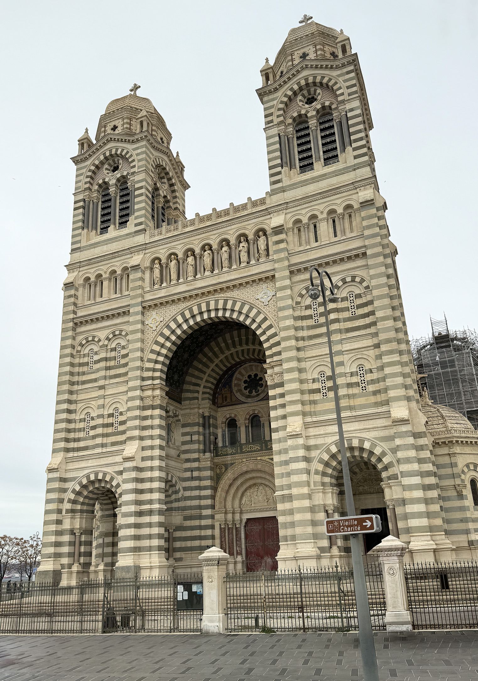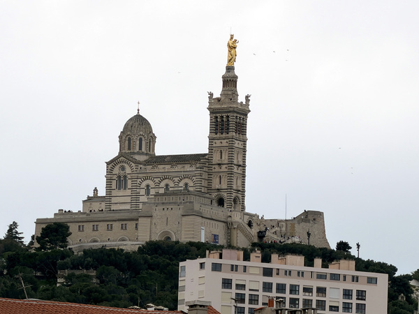 In the afternoon, there was a freebie excursion, Scenic Marseille. Some early showers gave way to sunny skies but still a bit chilly. Our tour guide was Audrey, very informative with perfect English. As we drove through the port, she told us that Marseille will get 750 cruise ships this year. Here are highlights from the 4-hour tour. We passed by the area called La Joliette, where in 49 BC Julius Caesar camped at the creek while he conducted the Siege of Massilia and then sacked the town. The Cathédrale la Major de Marseille was attractive, with a striped decor. Fort Saint-Jean and Fort St. Nicholas (the Citadel of Marseille) loomed over either side of the old port; the former faced outwards to the sea, the latter inwards to protect France (Louis XIV) from Marseille. Following the initial assaults of Operation Dragoon in August 1944, the Germans used St. Nicholas as their main position defending Marseille (unsuccessfully) against attacks by the French First Army. We drove on a major street, Rue de la République, known for its Haussmannian architecture. The biggest of the main streets is now a pedestrian mall, La Canebière.