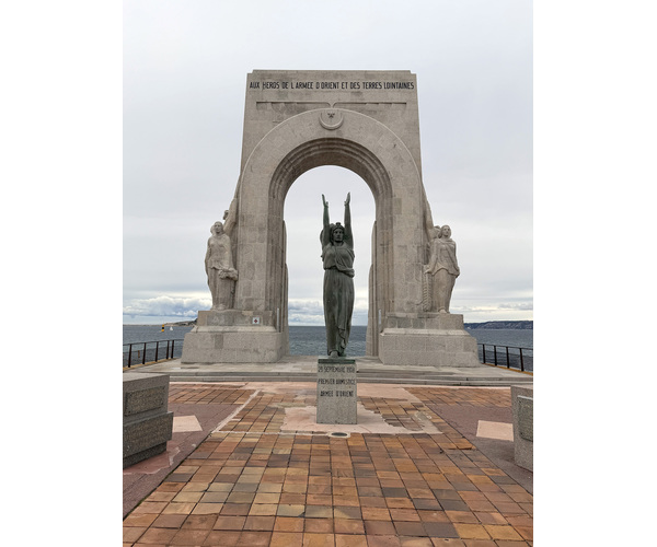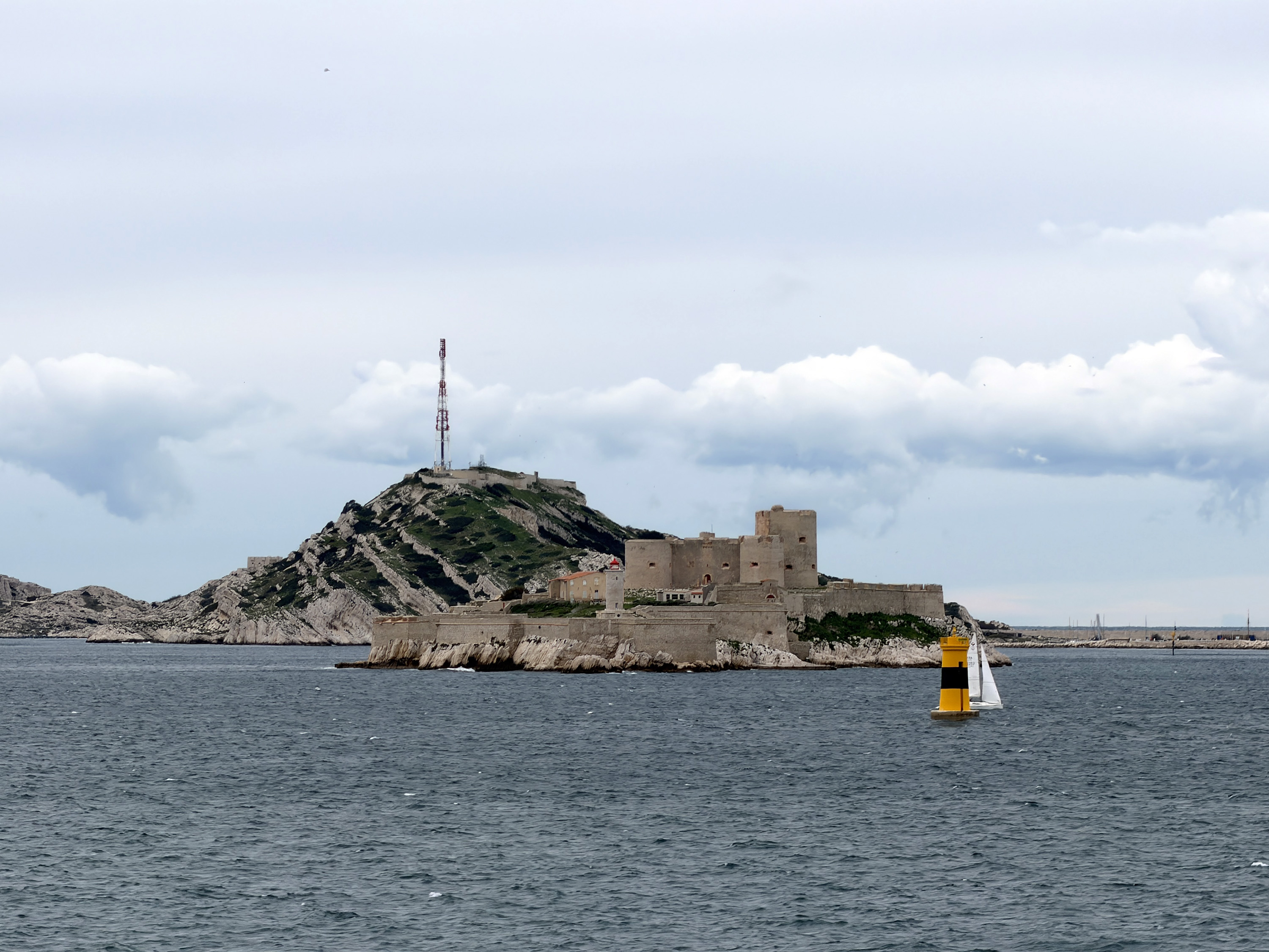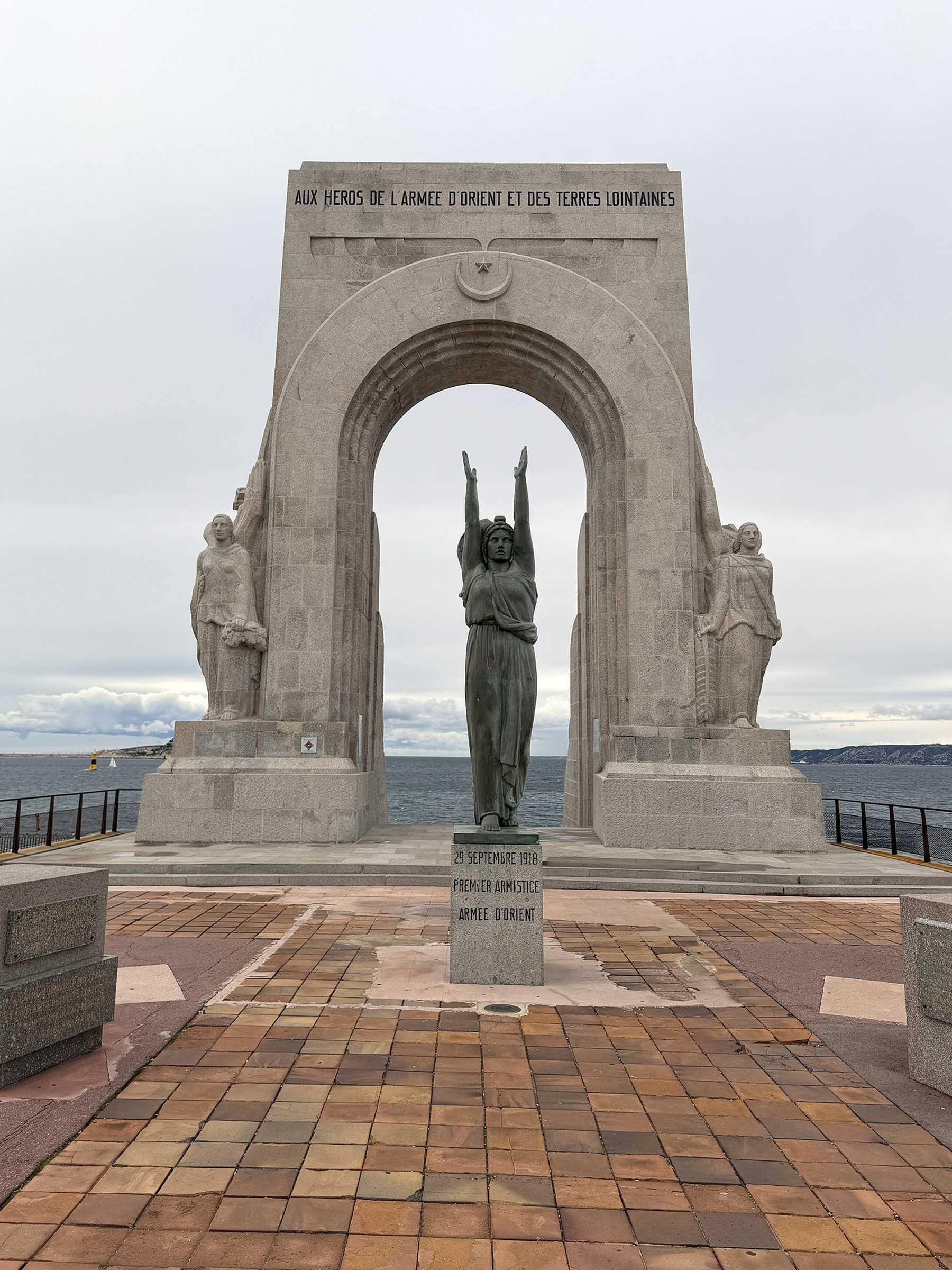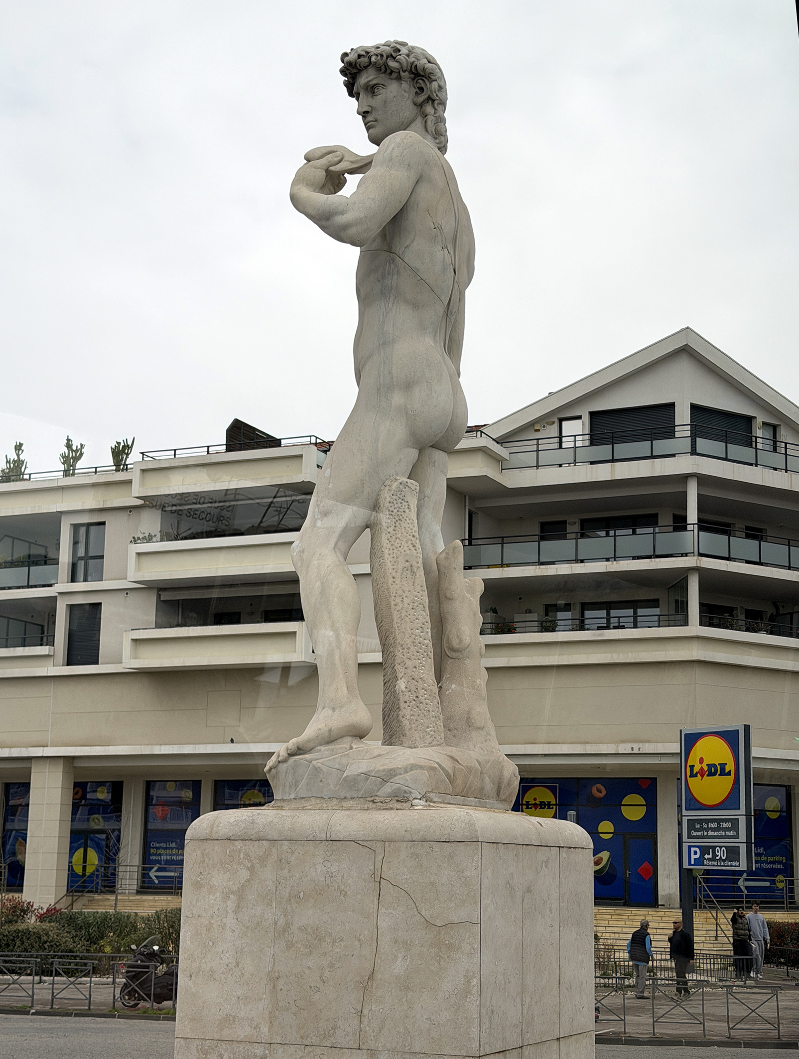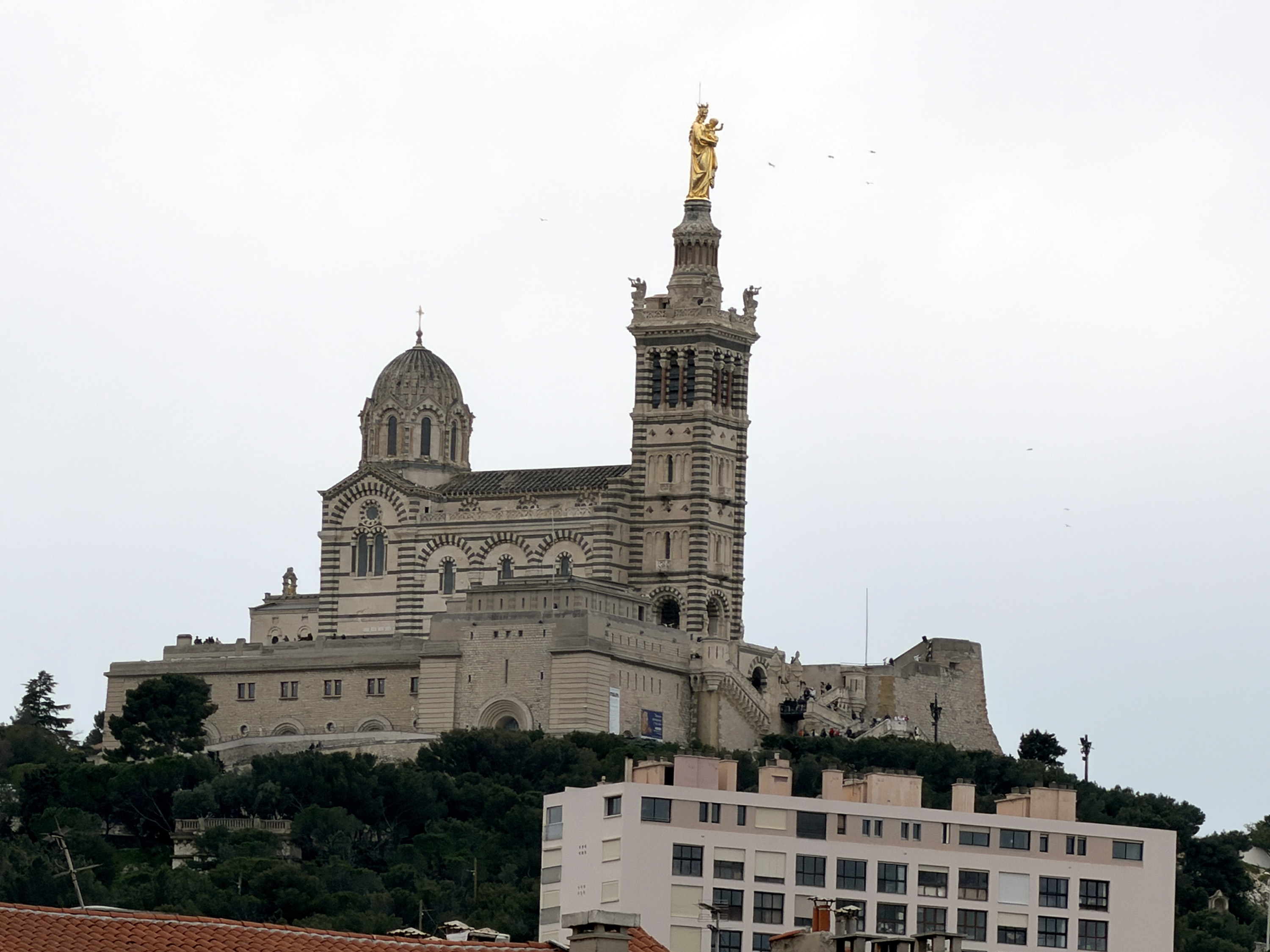 Outside of the main town overlooking the sea is the Corniche JFK. We got off here for photos. In the near distance were two small islands, one of which hosted Château d’If, the prison setting in the Count of Monte Cristo. There is also a large monument, the WWI Monument Aux morts de l’Armée d’Orient (the Army of the Orient and distant lands, meaning mostly North Africa and the Middle East). We passed a small cove where the 2024 Olympics sailing competition was held. At the southernmost end of Marseille was the district of La Goudes, which locals call “the end of the world.” Here we saw a statue of David, virtually identical to Michelangelo’s, but by another artist. We drove through an expensive residential area, Roucas Blanc, and then by the spectacular Basilique Notre-Dame de la Garde, the most important church in the city it overlooks from the highest geographical point. We finished up with an hour on our own to wander around the old port.