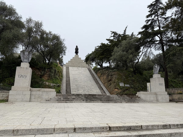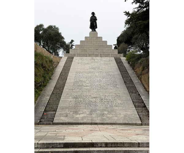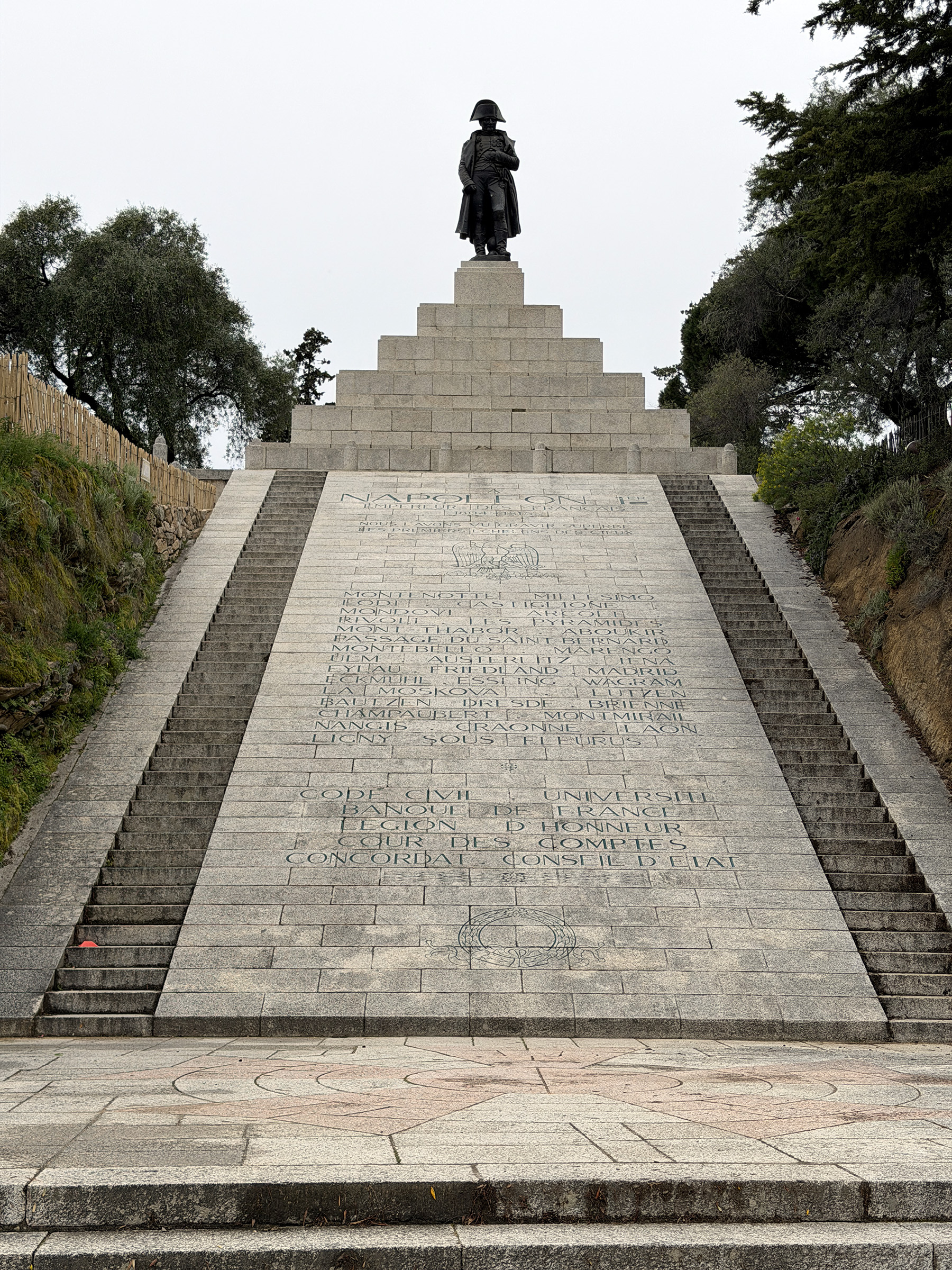 The Ides of March! We arrived in Ajaccio (uh-ZHACK-see-oh), the capital of Corsica and birthplace of Napoleon Bonaparte, around 7 a.m. A chilly 50° with showers expected. For our included excursion, "Scenic Ajaccio," our guide is Didier, an affable older guy with excellent English. We drove through the sleepy town, which has only 75K inhabitants. The island was under seven centuries of Italian rule—Pisan, then Genoan—but has been French since losing a battle in 1769. (The same year Napoleon was born.) Corsica is now the French prefecture of Corse-du-Sud. The official language is French, but many of the inhabitants speak Corsican, which is much closer to Italian.