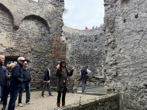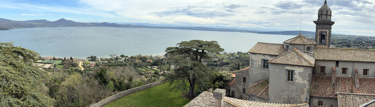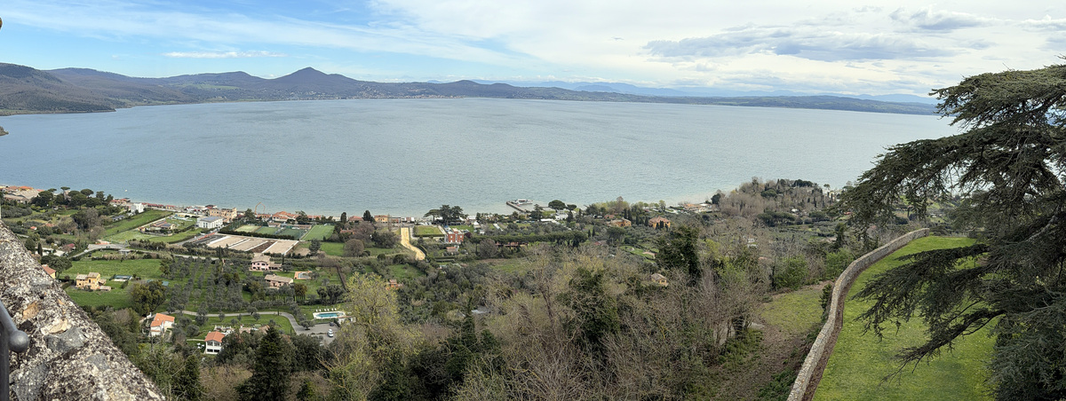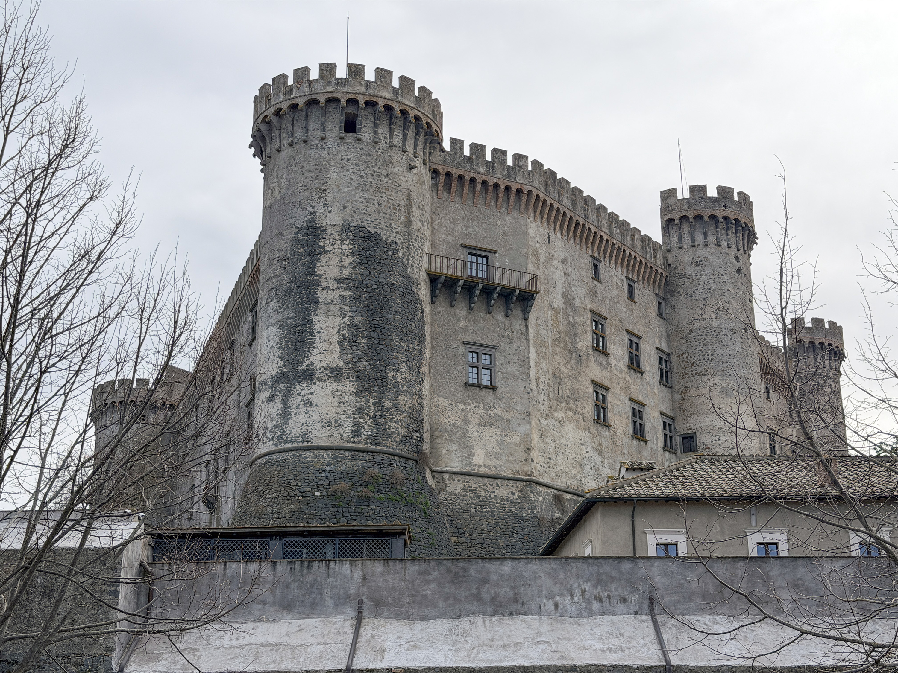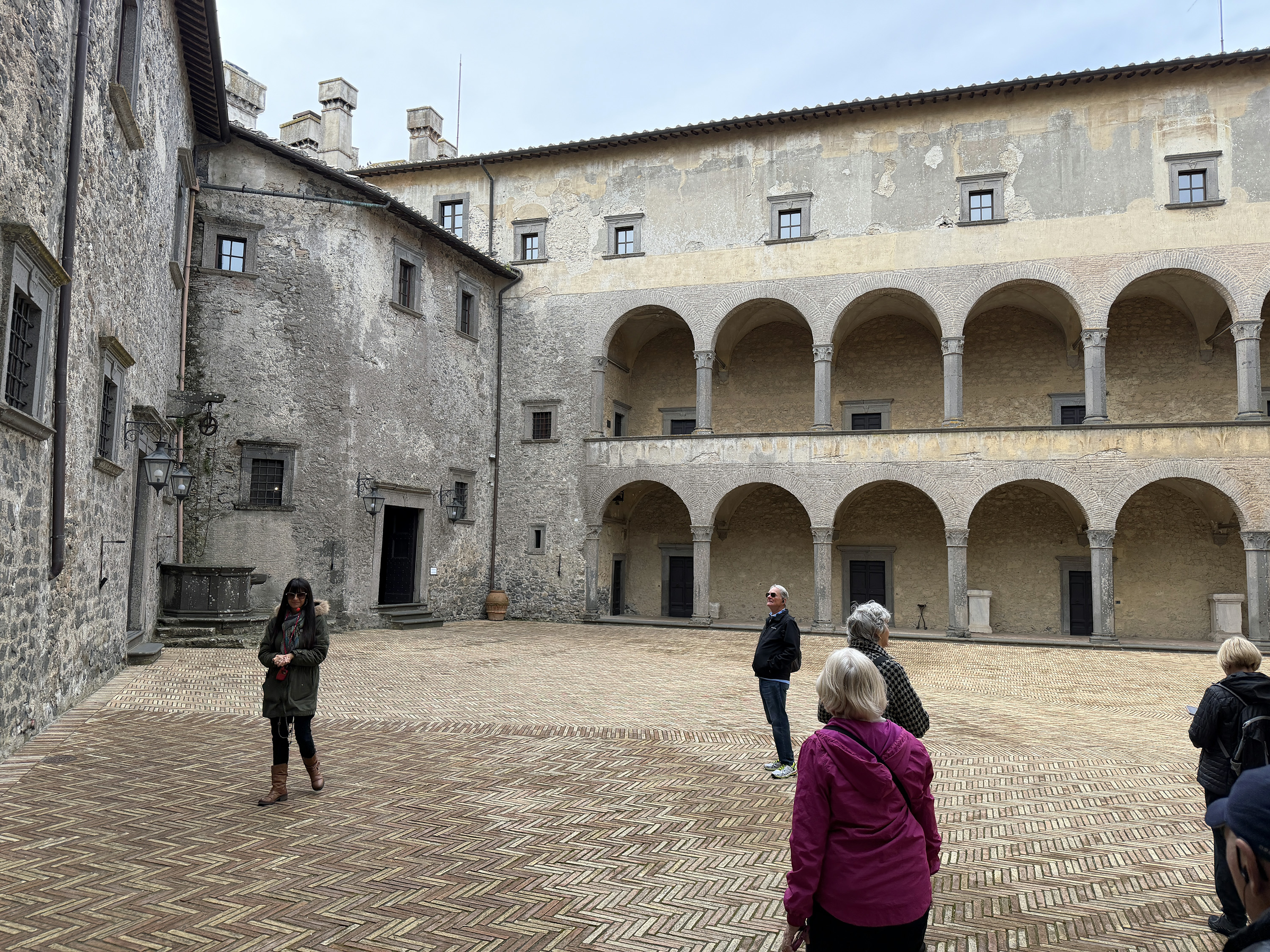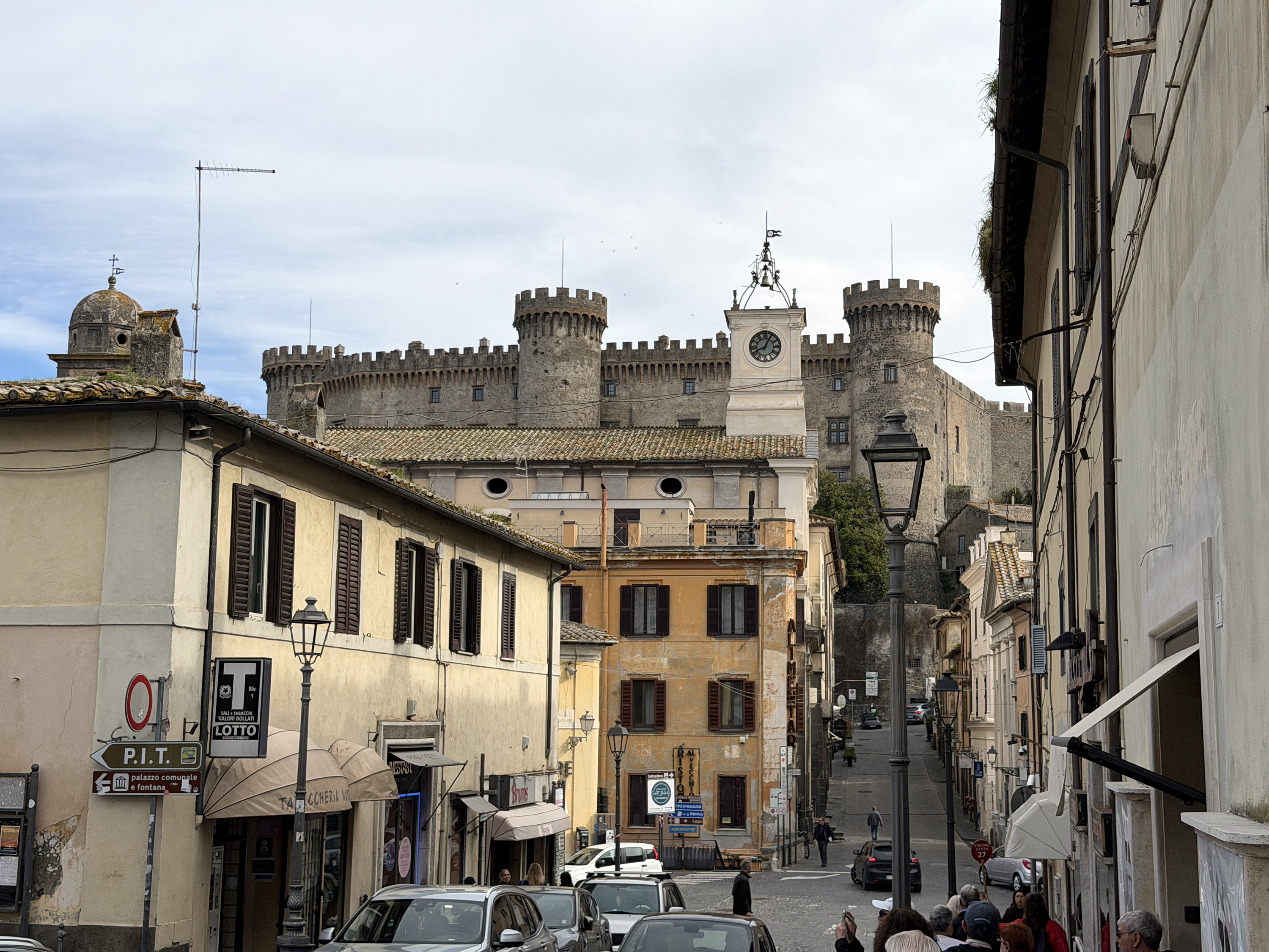 Beautiful sunny weather today, arriving at Rome’s distant cruise port around 7 a.m. We spent a few days in Rome a couple of years ago, so we didn’t fancy four hours of bus riding and a ten-hour day for a superficial return visit. Instead, we booked “Bracciano’s Castle and Carbonara Tasting,” at six hours the shortest of the excursions. Our guide was a nice young woman named Natalie, a representative of “Trumpy Tours.” We drove about an hour to the small town of Bracciano, overlooking beautiful Lago di Bracciano. Last year I was about 20 miles east of here visiting the Italian Air Force Museum.