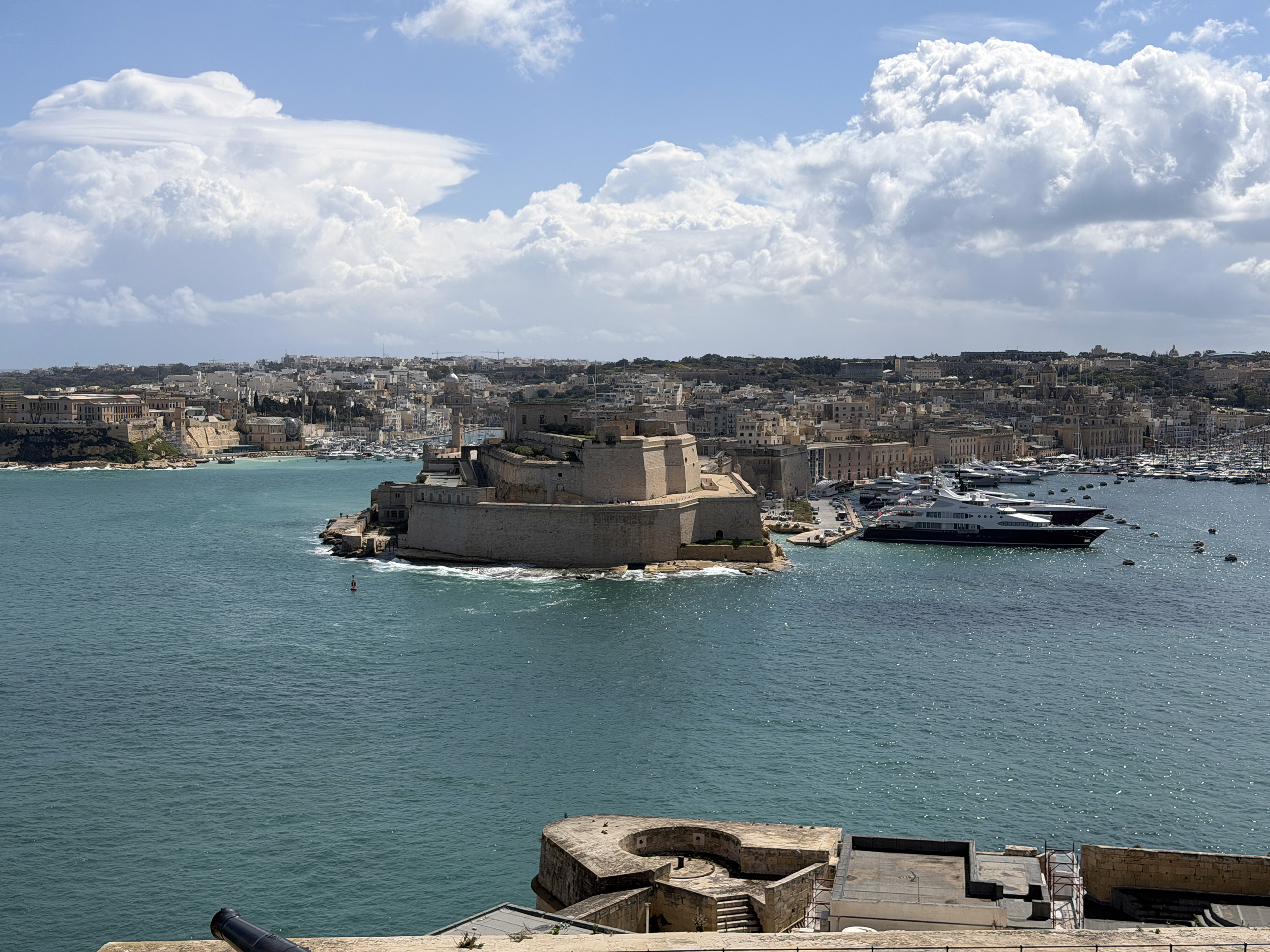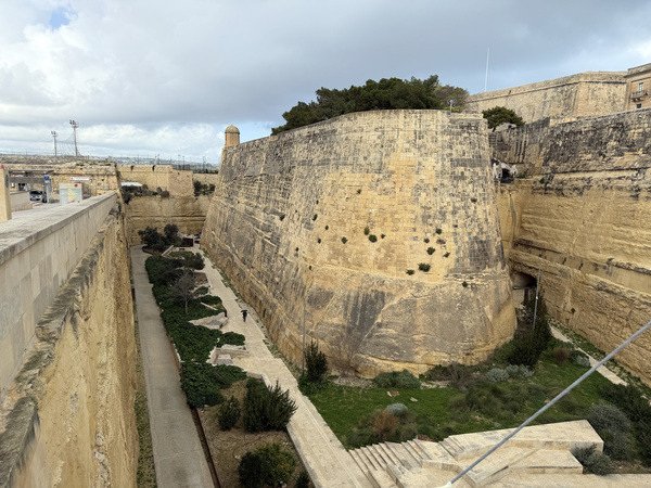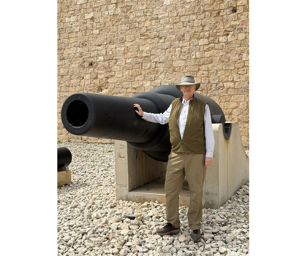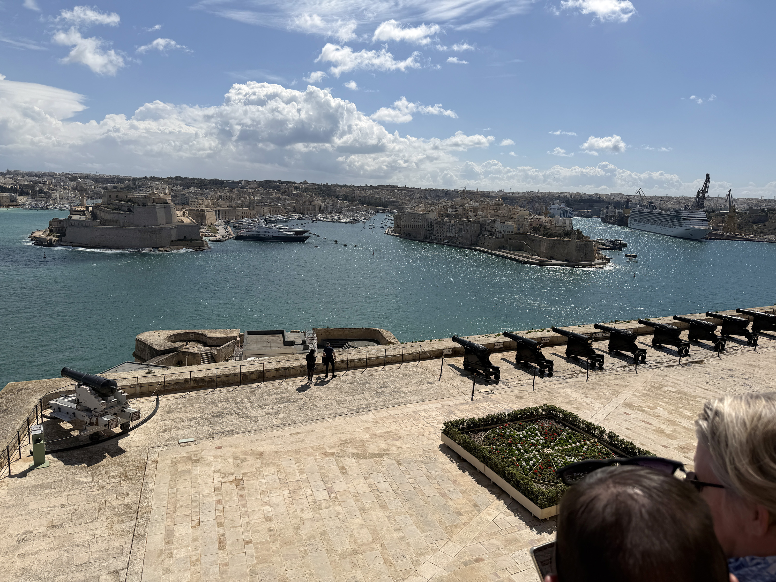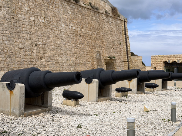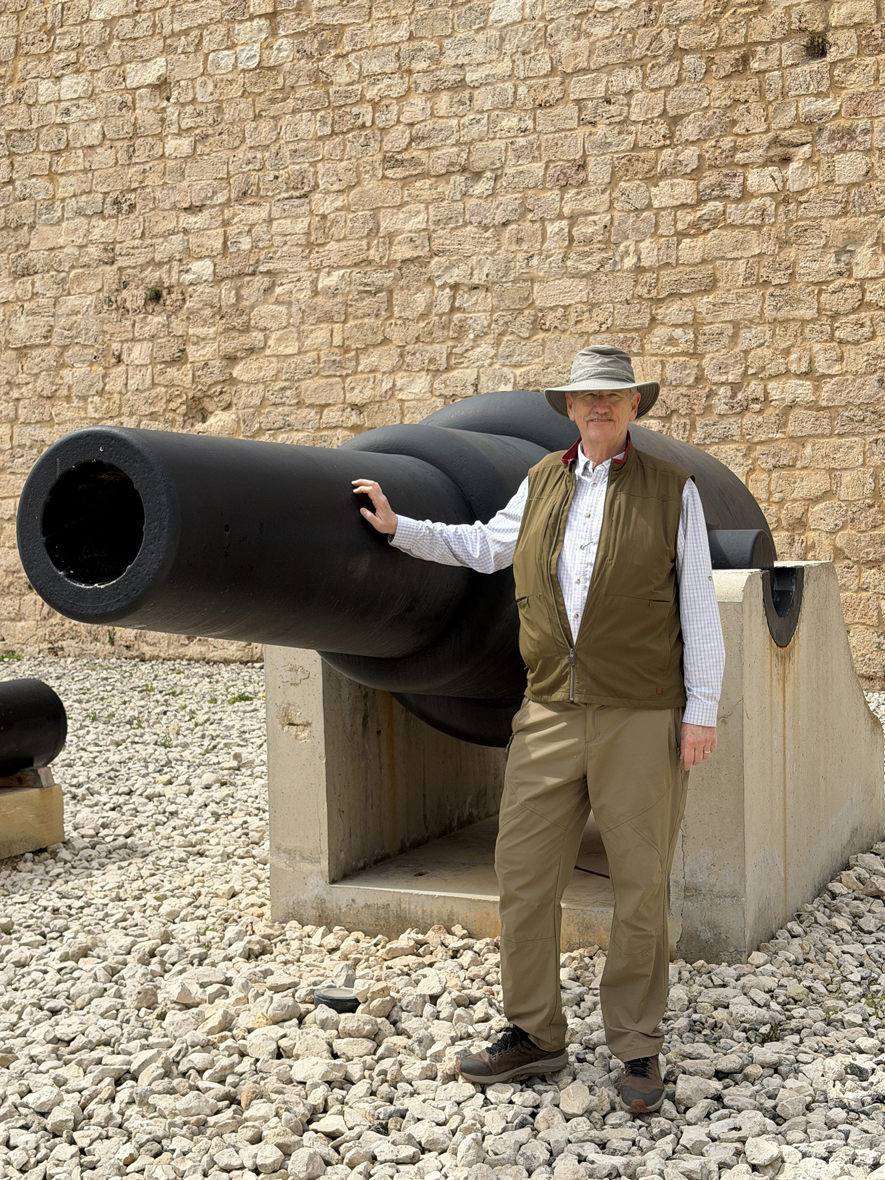 Today is a recuperation day for Nancy, but she encouraged me to get out and do something. I had to cancel a Viking shore excursion about “Wartime Malta,” so I had a few catch-up opportunities. Fort Elmo is right at the tip of the peninsula that hosts downtown Valletta. It was built by the Knights to defend the harbor and was expanded over the years. They are currently hosting an art exhibition called Malta Biennale 26, which I mostly ignored. Up on the parapets, there were great views of the harbor, and I almost caught a glimpse of King’s Gate in Rinella Bay, where Ned Stark arrived at King’s Landing in Season 1 of Game of Thrones. (The next season, they moved KL to Dubrovnik.) There are many big gun barrels on display outside, none of them identified. The mighty one I posed with had a muzzle diameter of 11.5 inches.