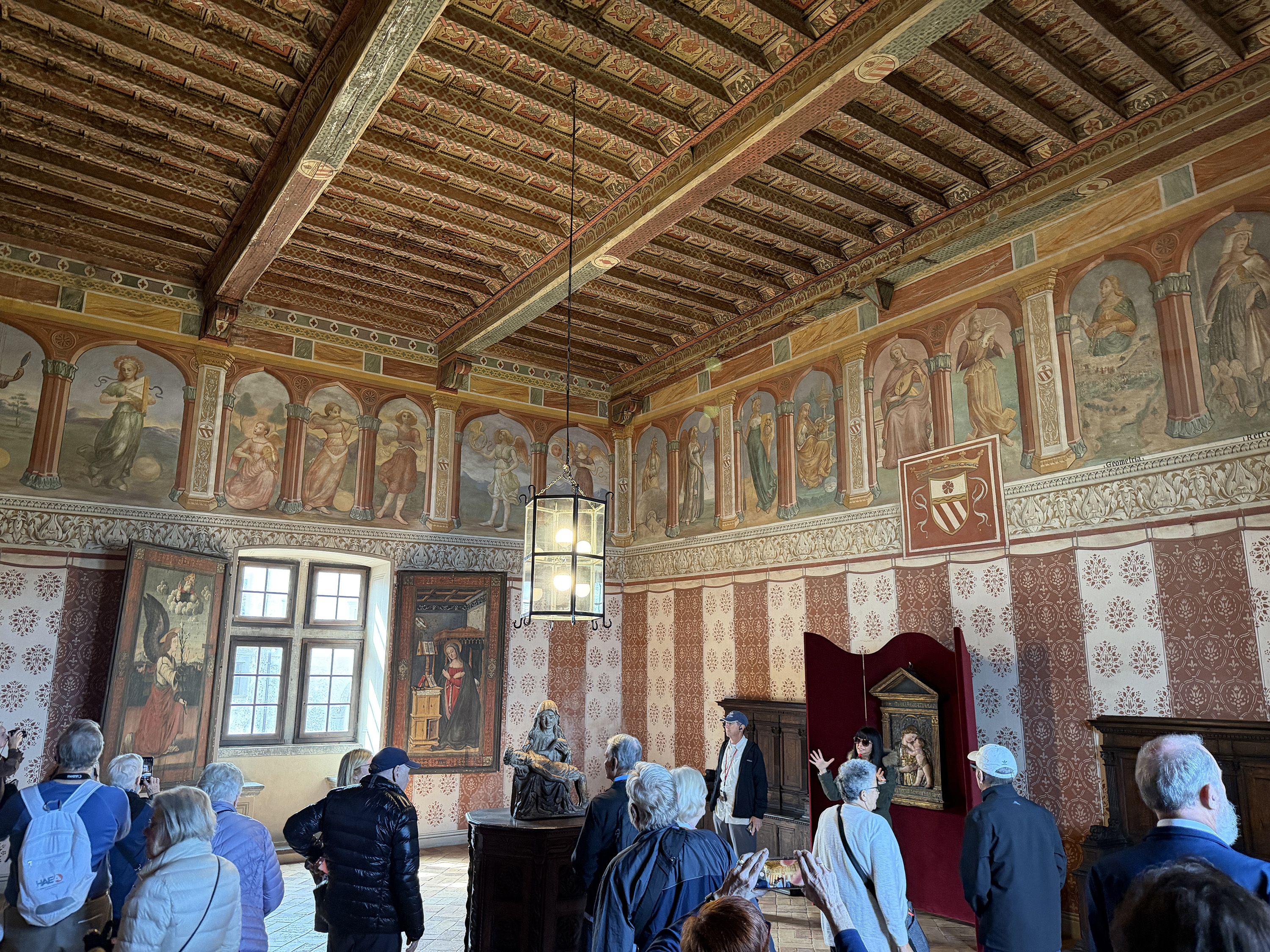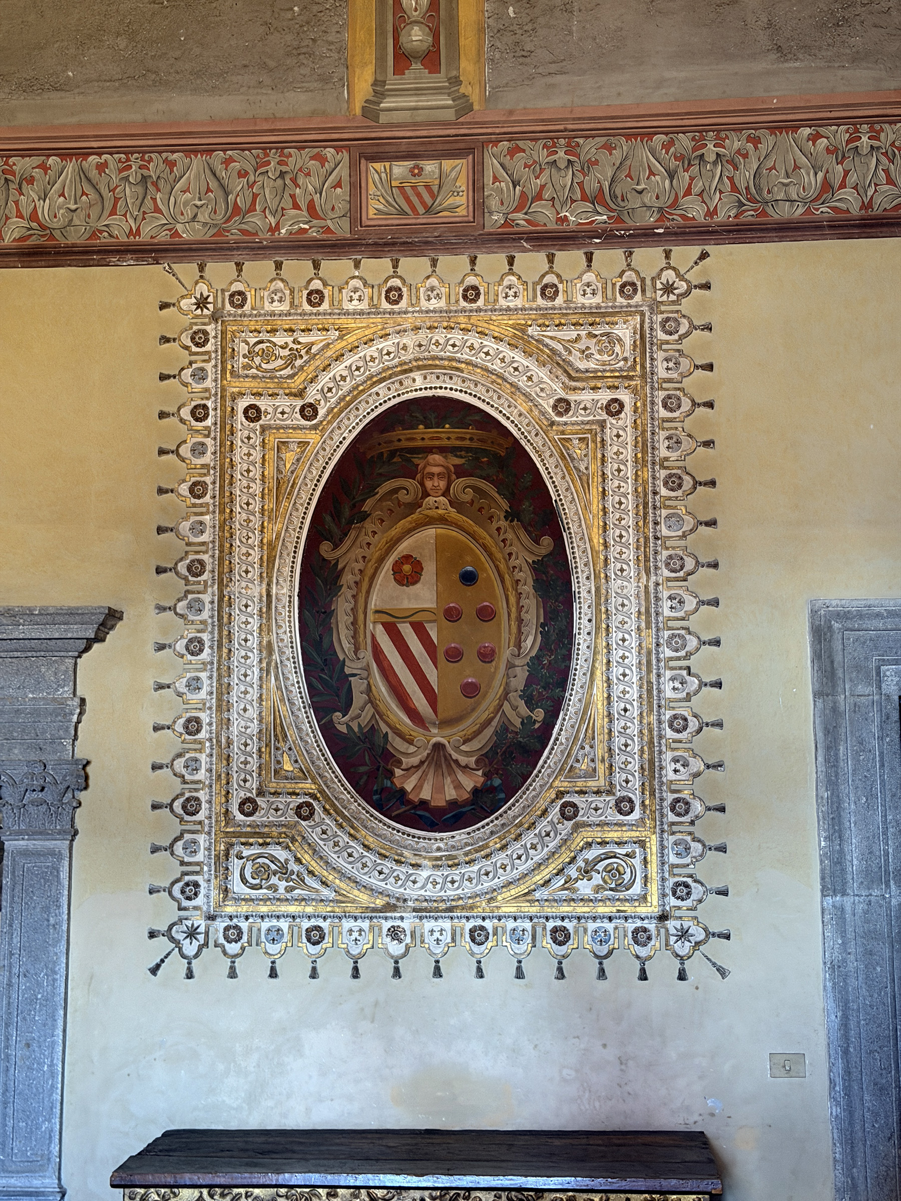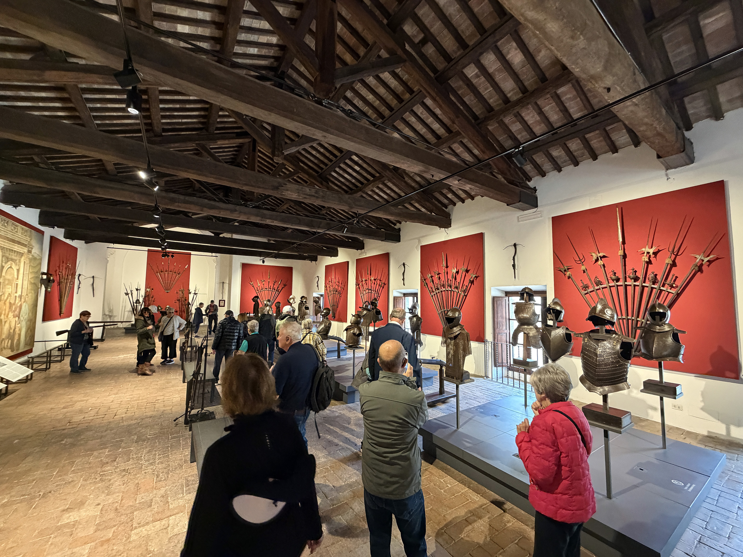 The castle (Castello Orsini-Odescalchi) is on the highest hill in town. We met a local guide, Moya. The castle was built between 1470 and 1485 first as a military fortress and then in the second half of the 16th century as a residential palace. The Orsini family—the dukes of Bracciano—were the builders and owners. Paola Orsini married Isabella de’ Medici—daughter of Cosimo—and Moya had a few stories to tell about her beauty and infidelities. In 1696, the property was purchased by the Odescalchi family of wealthy bankers from Florence. The castle is available for rent; Tom Cruise and Katie Holmes were married here in 2006. We enjoyed stunning views of the lake and town from the ramparts. Then we visited dozens of huge rooms, some with 7m ceilings and at least one with 14m. Kitchens, armories, libraries, bedrooms, ceremonial halls, etc. Lots of original fixtures and beautiful decorations. An impressive collection of armor and weapons. Of all the castles we’ve visited over the last 50 years, this one certainly ranks in the top five.
