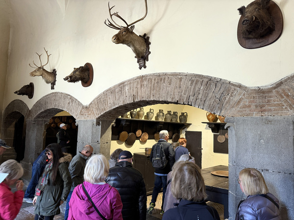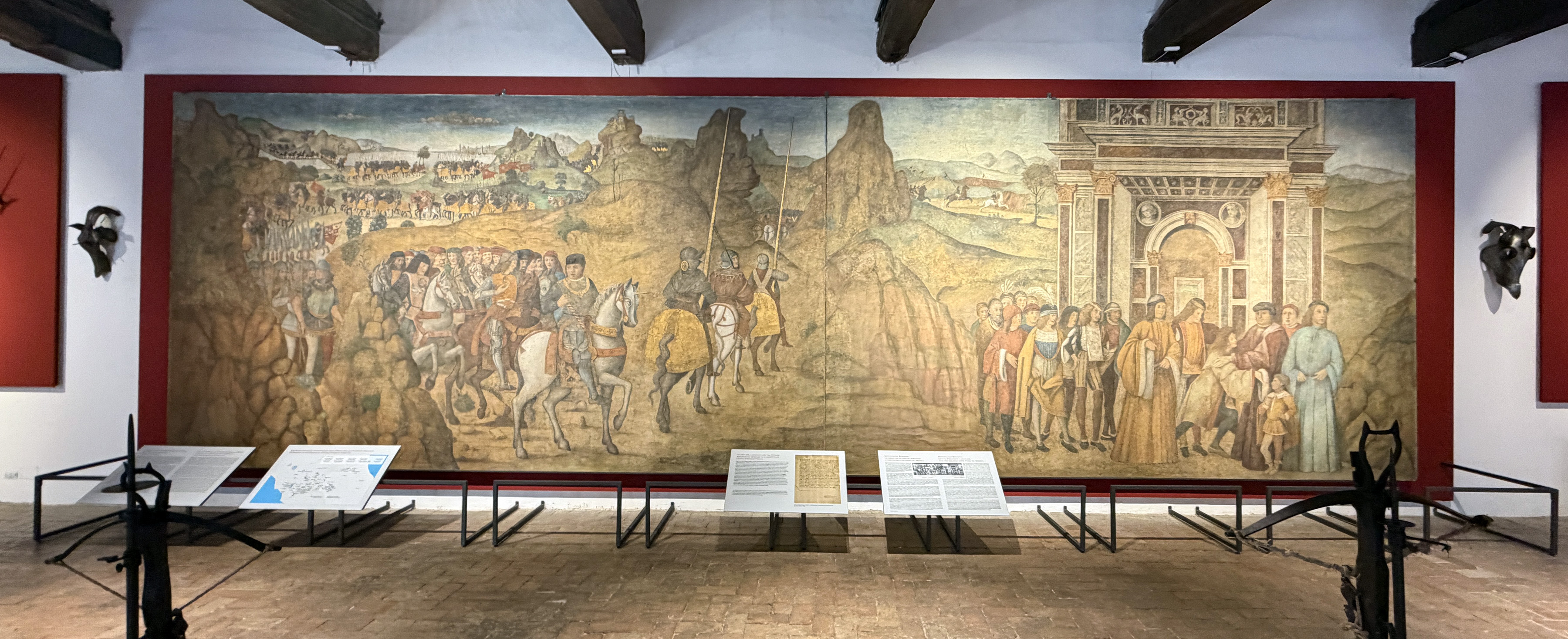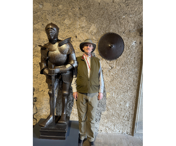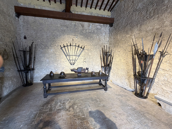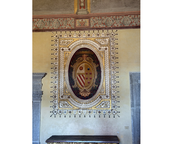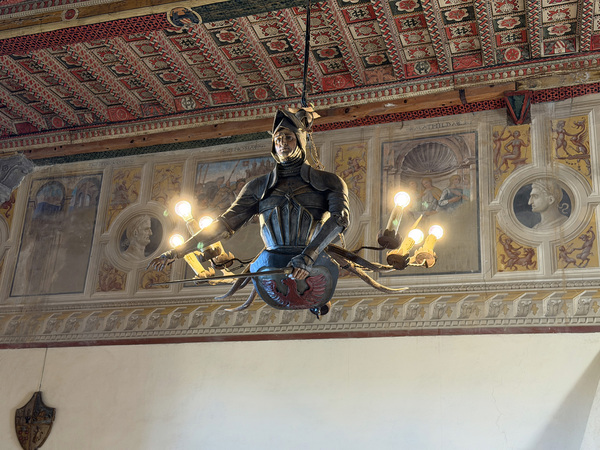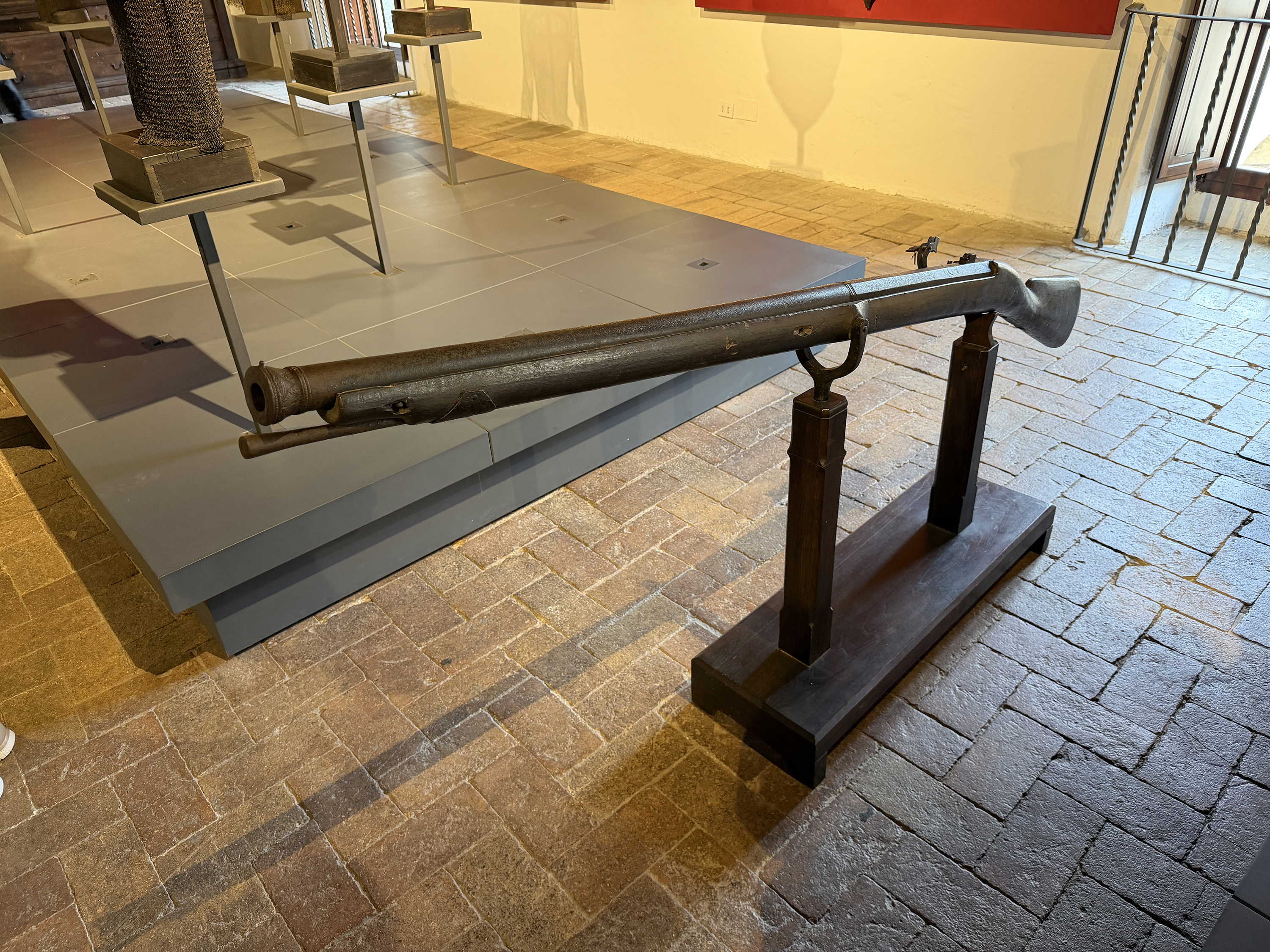 The castle (Castello Orsini-Odescalchi) is on the highest hill in town. We met a local guide, Moya. The castle was built between 1470 and 1485 first as a military fortress and then in the second half of the 16th century as a residential palace. The Orsini family—the dukes of Bracciano—were the builders and owners. Paola Orsini married Isabella de’ Medici—daughter of Cosimo—and Moya had a few stories to tell about her beauty and infidelities. In 1696, the property was purchased by the Odescalchi family of wealthy bankers from Florence. The castle is available for rent; Tom Cruise and Katie Holmes were married here in 2006. We enjoyed stunning views of the lake and town from the ramparts. Then we visited dozens of huge rooms, some with 7m ceilings and at least one with 14m. Kitchens, armories, libraries, bedrooms, ceremonial halls, etc. Lots of original fixtures and beautiful decorations. An impressive collection of armor and weapons. Of all the castles we’ve visited over the last 50 years, this one certainly ranks in the top five.