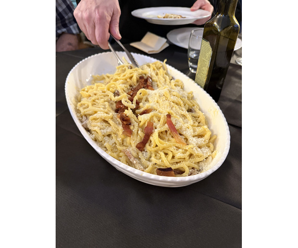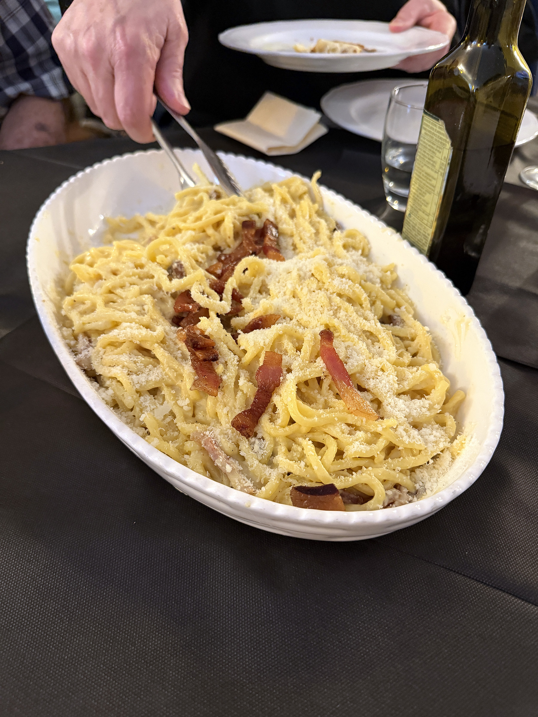 We drove to near the town of Tragiatella to visit a small farm (Agriturismo Il Casale delle Ginestre). The owner gave a brief tour of the gardens and a bunch of caged animals. They were all cute, but knowing their destiny saddened us. We saw a video about carbonara and then dug in family style. It was billed as a tasting, but we got ample seconds and thirds. Also, a modest Vino Rosso bottled from their own grapes. So none of these small animals were harmed on our behalf today. A great meal.