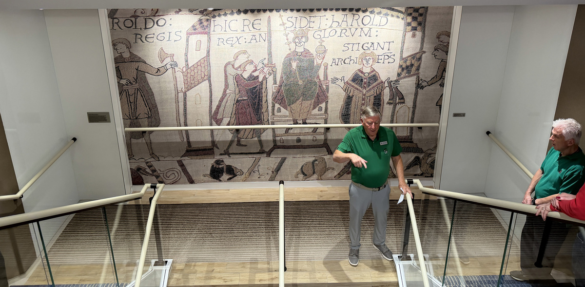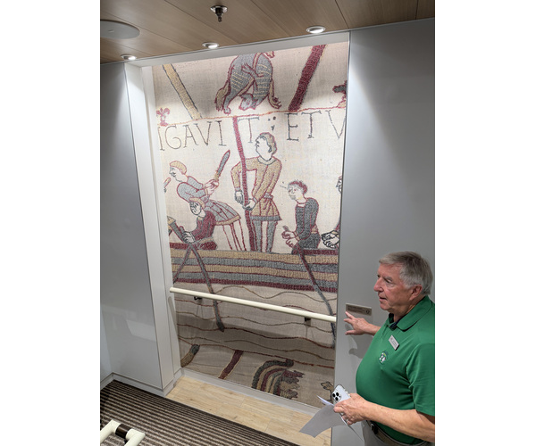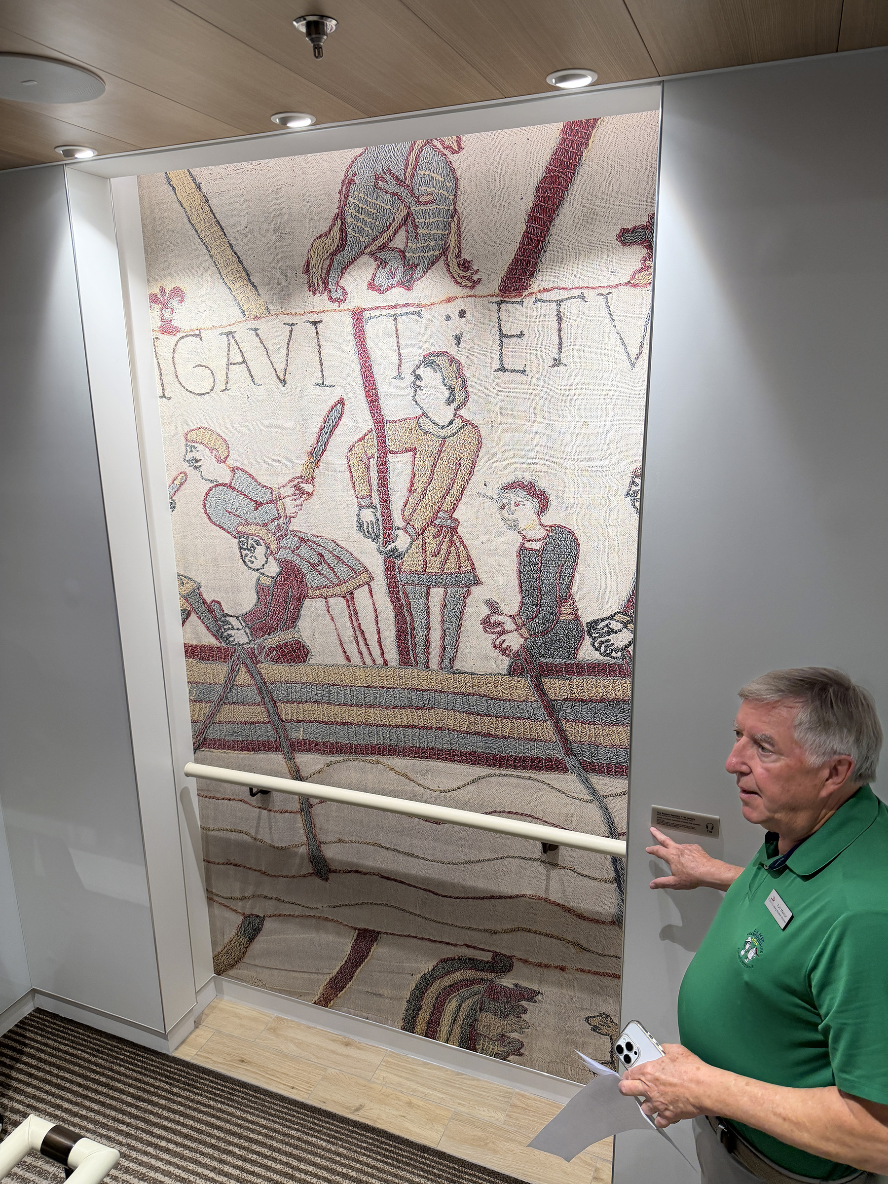 Today was for rest, with little happening on the way to Malta. Typical cruise ship trivia, talks, and even a cornhole contest. We took a guided tour of the ship’s reproductions of the Bayeux tapestries, spread out in 16 pieces at stairway landings. The original is 230 feet long, 20 inches high, so the selected pieces here are greatly blown up in high quality to be wall-sized. Apparently, the ship’s internal color schemes are lifted directly from these tapestries. Well, they are actually embroidered linen, not true woven tapestries. It was an interesting tour, and I learned a lot about Edward the Confessor, King Harald, William the Conqueror, and the Battle of Hastings. There was a showing of the final Downton Abbey movie. At the World Cafe (buffet) it was Italian Night, all quite authentic and good. The evening show was the assistant cruise director singing about her life.