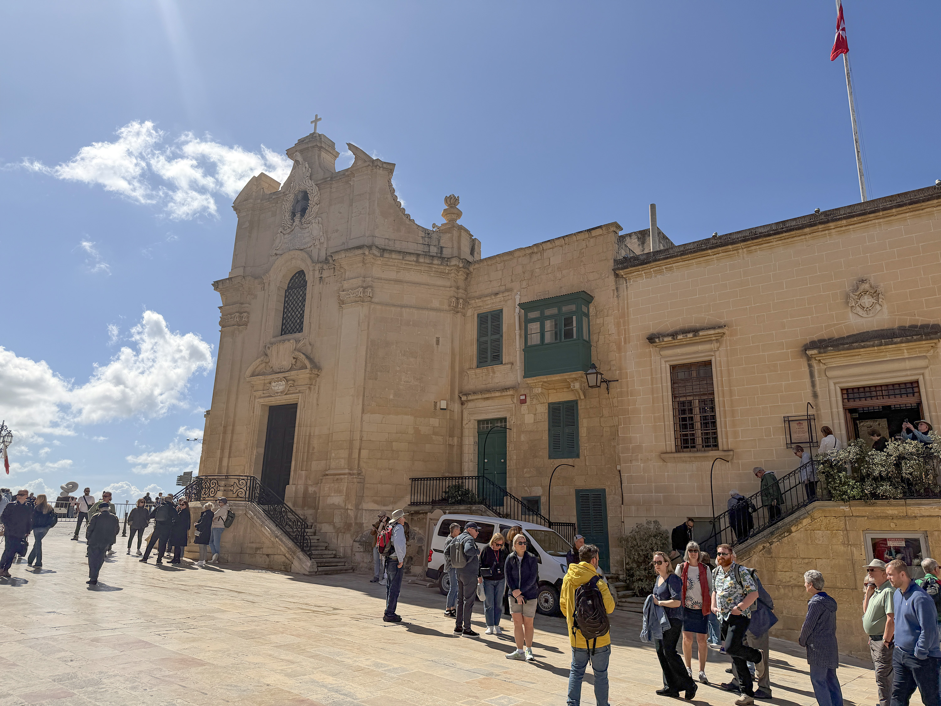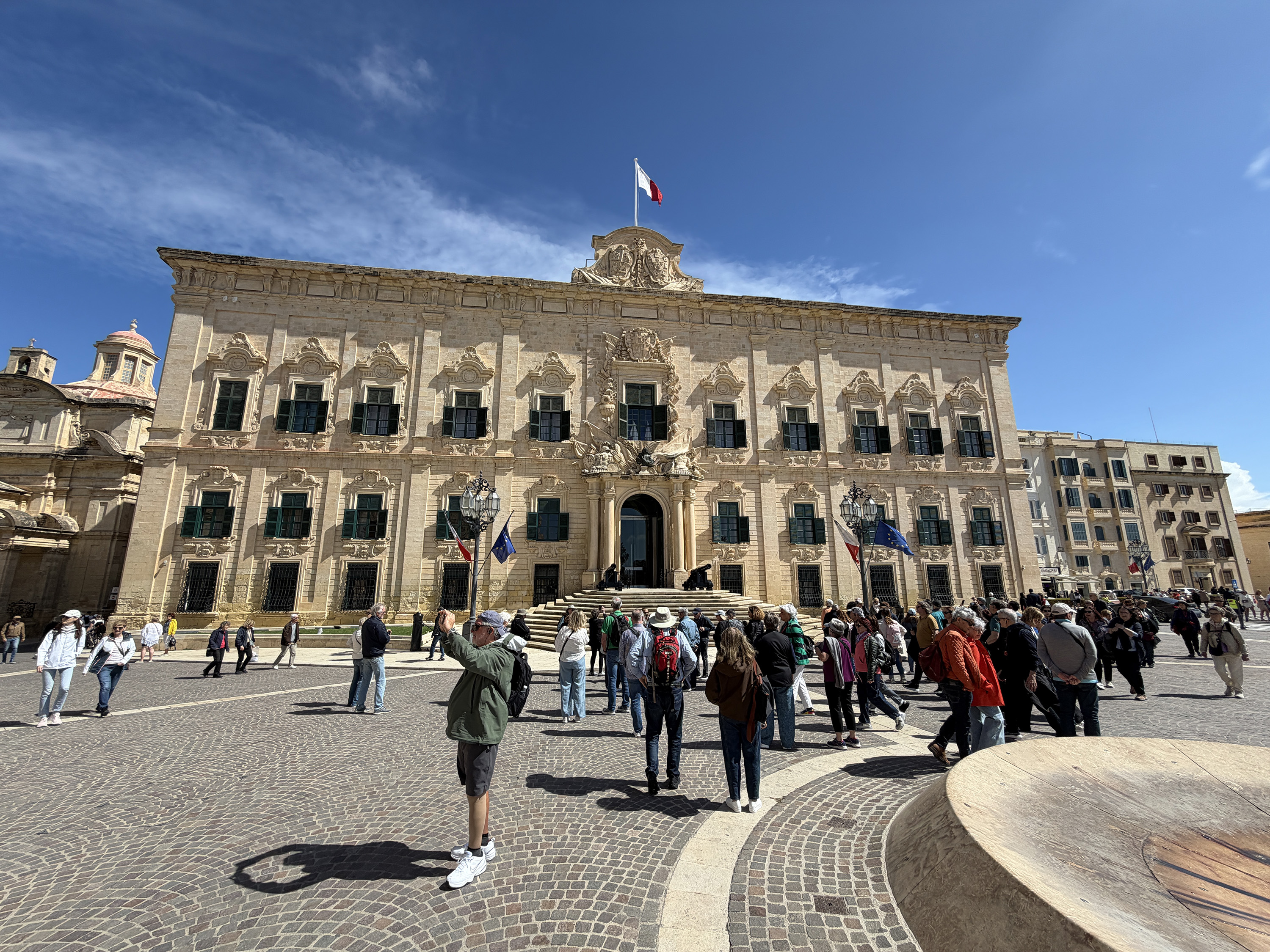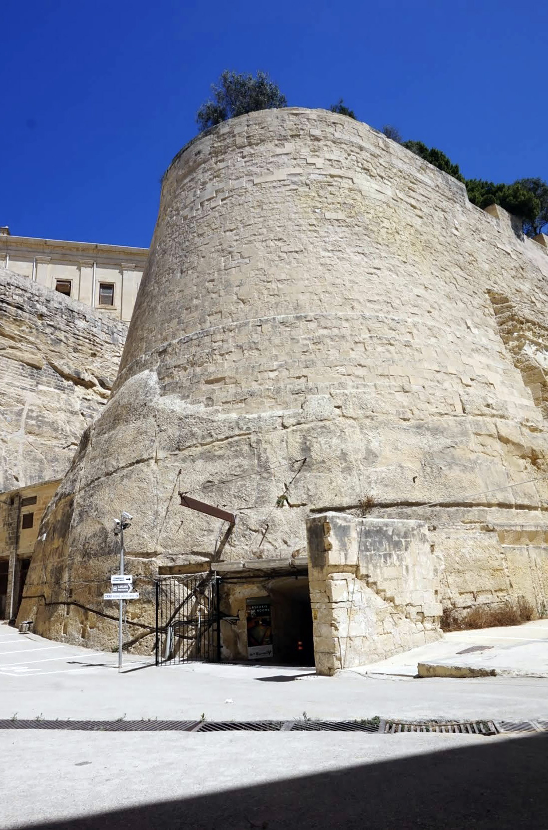 Outside, we saw a statue of Jean Parisot de Valette, for whom the city is named. He led the defense in the 1565 Great Siege. We passed by the Auberge de Castille (Il-Berġa ta’ Kastilja), where traveling knights were housed, but is now the prime minister’s residence. We crossed a pretty square, Barrakka Gardens, that was 50 meters above the underground headquarters of Eisenhower’s Operation Husky in 1943 (the Lascaris War Rooms). There is an overlook of the harbor that features the daily firing of a signal gun at noon.