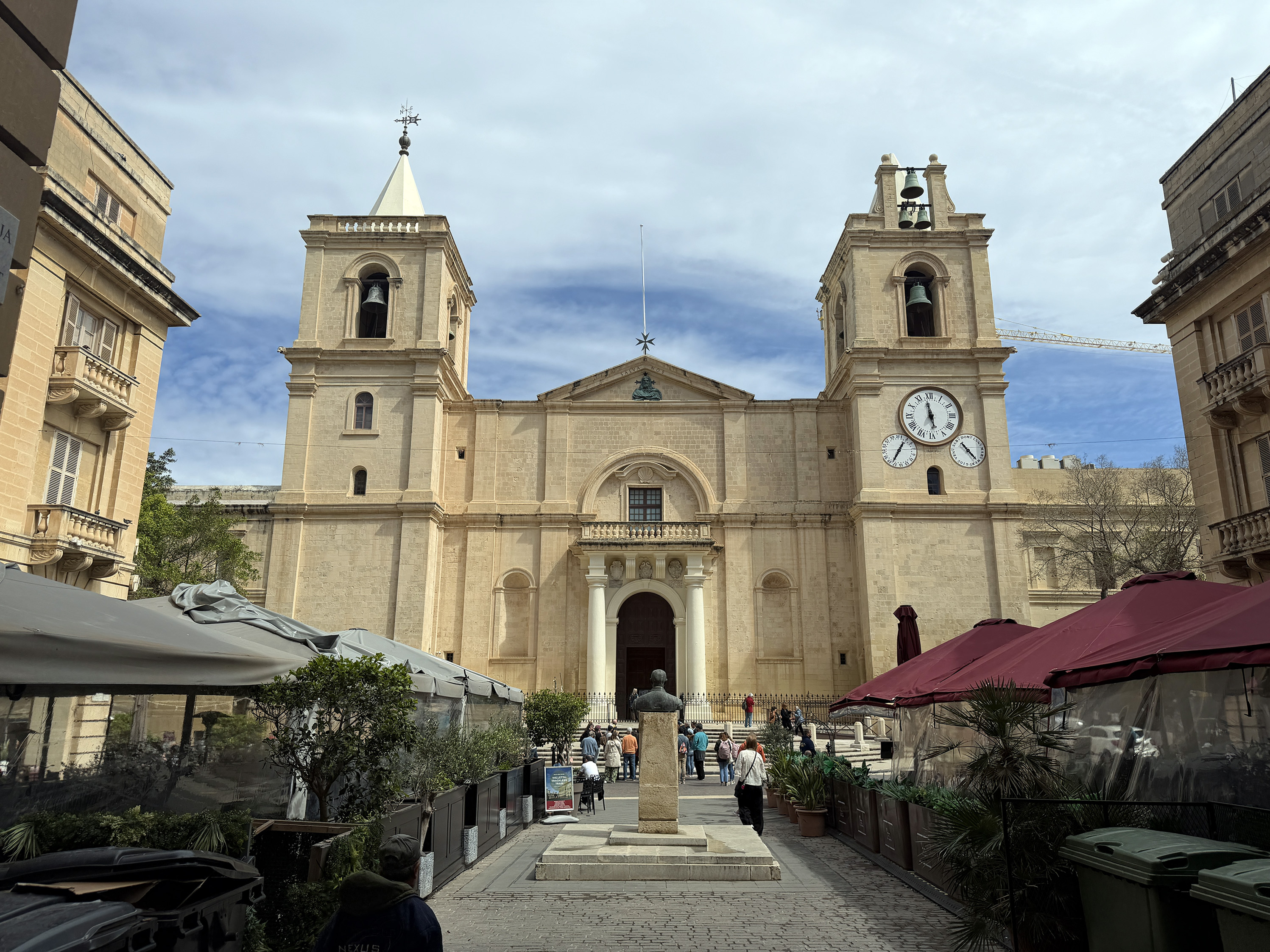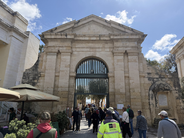 Our excursion today is “Valletta and the Knights of Malta.” We bused a short way into town and then started walking, listening to our guide John describe highlights of Maltese and Knights history. The island has been through a lot: seized by Rome from Carthage in the Second Punic War; occupied by the Byzantines; conquered by Arabs; besieged by the Ottomans; seized by Napoleon; ruled by the British until 1964. (The British influence is still here, with English as one of two official languages and cars driving on the left.)