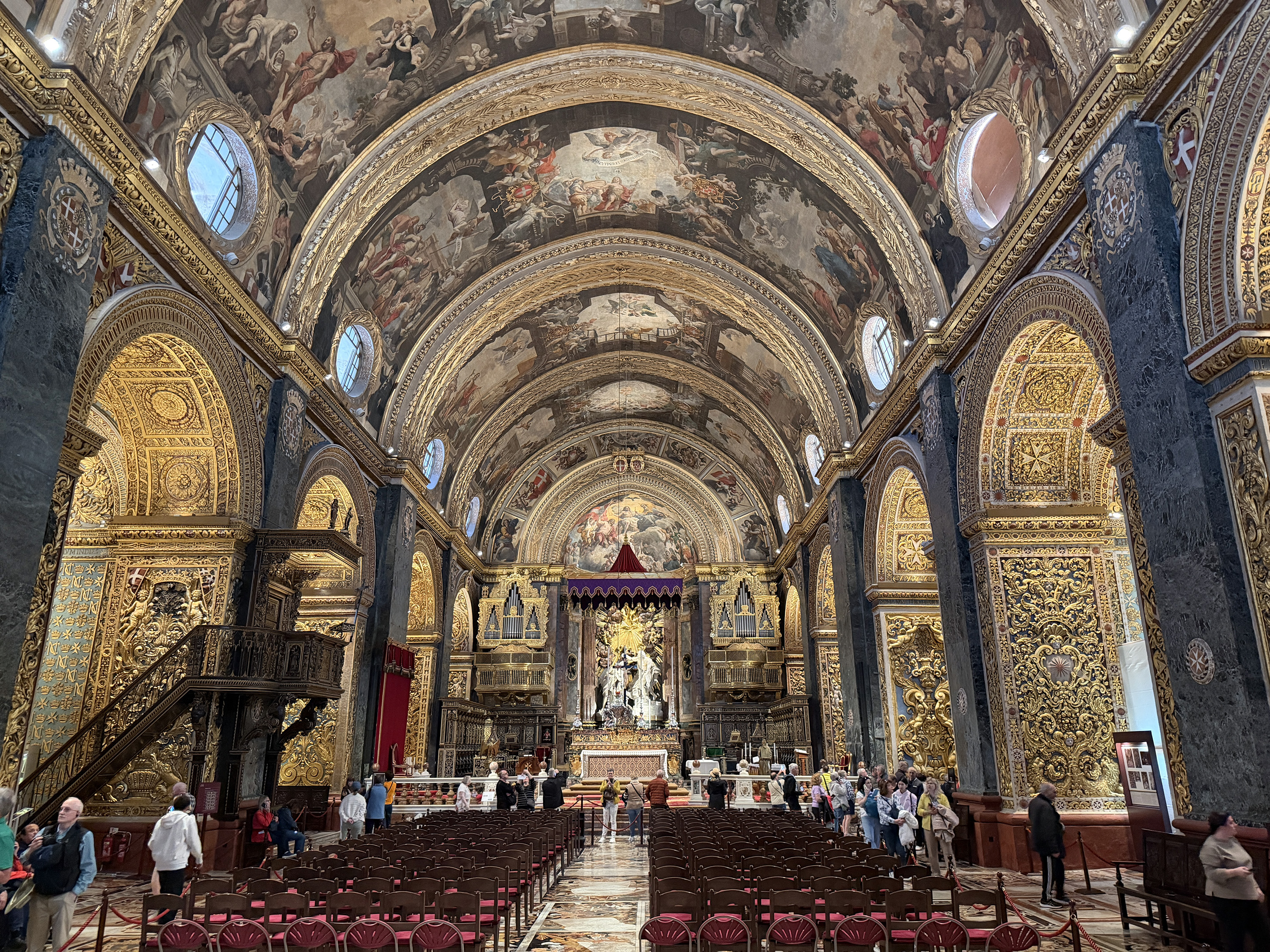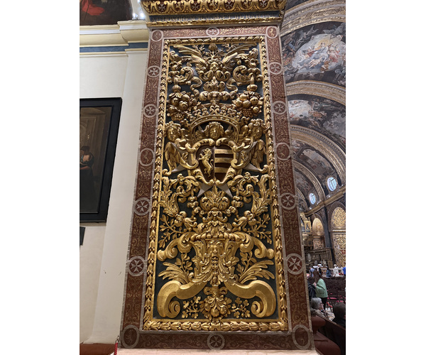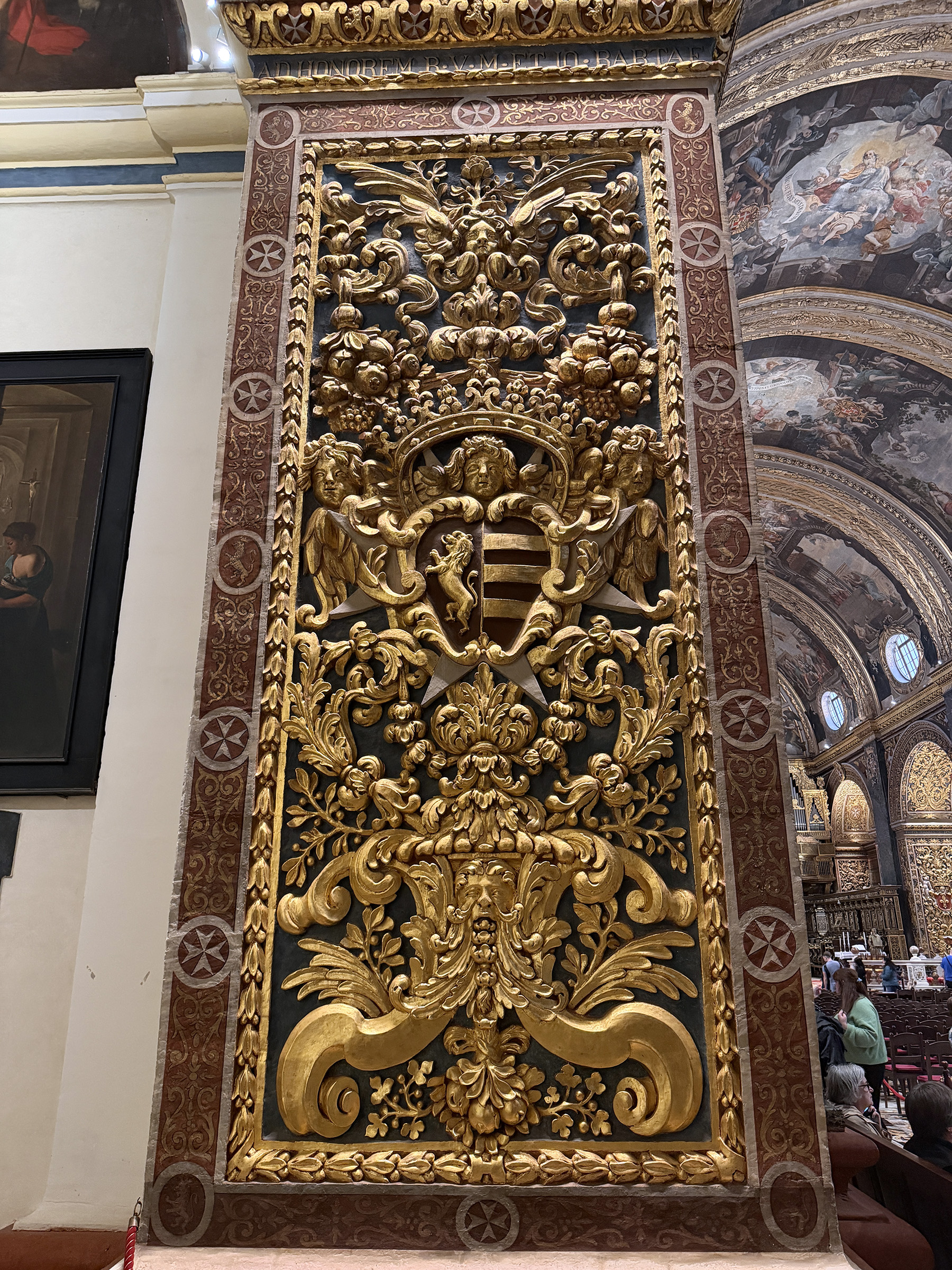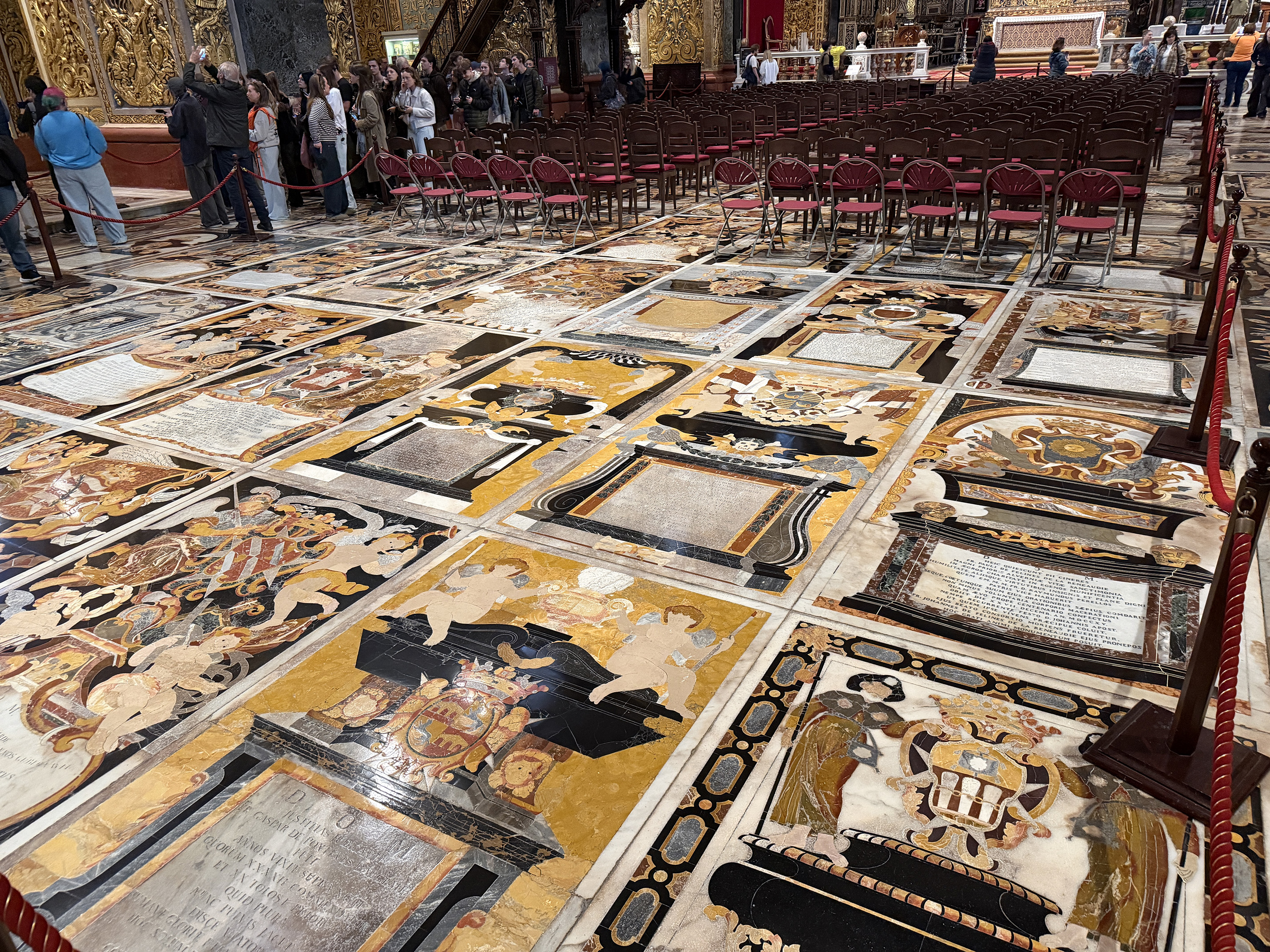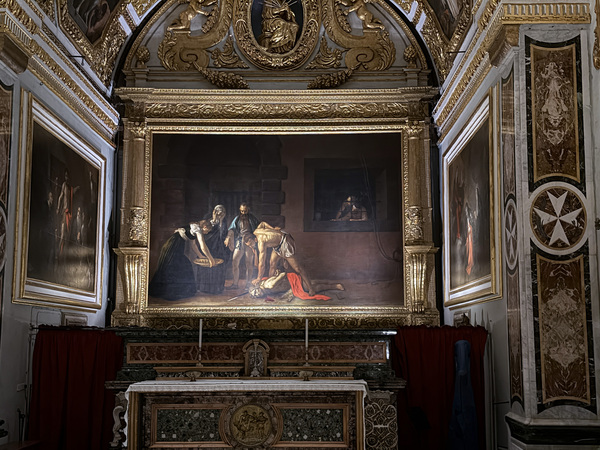 Our final visit was a lengthy one to St. John’s Co-Cathedral (Konkatidral ta’ San Ġwan), built by the Knights in 1577, soon after the Great Siege. The title "Co-Cathedral" indicates that the church shares the official seat (the cathedra) of the Archbishop of Malta with the older Cathedral of St. Paul in Mdina. This is a really spectacular cathedral, overwhelming with gilt decor (12 kg of gold), numerous artworks, statues, dramatic deeply carved bas-reliefs, and gorgeous inlaid marble floors. It amazes me that images on those floors can withstand all the foot traffic. A highlight is two large Caravaggio paintings from 1608: The Beheading of St. John the Baptist and St. Jerome Writing. The former work is the only one the artist ever signed. Caravaggio (Michelangelo Merisi da Caravaggio) was running away from a murder rap and Papal death sentence when he took up this work in exchange for a knighthood. There are dozens of other beautiful paintings on the walls and ceilings, but not by him.
