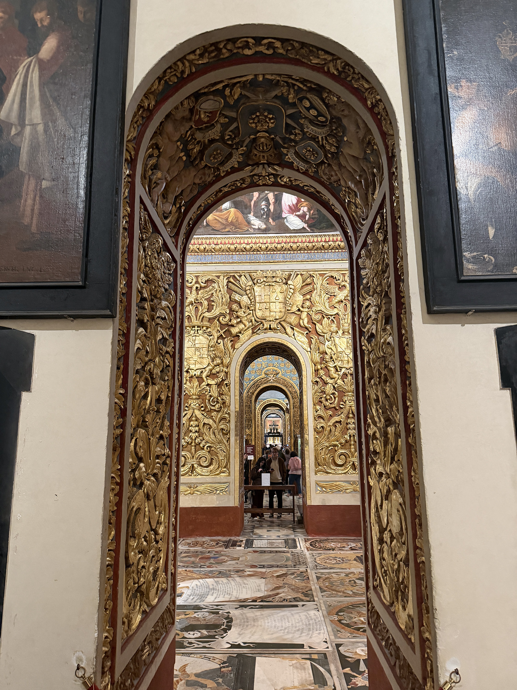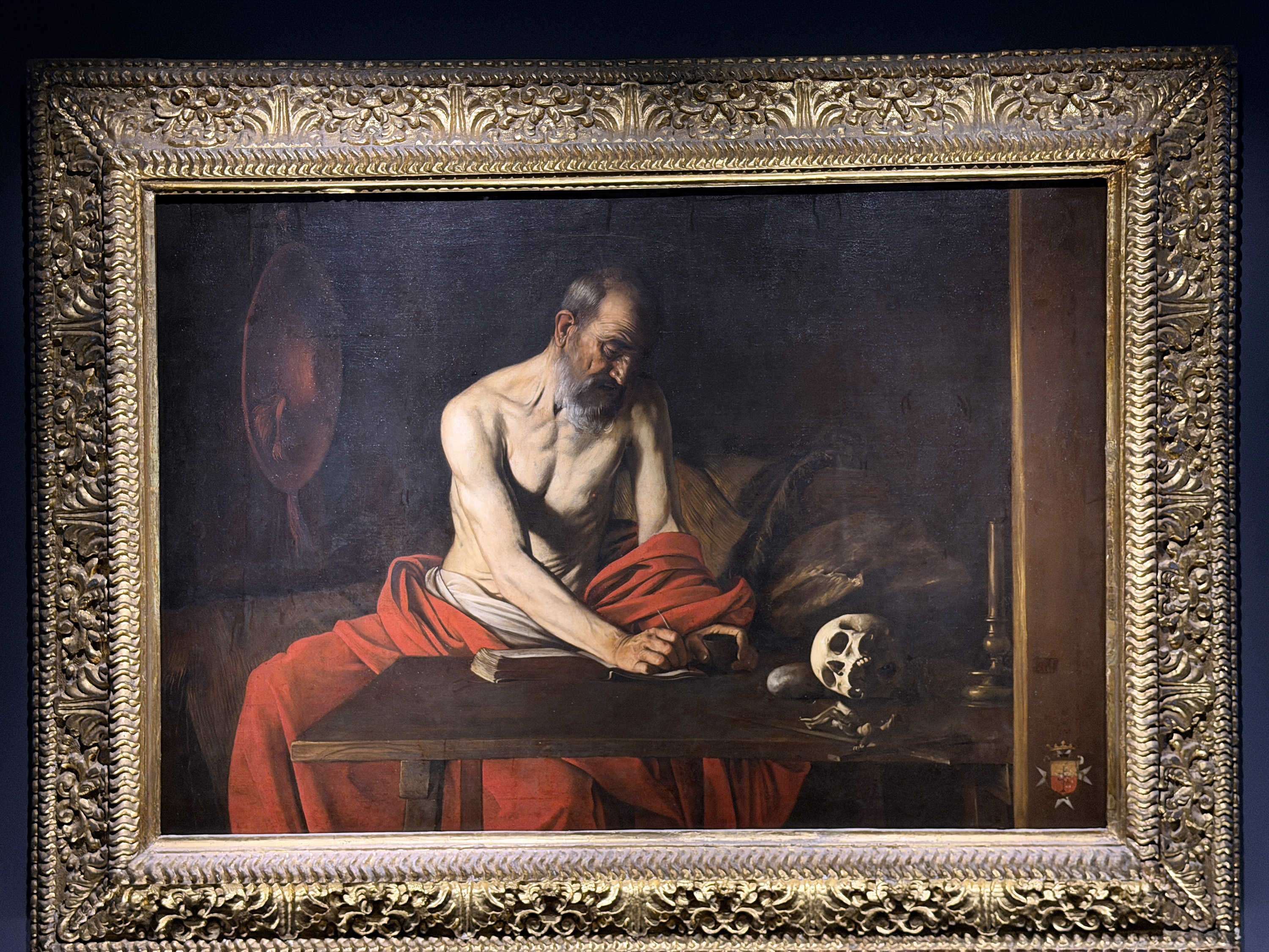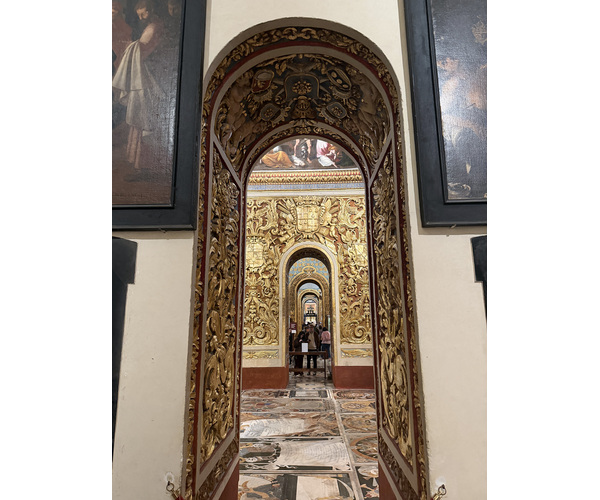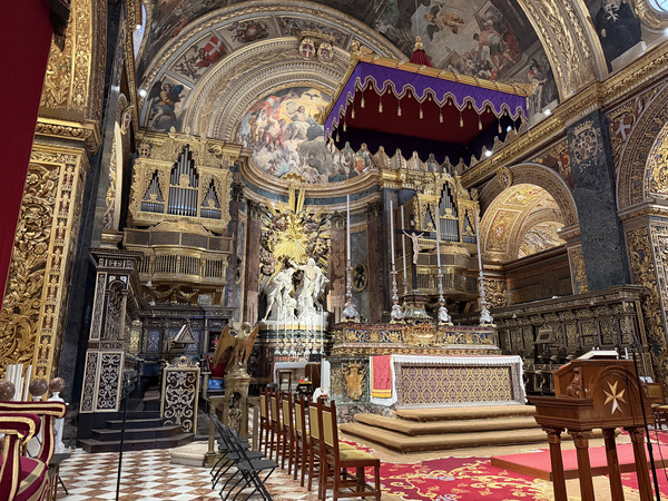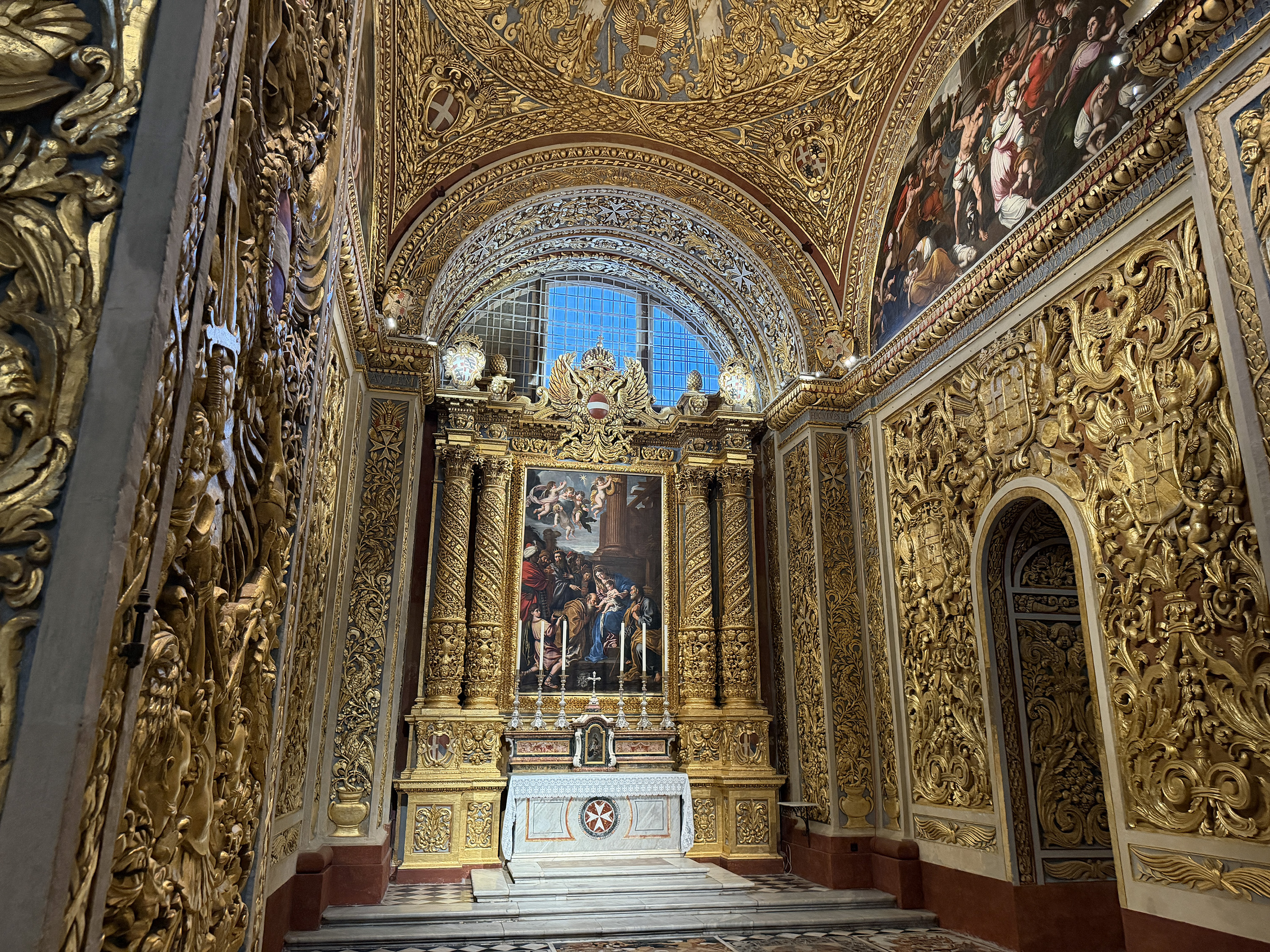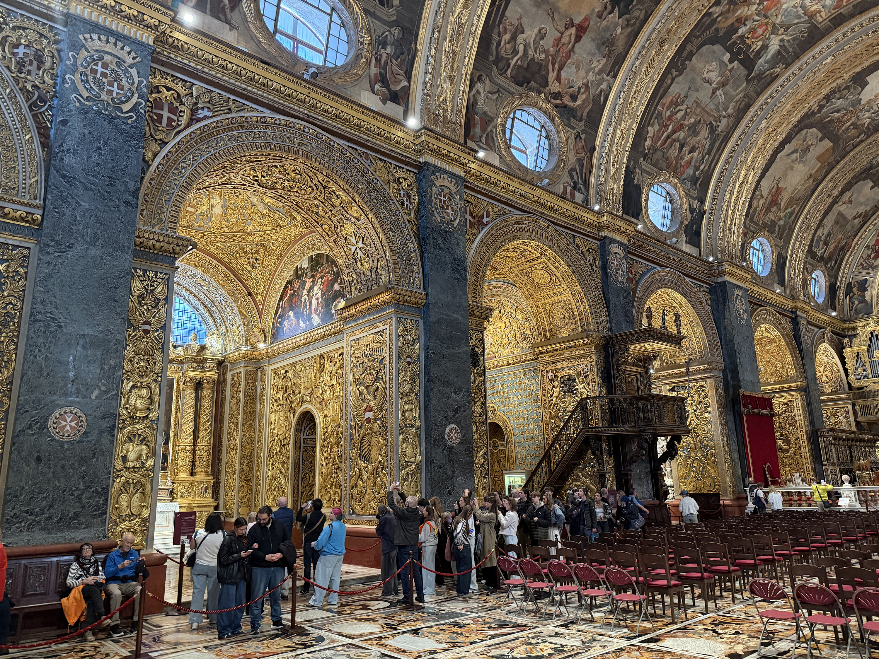 Our final visit was a lengthy one to St. John’s Co-Cathedral (Konkatidral ta’ San Ġwan), built by the Knights in 1577, soon after the Great Siege. The title "Co-Cathedral" indicates that the church shares the official seat (the cathedra) of the Archbishop of Malta with the older Cathedral of St. Paul in Mdina. This is a really spectacular cathedral, overwhelming with gilt decor (12 kg of gold), numerous artworks, statues, dramatic deeply carved bas-reliefs, and gorgeous inlaid marble floors. It amazes me that images on those floors can withstand all the foot traffic. A highlight is two large Caravaggio paintings from 1608: The Beheading of St. John the Baptist and St. Jerome Writing. The former work is the only one the artist ever signed. Caravaggio (Michelangelo Merisi da Caravaggio) was running away from a murder rap and Papal death sentence when he took up this work in exchange for a knighthood. There are dozens of other beautiful paintings on the walls and ceilings, but not by him.