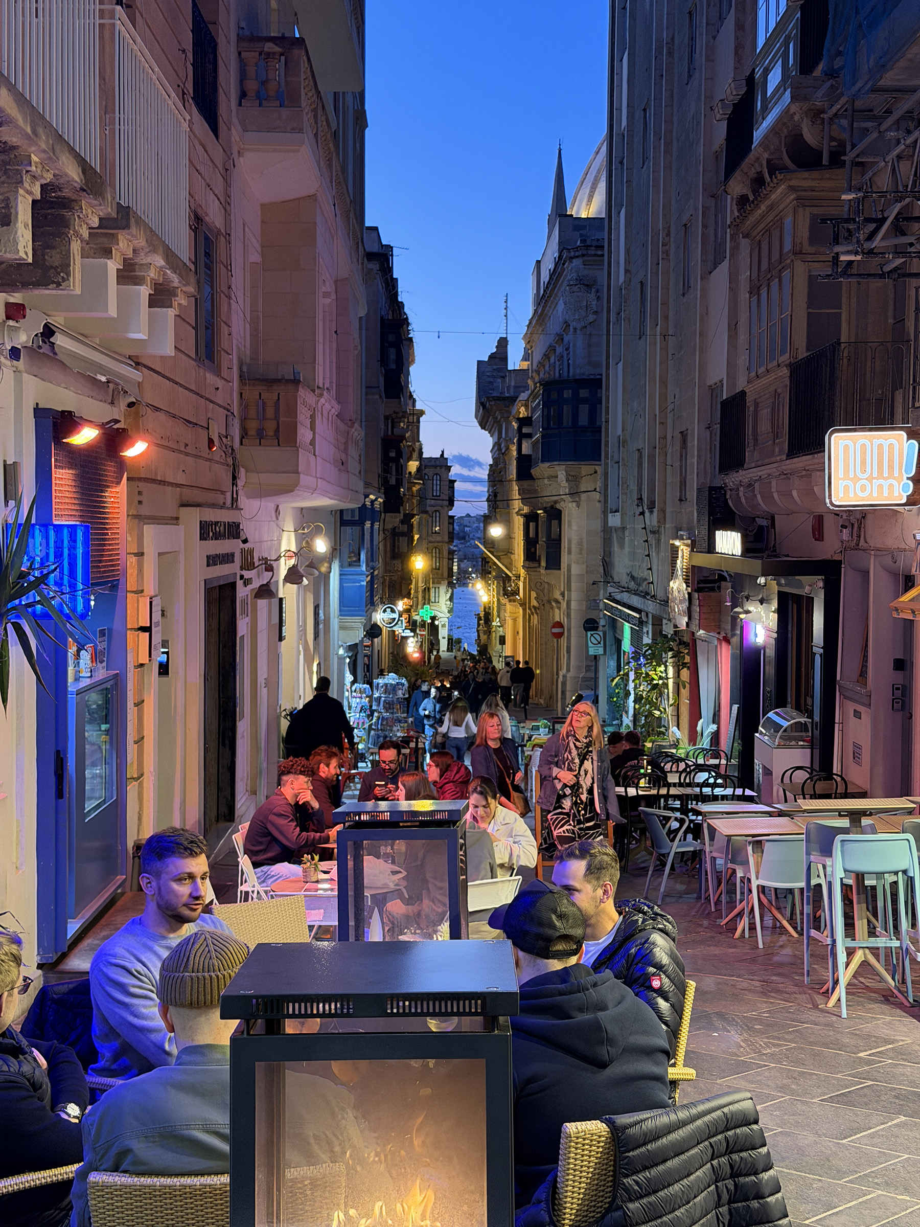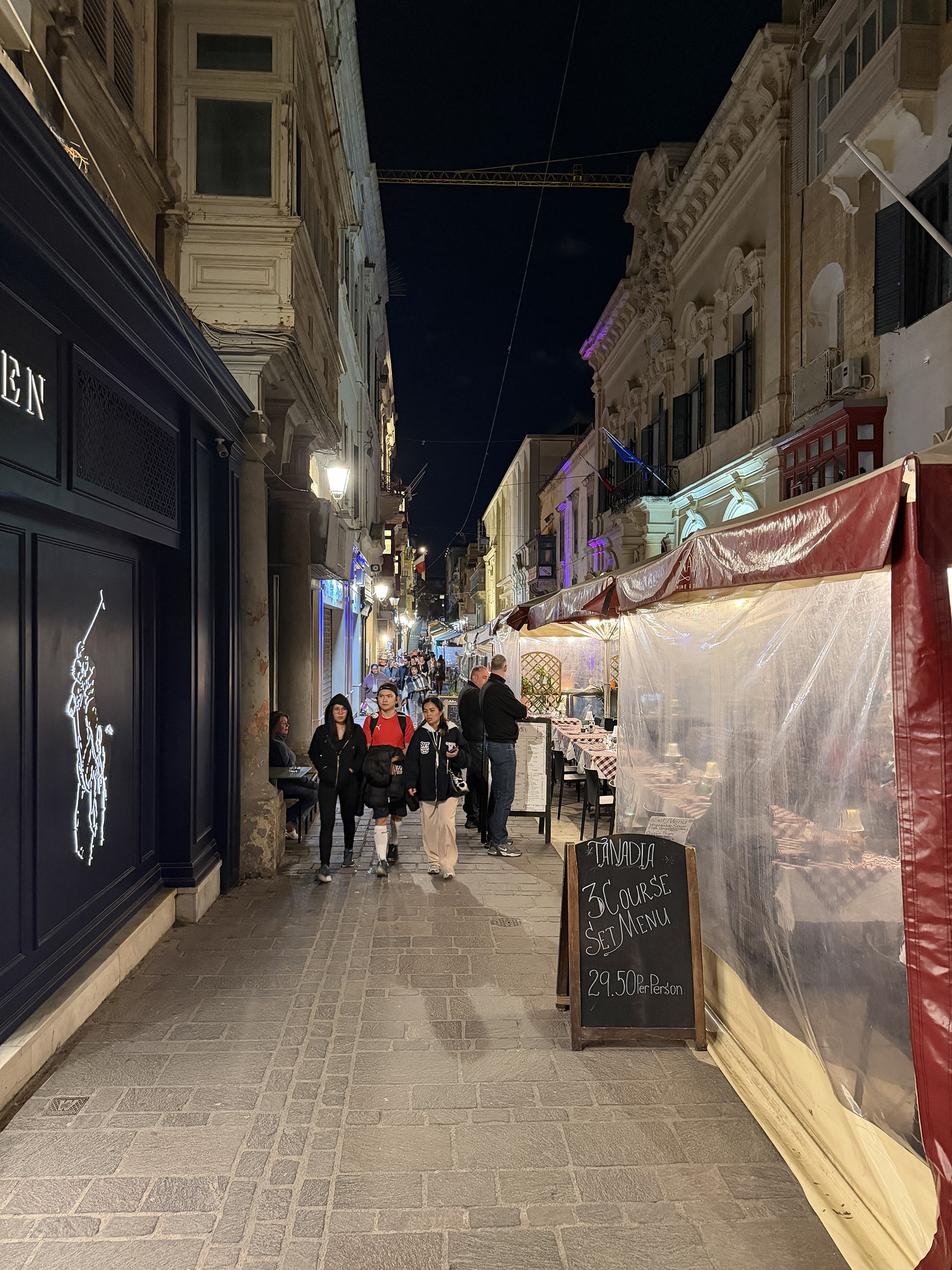 I checked in to a downtown hotel, the Embassy Valletta, which was nice, but I overlooked the problem of it being on a narrow alley, not a street, and my Uber dumped me a few hilly blocks away with two large suitcases to maneuver. And the hotel is fully booked for the next day. I had a good pizza dinner and a nice walk around the vibrant city. Quite touristy with a zillion outdoor restaurants. It is interesting to observe that 50% of the city was destroyed by German bombing during the war, but they have rebuilt it in a manner that you would never be able to tell. It still looks very medieval.