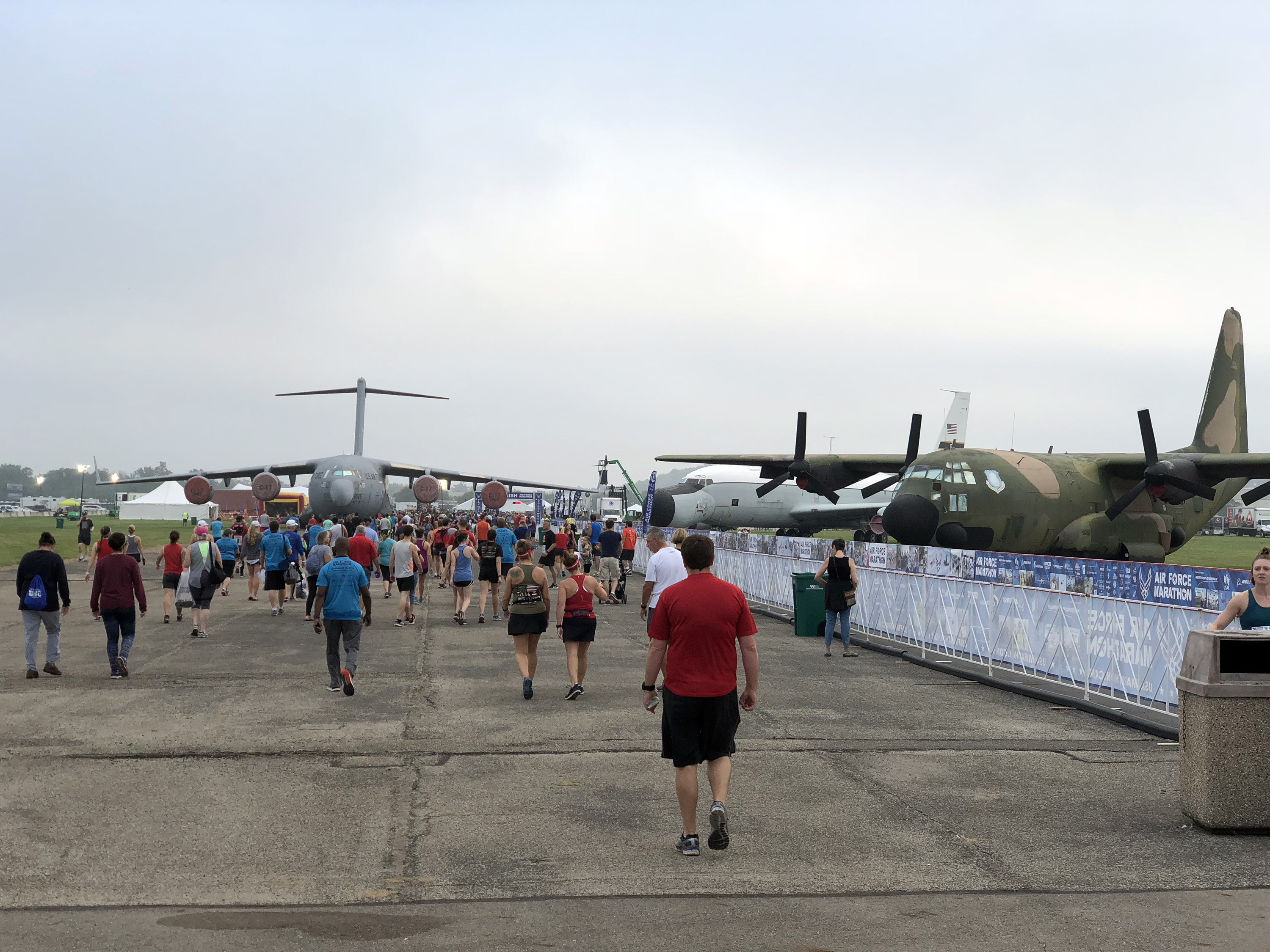 Race Day. I was very concerned about getting to the race with a minimum of inconvenience for Nancy. The organizers offered a shuttle bus from near the hotel, but the last one left at 6 AM, which is way too early for an 8:30 AM start. They recommended arrival 90 to 120 minutes before our race, which seemed excessive, but it actually turned out that 90 minutes was on point. The parking area was well over a mile from the starting line near the museum. Nancy stayed with the car because the exits were closed until 8:30, the start time for the half; the full was at 7:30, 10K at 8:00. The morning started out with heavy low overcast and cool temperatures, absolutely perfect running weather. There were ceremonial overflights of a giant C-17 Globemaster III, but they were invisible because of the weather. There was also supposed to be a dramatic parachute team drop, but it was canceled. Nancy revisited the museum (open at 9 AM) while I ran.