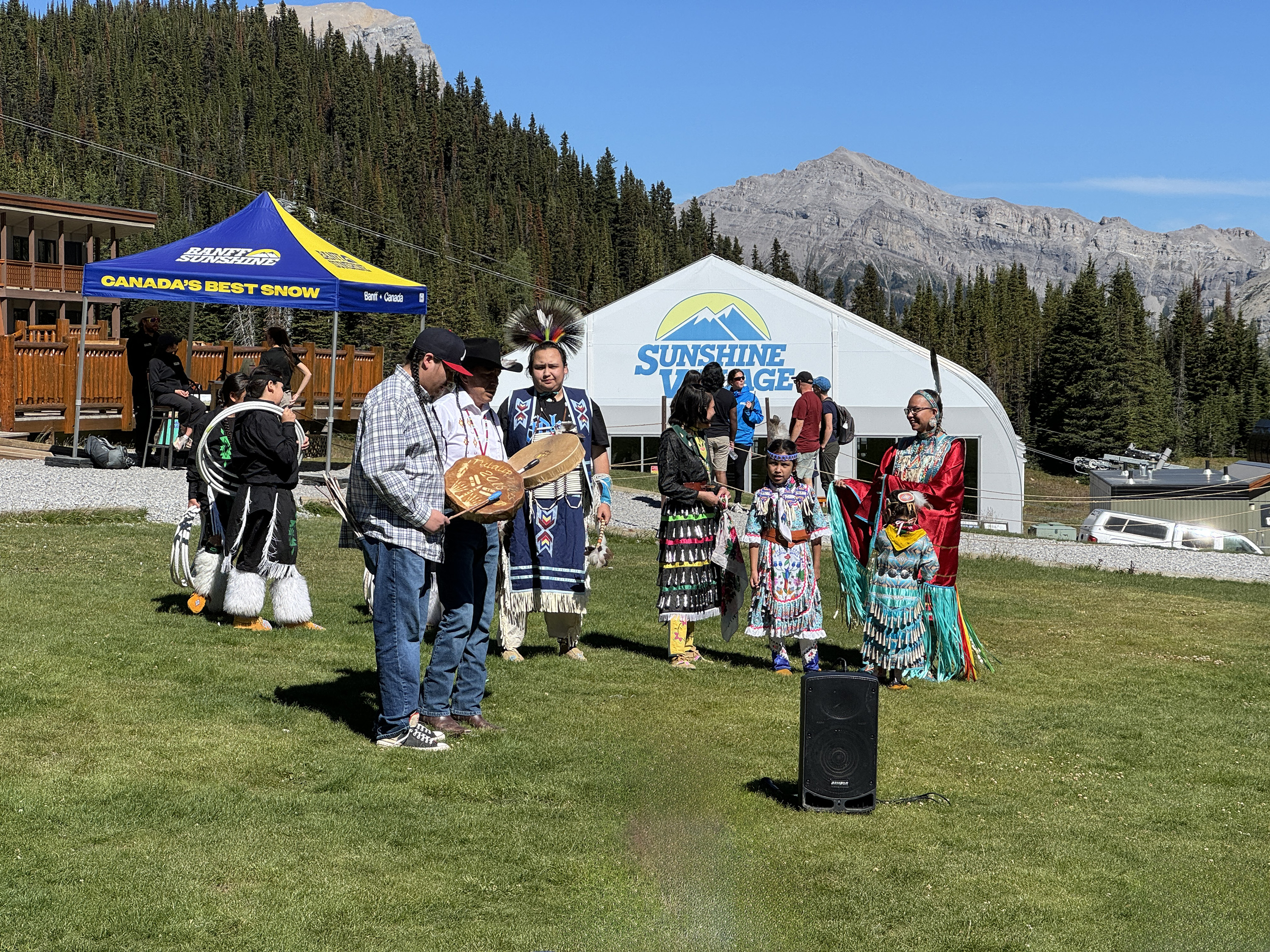 Most of the group took a 2.5 km hike back down to the gondola station, but I decided to rest my Achilles and we took the chair lift down. Good decision—the walkers took over a hour and arrived exhausted and sunburned. Lunch was at a nice pub called Mad Trapper’s at the gondola station with picnic tables in the sunshine and a lady singer/guitarist. I had the quintessential Canadian dish: poutine with Montreal smoked meat! The portion was enough for a lumberjack. Our experience was enhanced by numerous adorable Columbian Ground Squirrels racing around under the tables. Afterward we watched a local Indian tribe performing some dances.