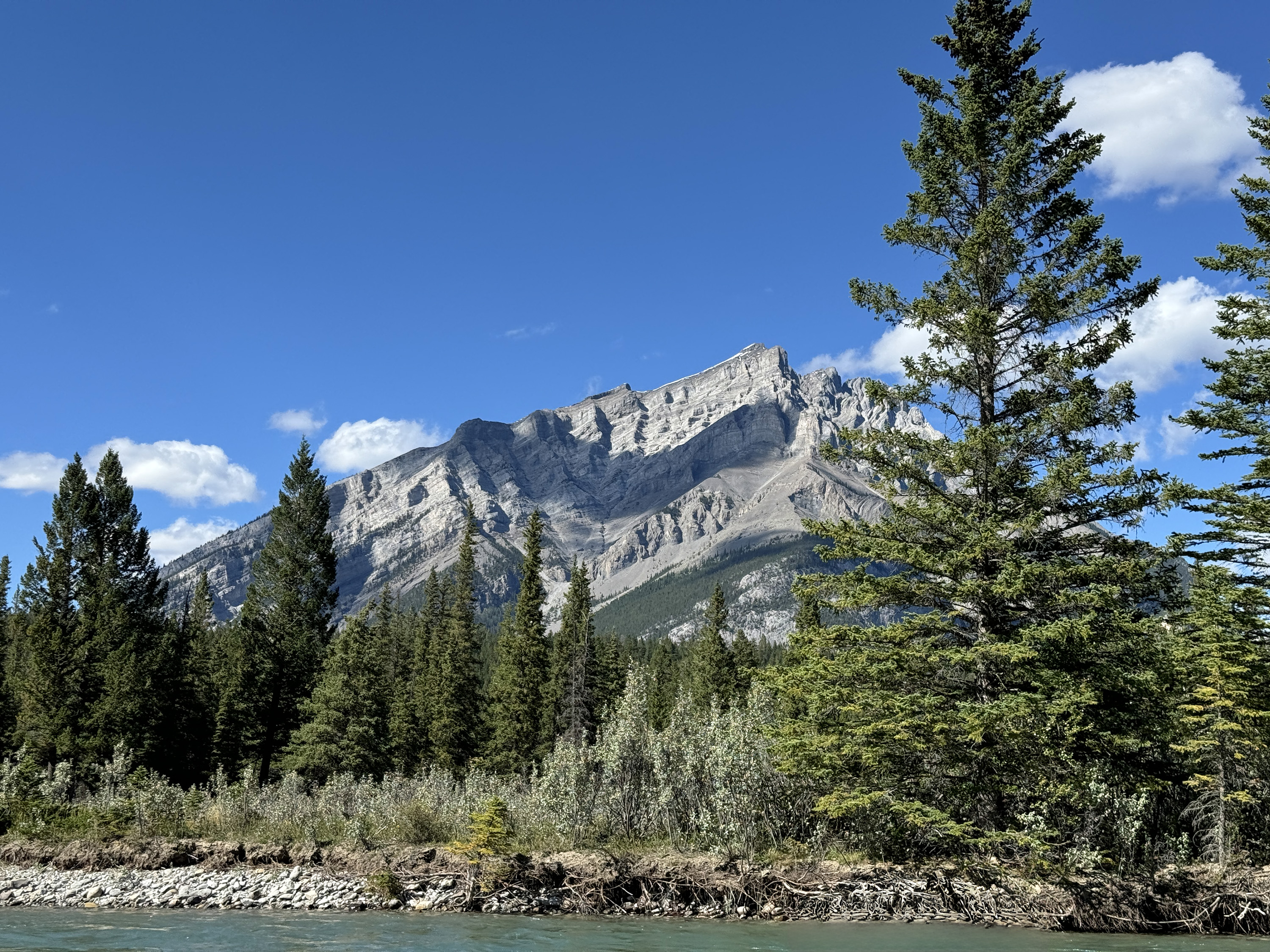 Back in Banff, we stopped at Bow Falls, a modest affair, maybe 30 feet high. Marilyn Monroe went over these falls in the 1954 movie River of No Return, doing her own stunts for multiple takes. Then we took an hour long 5-mile rafting trip down the Bow River. The inflatable raft was a big one with room for 25 people. The river was mostly calm—only about two feet deep—and the scenery moderately interesting. The best part was the colorful guy who steered and oared the raft. Fifty years of experience on the river and a winter job doing long rafting expeditions in India.