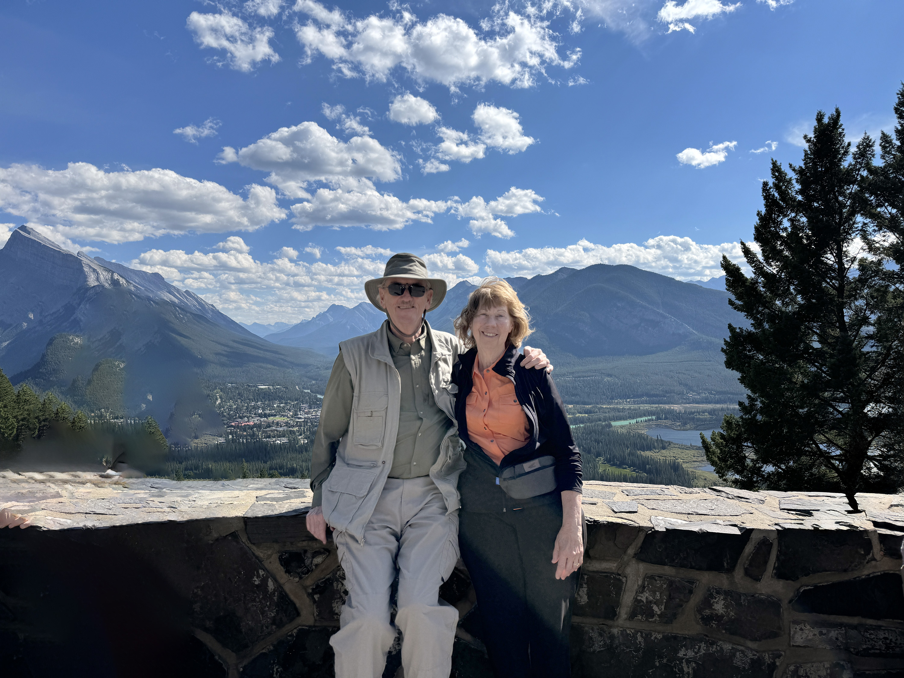 Today was not as originally planned. We were supposed to be in the town of Jasper, but wildfires there a month ago destroyed a lot of the town. So a few weeks ago Smithsonian emailed us with a choice: cancel for a full refund or accept an itinerary adjustment to spend an extra day in Banff. Six people chose the former. Our extra day started with a visit to nearby Sunshine Village ski resort, which features the largest alpine meadow in Canada. We took 8-person gondolas on a 20-minute ride up to 7082 feet, then a chair lift and brief hike to a stunning lookout over a broad mountain panorama with two pretty lakes. Absolutely beautiful weather. No bears in our path, although Darcie was armed with bear spray. We took a big group photo that Allen ensured included rocks and Nancy and I tried out an automatic selfie camera.