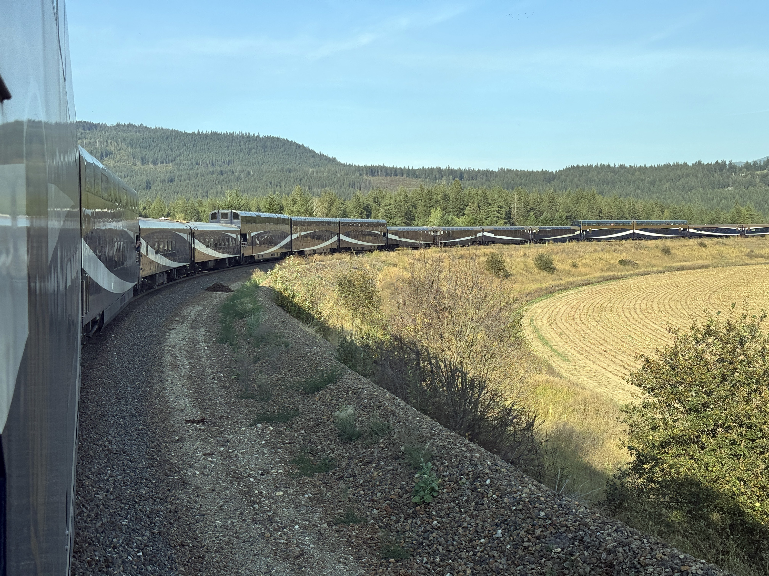 We reached Kamloops about 8 p.m., about 280 miles from Banff. According to Google Maps, driving from Banff would take about six hours versus our twelve. The city is much larger than I imagined, about 100K, spread out over a wide area. Our hotel is the Delta by Marriott, which is modest but modern and comfortable. Our bags were already in our room and they will be picked up there tomorrow morning. This company is super organized; they handed out our room keys on the train, sorted by seat number, so no lines were involved. We had enough food on the train such that we didn’t bother finding dinner. This was a good first day on the rails, although I’m disappointed at the variety of photos I was able to take through the train windows. Scenery always looks better in person than through a camera. We had been warned that there was no WiFi and that cell coverage would be poor, but it wasn’t too bad, particularly when we were close to towns or major highways.