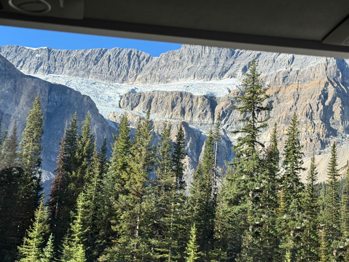 With an early start we drove through town and were stopped at a crossing as the Rocky Mountaineer departed. That should be our train on Wednesday. On the long ride north on highway 93, Darcie told us the history of Canada since 1867, prime minister by prime minister. After 90 minutes we reached Bow Lake for a rest stop and a view of a big glacier across the lake. This the source of the Bow River that we floated yesterday. Beautiful reflection. And we found a small beaver dam! We viewed many stunning mountains with small glaciers over the next hour on the bus.
