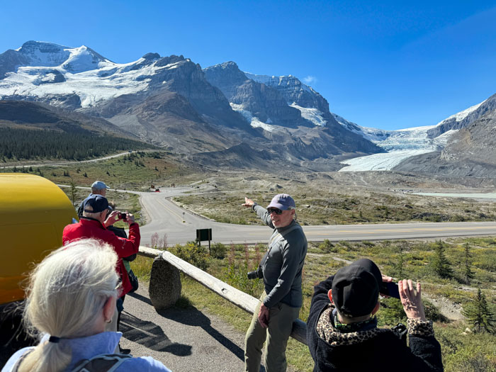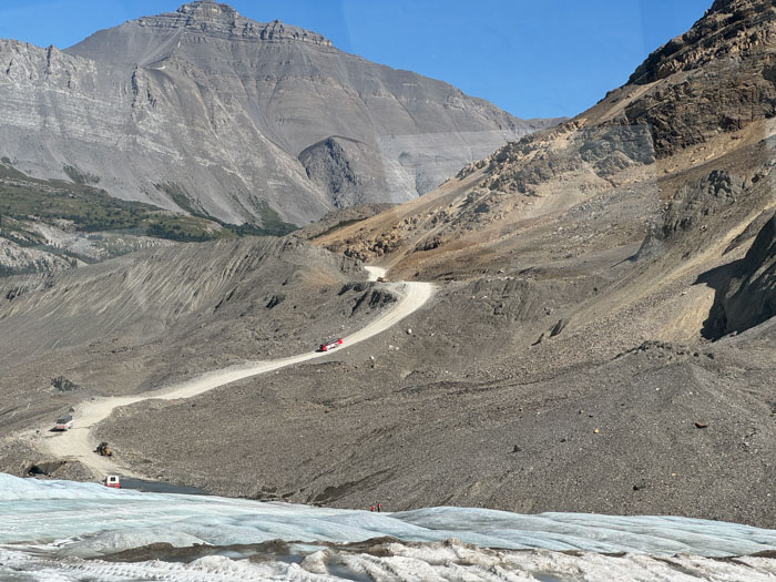 Following the recent forest fire, Jasper National Park is closed with the single exception of the Columbia Icefield, the biggest in the Rockies. After an hour and a without cellular coverage, it was nice to get some here, and WiFi too. There is a large lodge and visitor center where we had a buffet lunch. we got a great view of the Athabasca glacier and Snow Dome. (The latter is a three-way continental divide, the point where a raindrop might eventually reach the Pacific, Arctic, or Atlantic Oceans.) We traveled up onto the Athabasca glacier in a special bus with six-wheel drive on huge wide tires and a Mercedes engine. There are 22 of them here and the only others in the world are two in Antarctica. They are designed to negotiate a 36° incline and we encountered one at 29°, the steepest commercial road in North America. That was down a lateral moraine, compensating for the reduction in glacier height since the ice age.