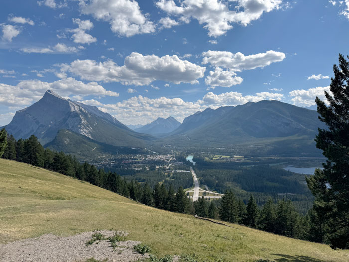 We lunched at a Mexican restaurant where I had a bison burrito. Then we rode on an Open Top bus (very similar in shape to the red bus in Glacier NP, but a modern vehicle, very comfortable) for a 90-minute tour around town. This tour is run by the Brewster company, descendent of the original Brewster brother guides famous in Banff history. Our guide/driver was dressed up in historic mountain attire and told us a variety of history info about the town and the national park. She started playing a Benny Goodman song (Stompin’ at the Savoy) and revealed that he visited here in the 30s, but he didn’t like train travel, so the town constructed a grass airfield just for his private plane! We drove near Cascade Mountain and saw a herd of elks munching along the road. Next was Sleeping Buffalo Mountain and Surprise Corner, which yielded a nice view of the Fairmont Banff Springs Hotel. Then we ascended a switchbacky road to the Mt Norquay lookout, where we admired the view of town and mountains and partook in some elderberry soda, served in champagne flutes.