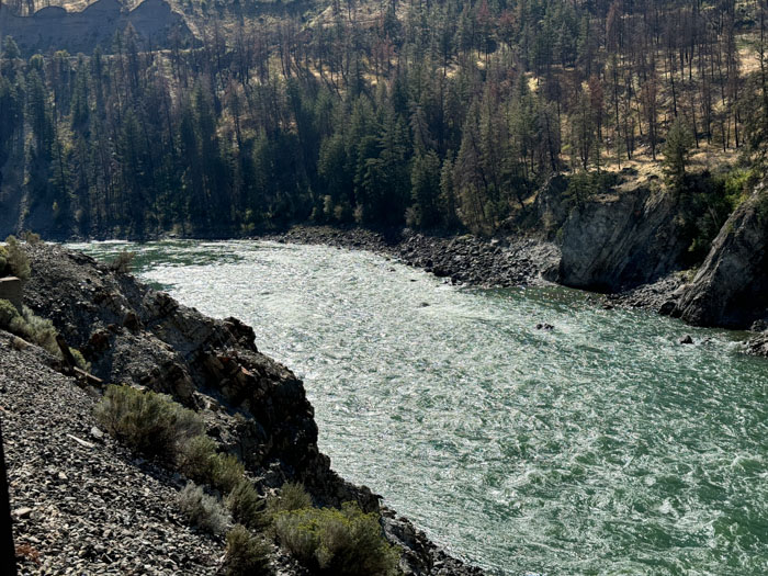 We were picked up from the hotel at 7:10 and the train left on its 250-mile journey at 7:55. Our second seating for breakfast was at 9:30, but while we waited we were served coffee, tea, and cranberry orange bread with a lemon drizzle. We started along the north shore of the very large Kamloops Lake, where we saw a bald eagle perched atop a tree. And a herd of bighorn sheep, but I wasn’t fast enough to get a photo of either. We followed the Thompson River, winding through relatively narrow, steep canyons. The terrain this morning is noticeably different than yesterday’s, quite arid. The Jaws of Death Gorge was dramatic with its narrow passage above river rapids. Rainbow Canyon offered spectacular views from the outside platform.