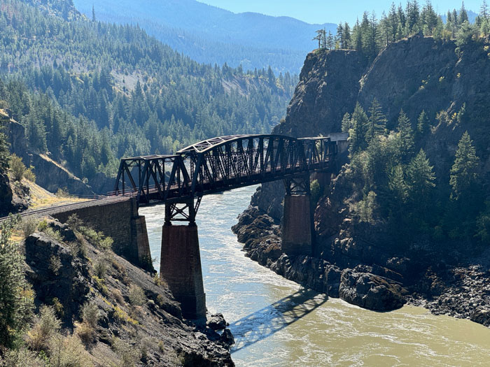 At the confluence of the Thompson and Fraser Rivers, near the town of Lytton, we saw the two rivers have different temperatures and amounts of sediment, and also that the terrain has changed again abruptly—trees are now covering the hills instead of desert conditions. Approaching Cisco Crossing, I got some really nice photos of the railroad bridges owned by competing companies amidst this different environment. We traveled through Hell’s Gate, narrowest point on the Fraser, popular for river rafting.