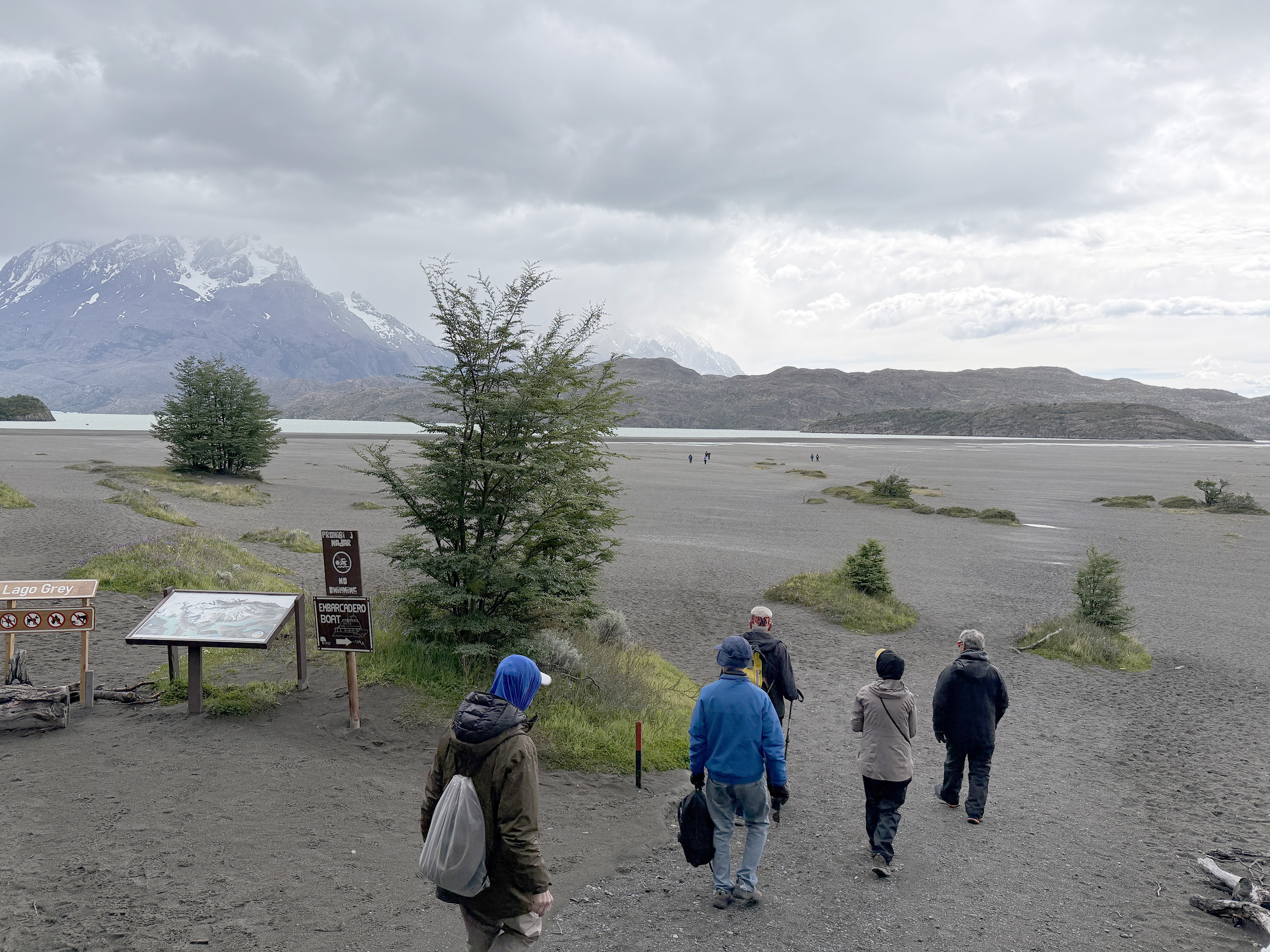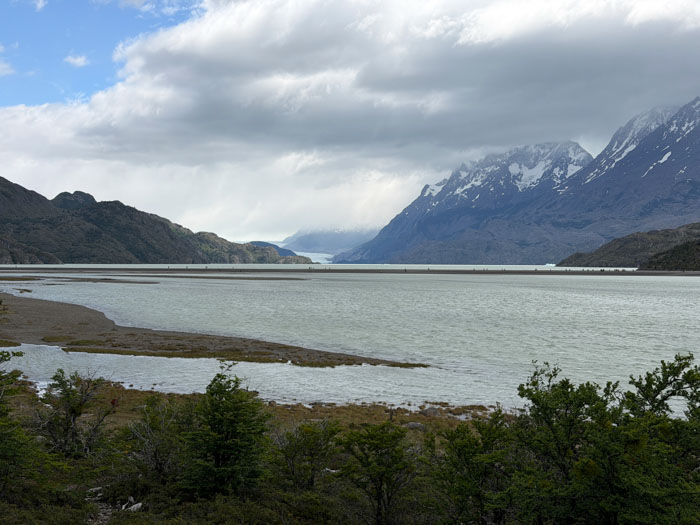 We started a walk scheduled for two hours. We passed a few orchids and other flowers and eventually reached Grey Lake, which was cut off at its southernmost end by a berm (not a terminal moraine, but probably wind generated); the southern portion below the berm was a dry and pebbly beach, somewhat like the shingle on Normandy beaches. We walked on this about a half mile in the cold, heavy winds and then Nancy and I bailed out, having been promised only a glimpse of a sliver of Grey Glacier ten miles away. We’re willing to endure discomfort on the way to something interesting, but this wasn’t that. So we returned to the cafeteria to relax with coffee and tea (and free trail mix from the hotel minibar).