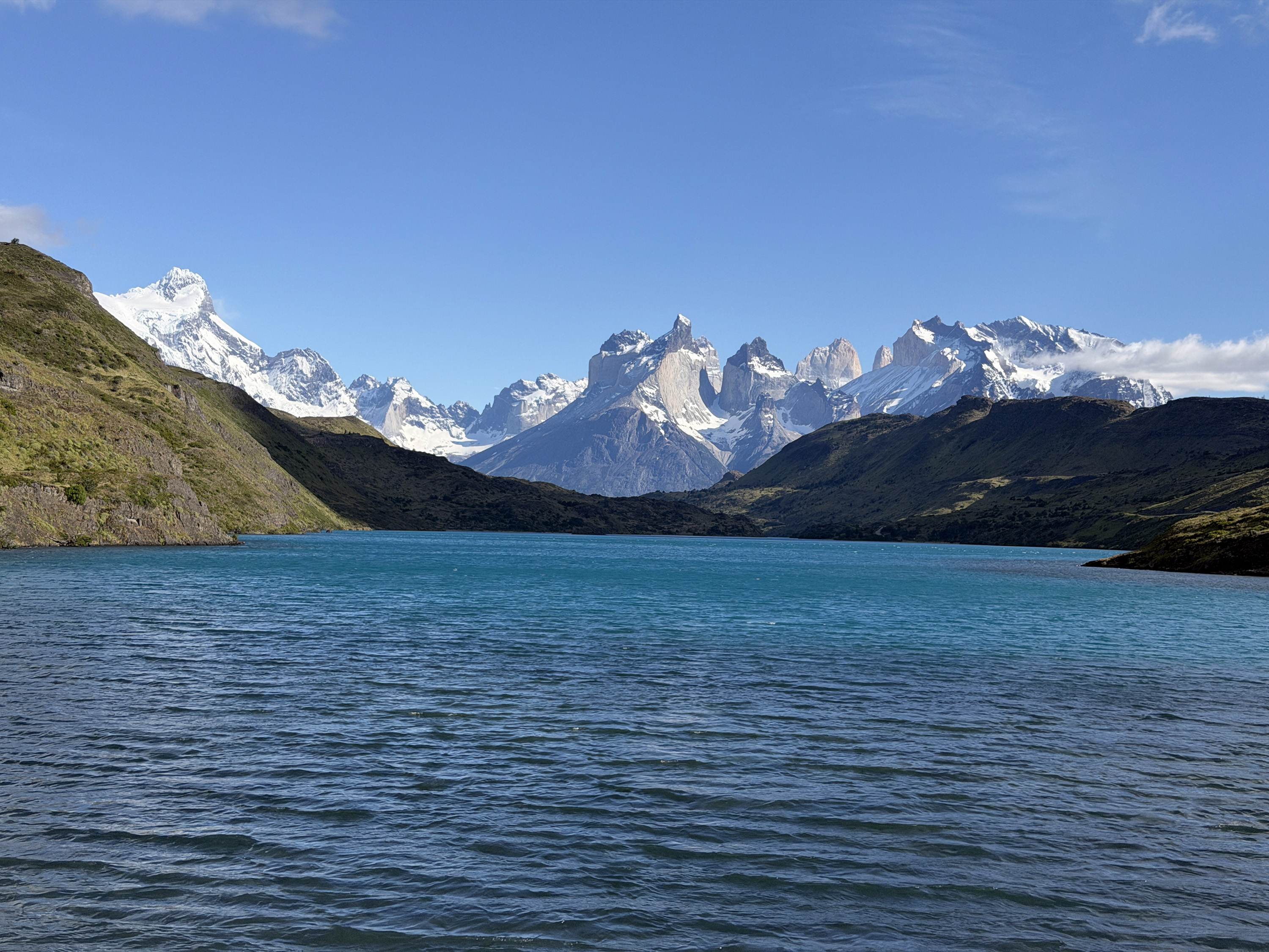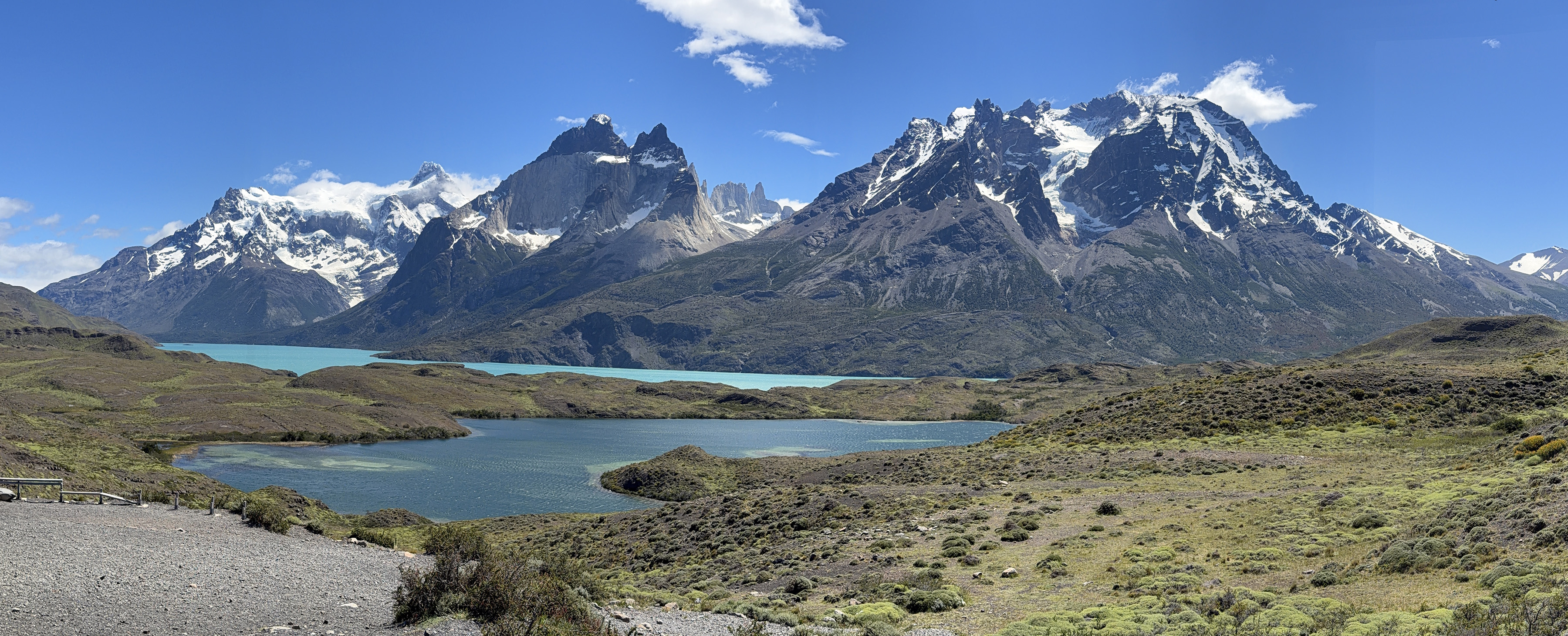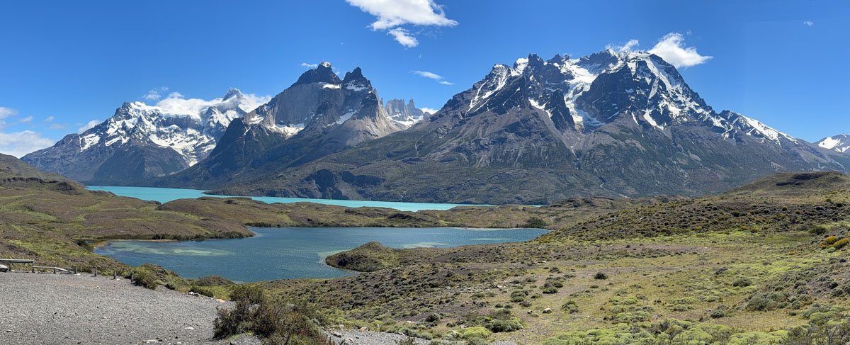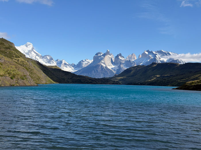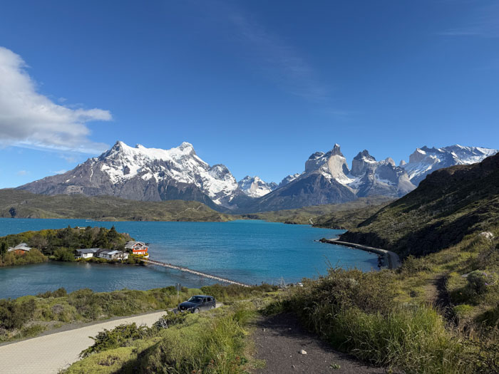 We stopped at a small café for a rest break and to eat bag lunches at picnic tables. Pretty good sandwiches. Then we drove around for well over an hour, first stopping at a lookout at Lago Nordenskjöld to view the pretty lake facing the giant Monte Almirante Nieto. The lakes here are a gorgeous blue color from the glacial flour. We stopped at Laguna Amarga for a view of the eponymous three towers, only two of which (Torres Monzino and Torres Central) are visible from our hotel. Our final stop was a place not designated as an official lookout, but behind some buildings, which Lu said is rarely visited. We got a great view across Lago Pehoé of the Cuernos (Horns) of the Massif.