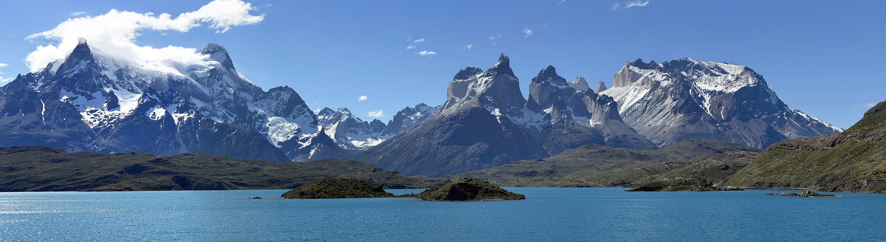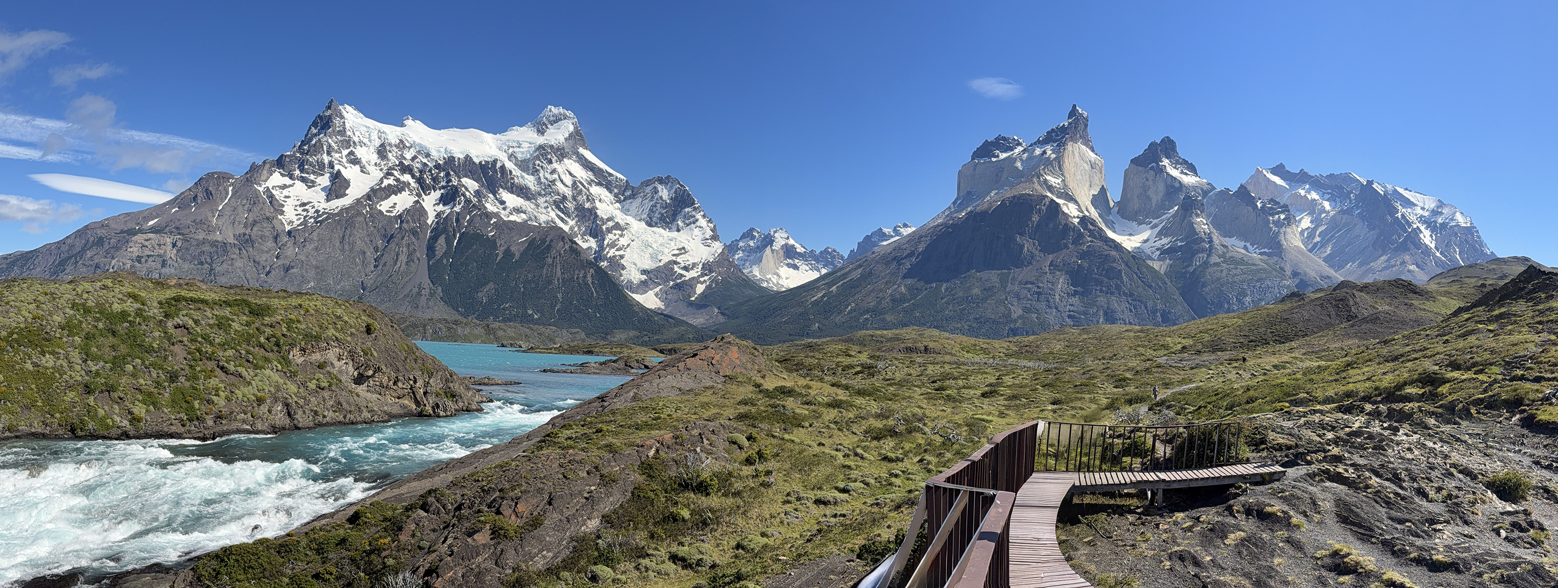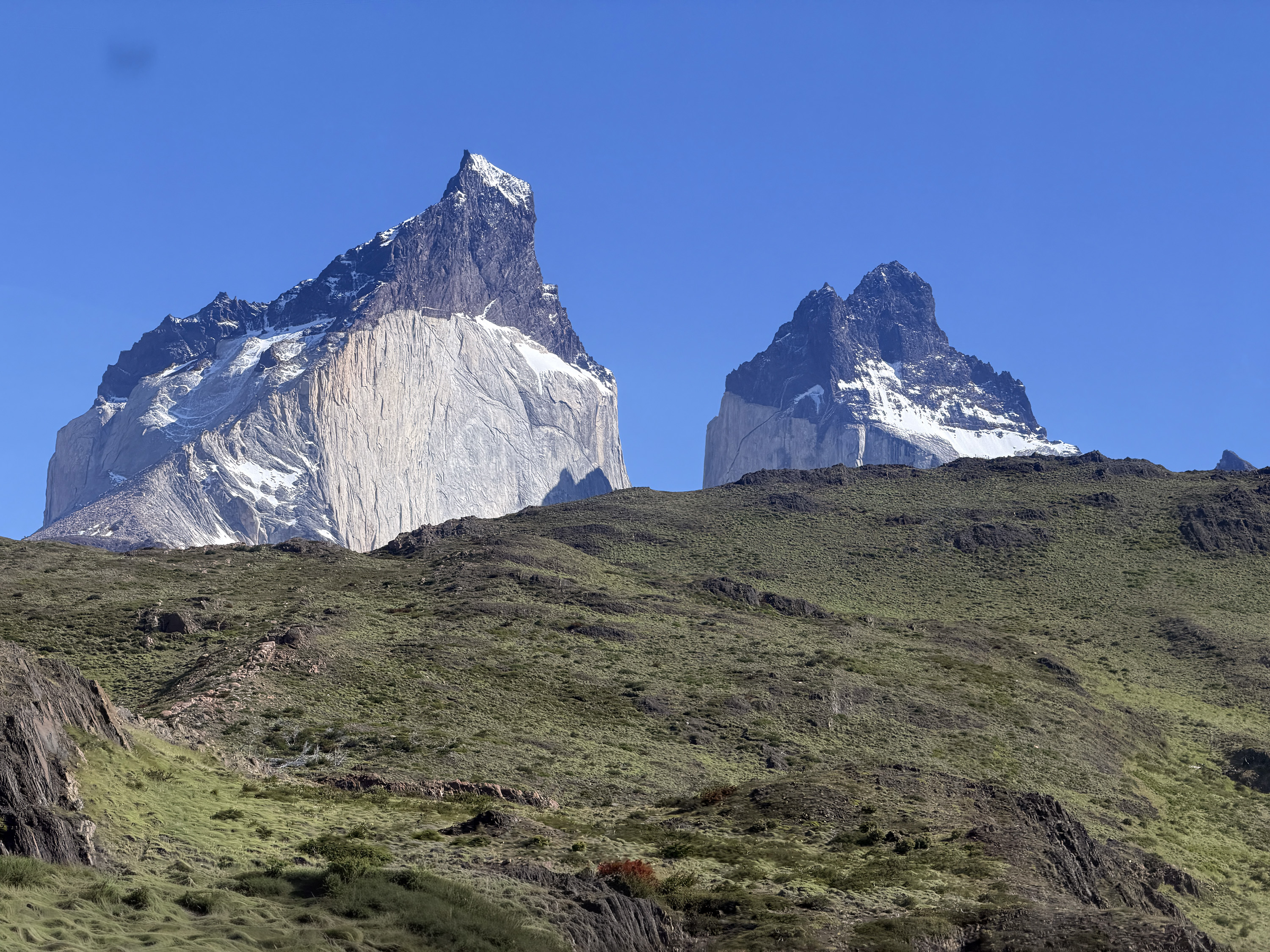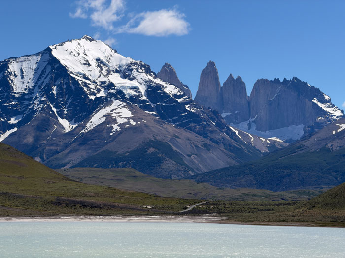 We stopped at a small café for a rest break and to eat bag lunches at picnic tables. Pretty good sandwiches. Then we drove around for well over an hour, first stopping at a lookout at Lago Nordenskjöld to view the pretty lake facing the giant Monte Almirante Nieto. The lakes here are a gorgeous blue color from the glacial flour. We stopped at Laguna Amarga for a view of the eponymous three towers, only two of which (Torres Monzino and Torres Central) are visible from our hotel. Our final stop was a place not designated as an official lookout, but behind some buildings, which Lu said is rarely visited. We got a great view across Lago Pehoé of the Cuernos (Horns) of the Massif.