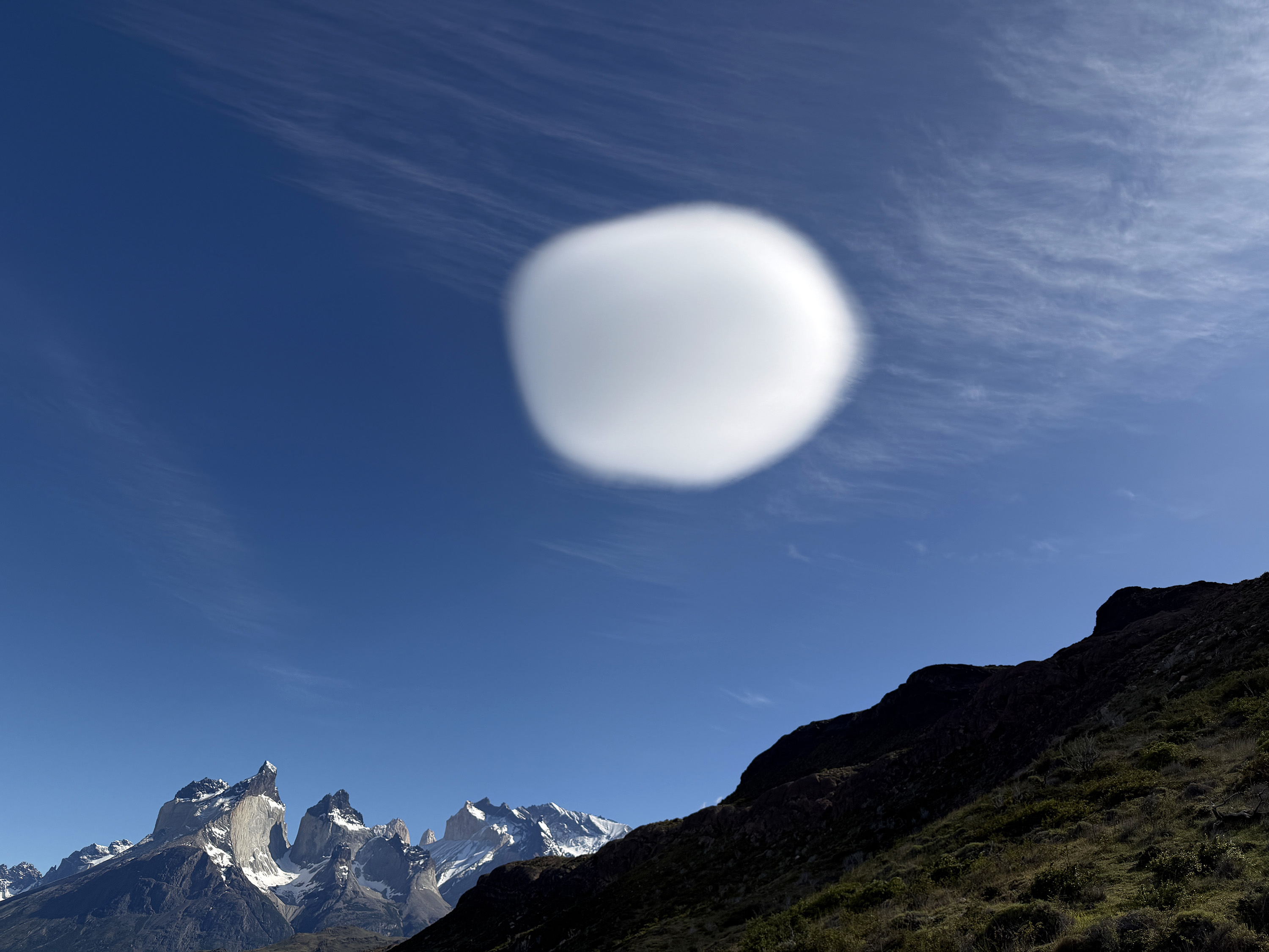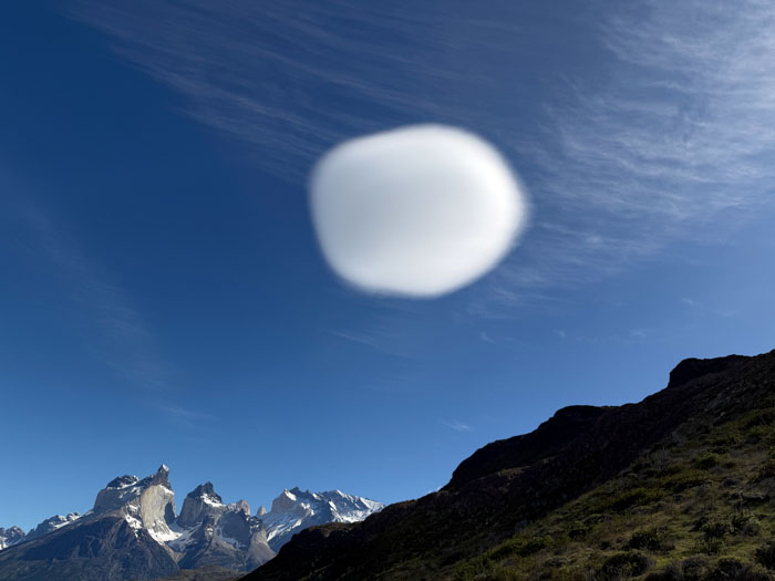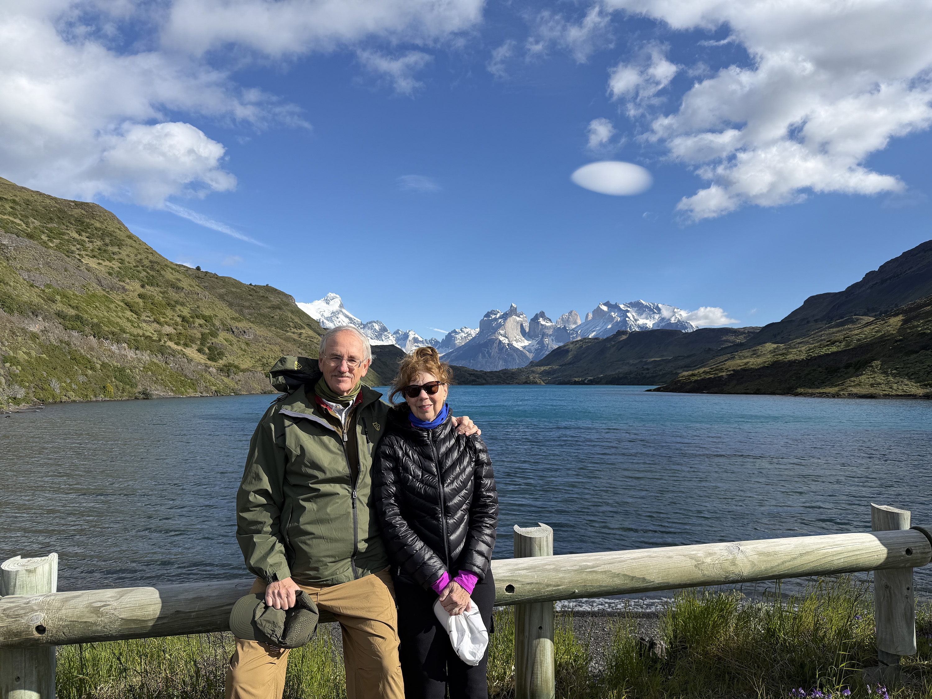 We drove into the park and stopped at Webber Bridge, where we enjoyed a nice view and took some group photos. But better views were to come. At Lago Pehoé, we had fantastic views of the towers and a gorgeous blue lake colored by glacial flour. We were intrigued by a perfectly round lenticular cloud that looked like an alien spacecraft hovering over us.