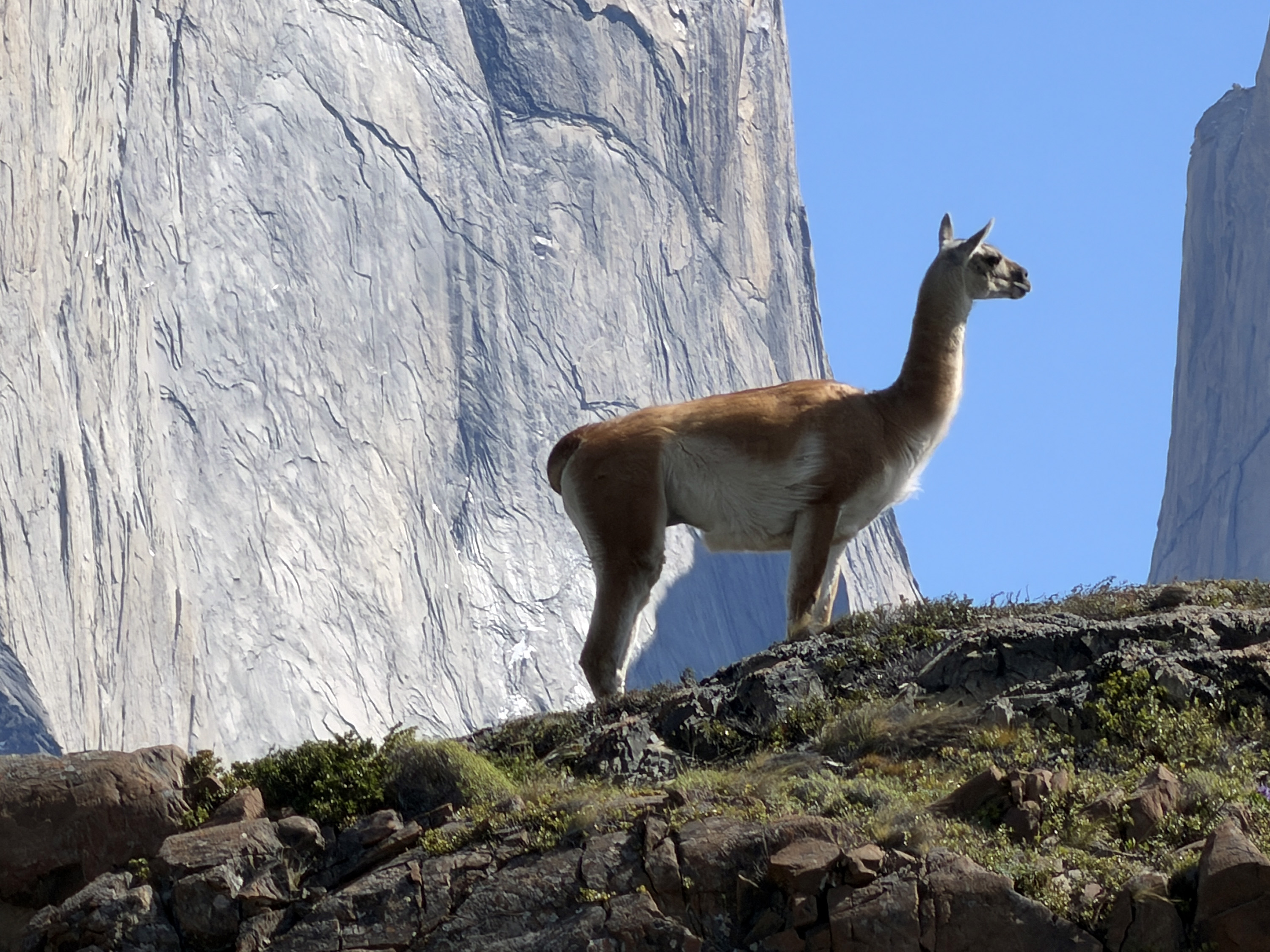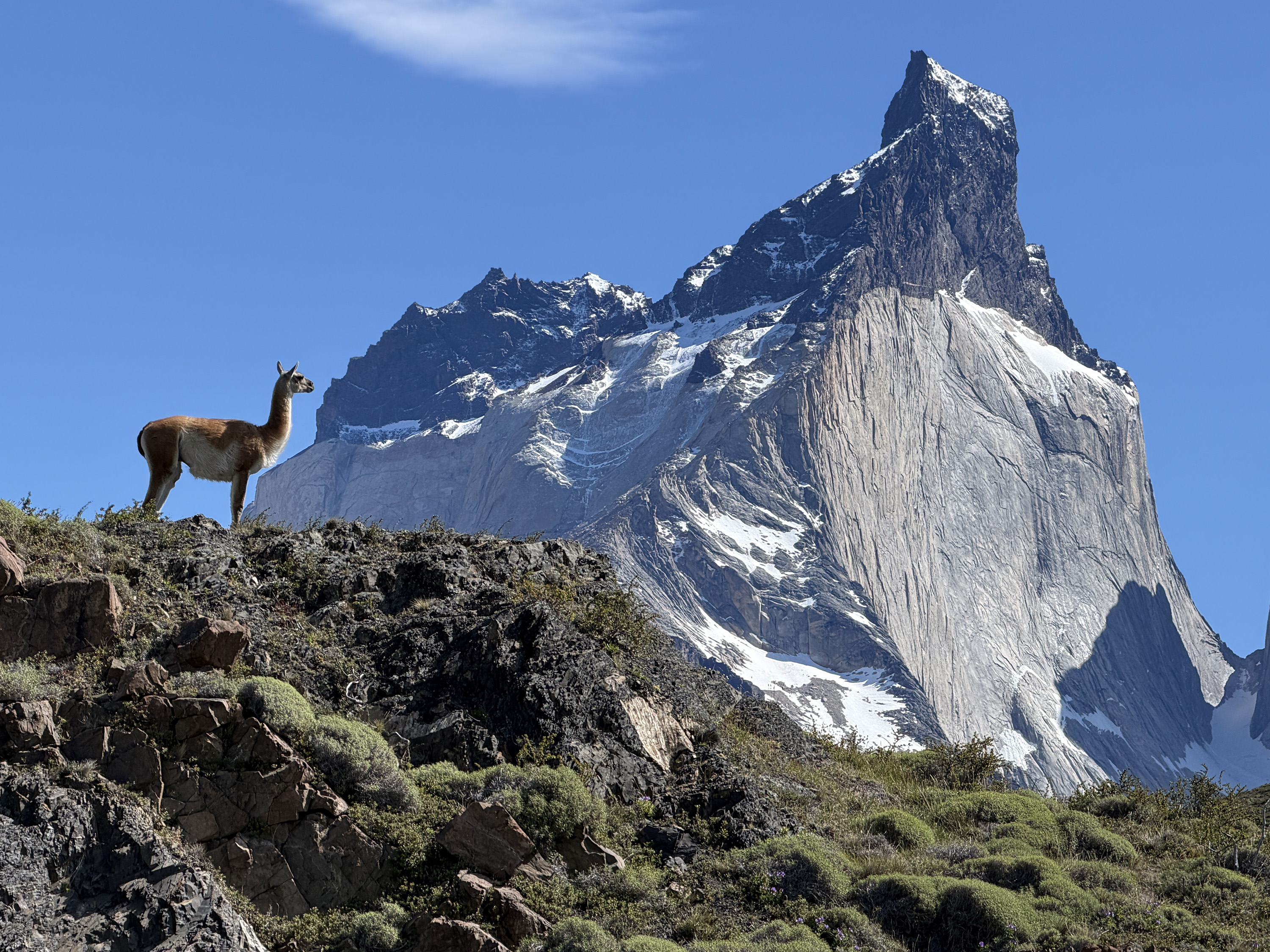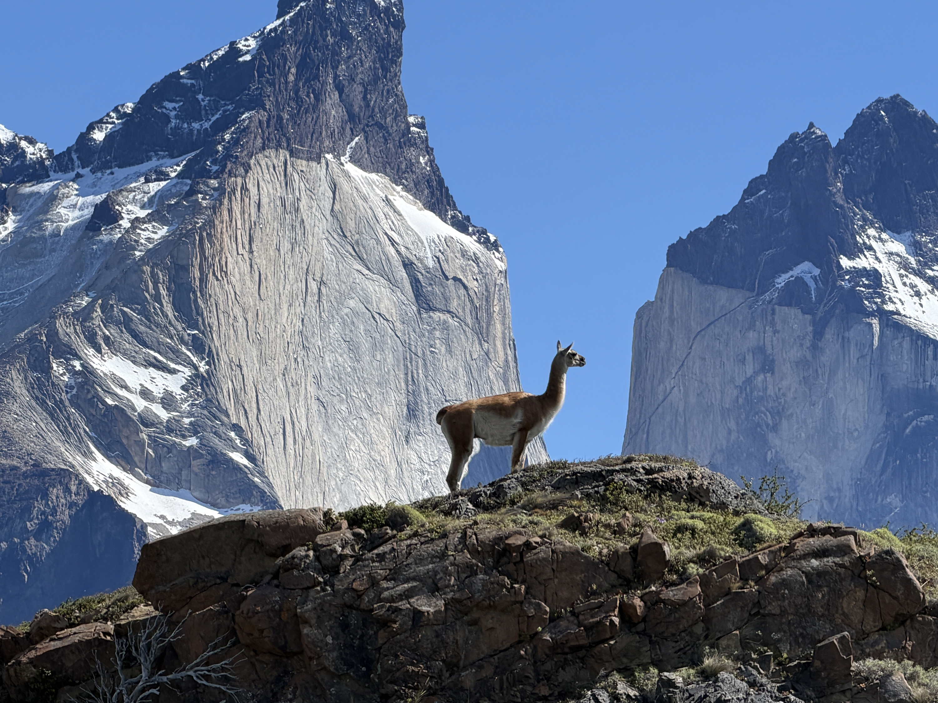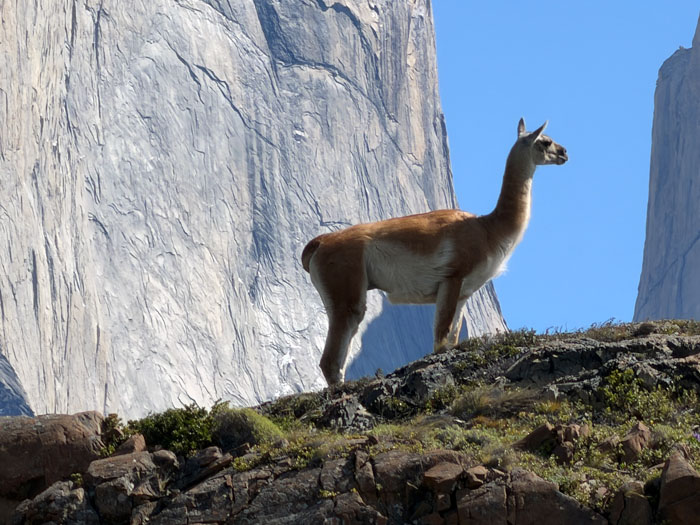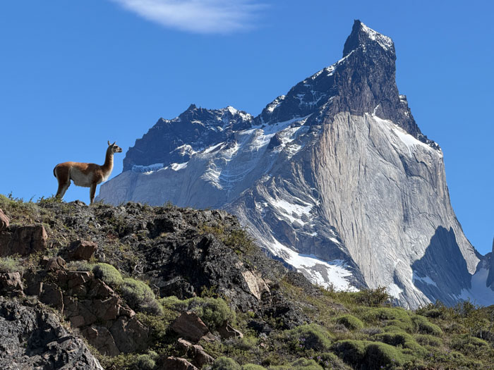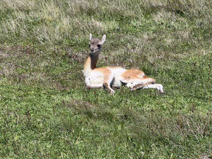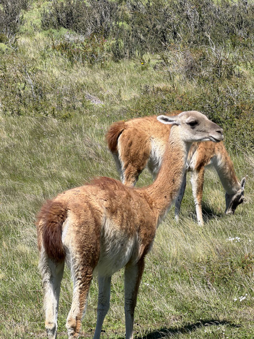 We started on a two-hour walk. After a half mile, we reached an overlook of the Salto Grande waterfall, quite vigorous. The views of Paine Grande (10,006 feet above sea level) and the towers (8–9,000) were spectacular. I walked another short distance and had fun watching a family of guanacos (a camelid related to the larger llama) prancing around. There was a mighty male standing guard on an outcropping above the herd, a sentry protecting his family. But Nancy decided she wanted to rest her previously broken leg, so we returned to the bus 90 minutes early. Another reason was the very strong, cold wind that made walking stressful. Most of the rest of the group managed to complete the full walk and came back rather tired out.