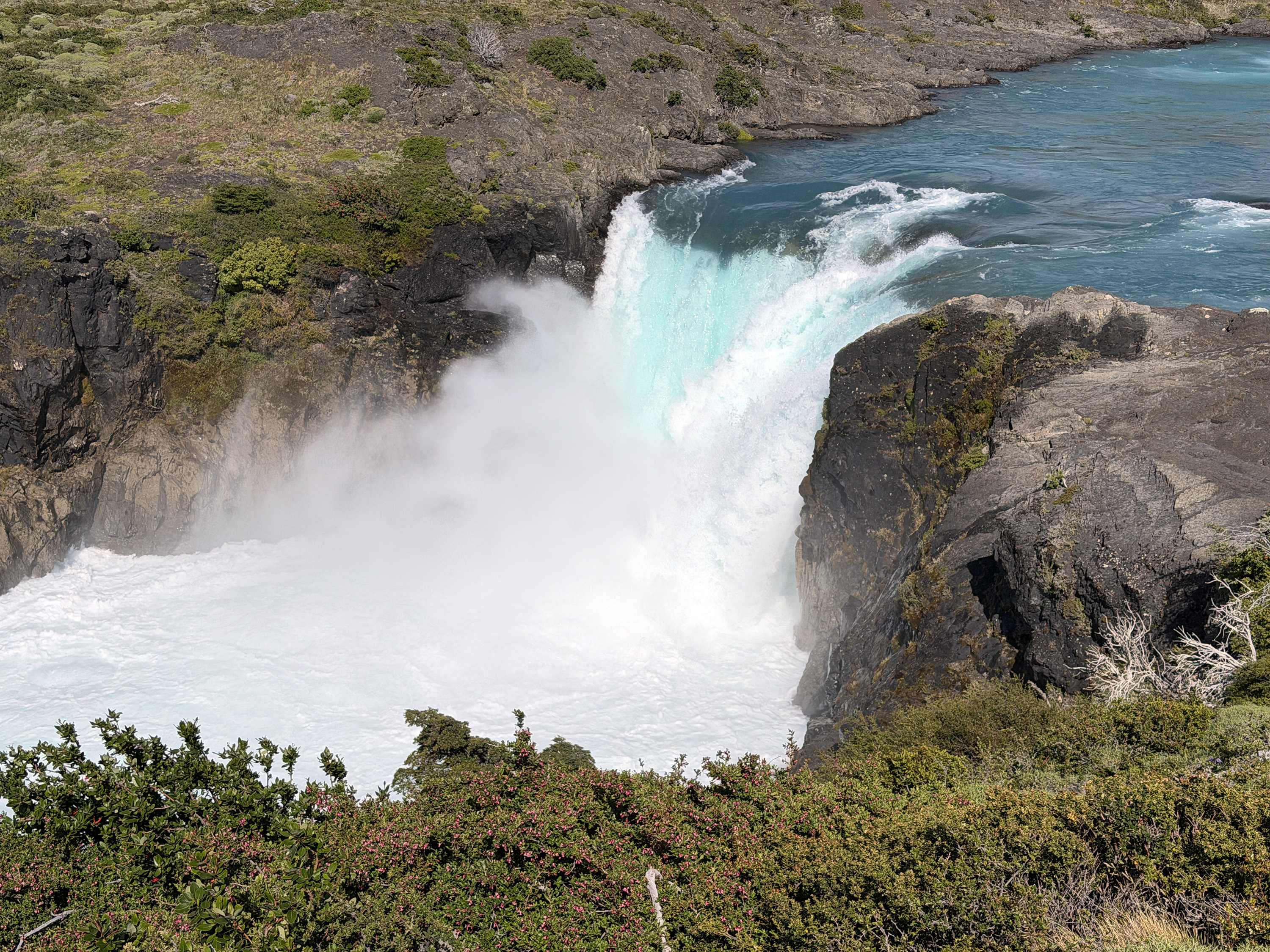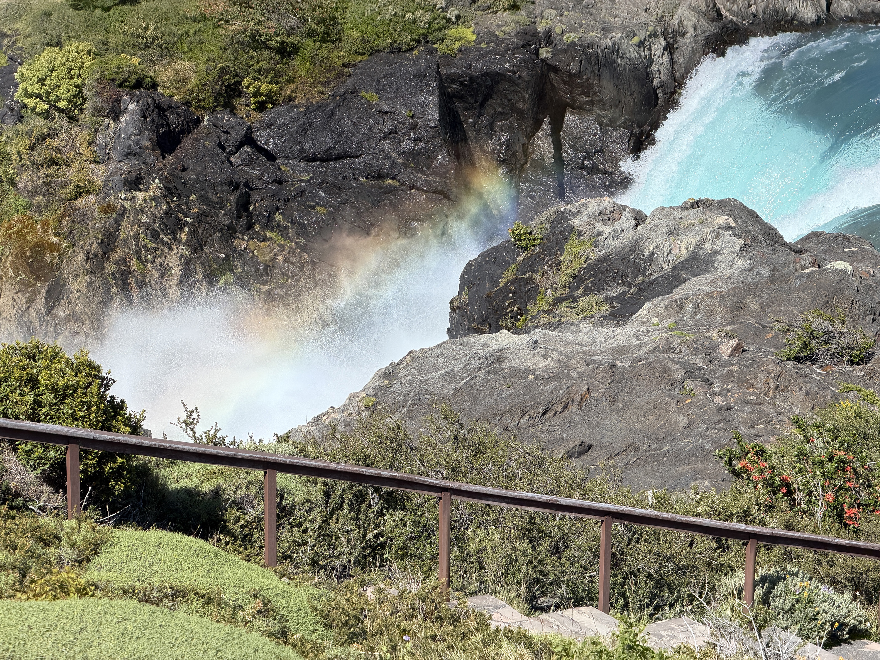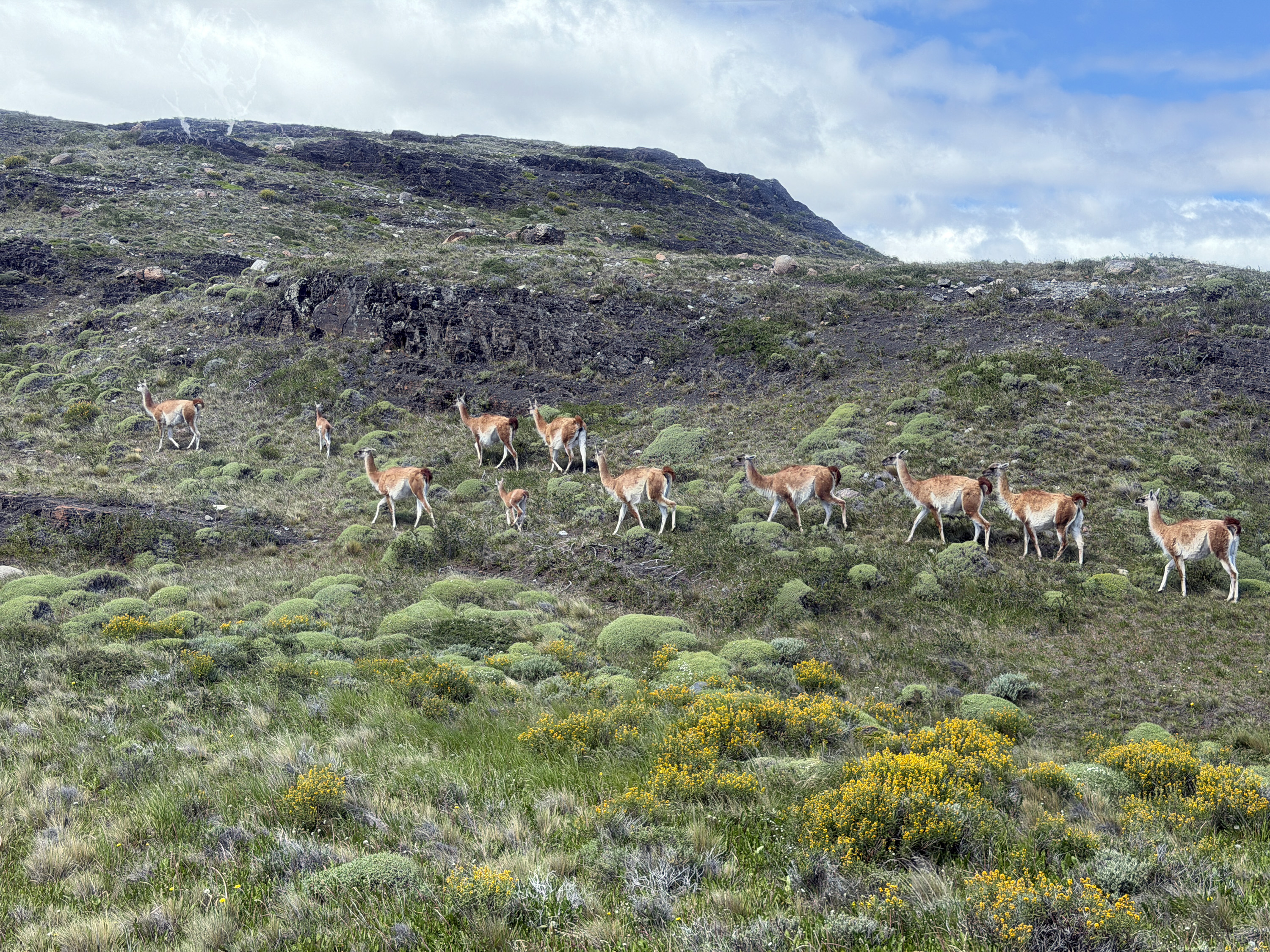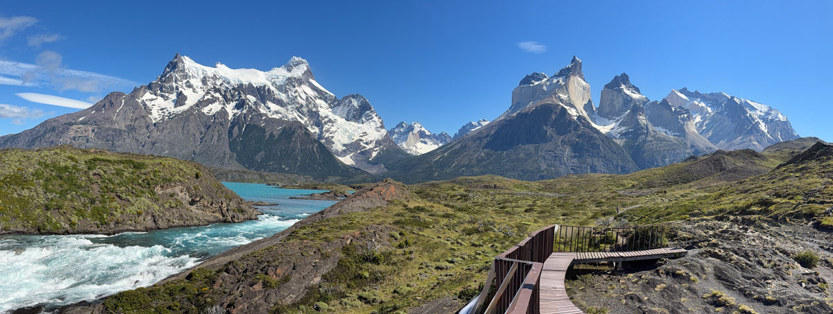 We started on a two-hour walk. After a half mile, we reached an overlook of the Salto Grande waterfall, quite vigorous. The views of Paine Grande (10,006 feet above sea level) and the towers (8–9,000) were spectacular. I walked another short distance and had fun watching a family of guanacos (a camelid related to the larger llama) prancing around. There was a mighty male standing guard on an outcropping above the herd, a sentry protecting his family. But Nancy decided she wanted to rest her previously broken leg, so we returned to the bus 90 minutes early. Another reason was the very strong, cold wind that made walking stressful. Most of the rest of the group managed to complete the full walk and came back rather tired out.