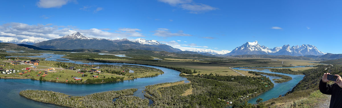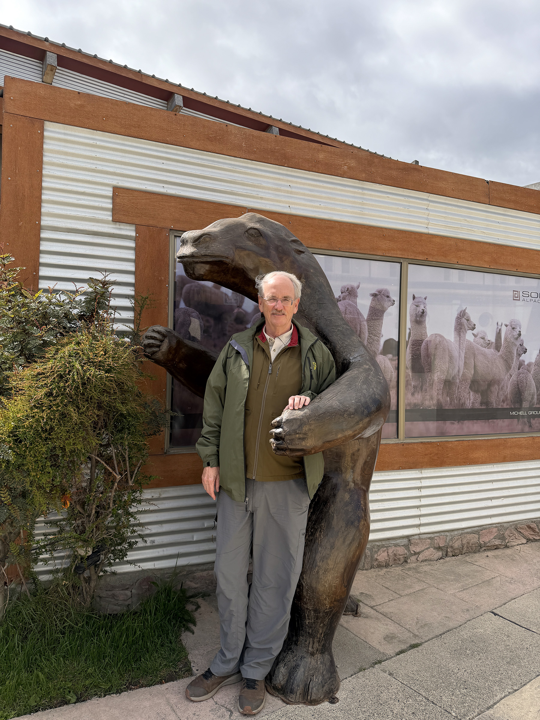 We departed by bus at 9:20 for the long drive back to Punta Arenas. First, a brief stop at a high overlook of Rio Serrano Village and the Massif; the perfect weather prompted this unplanned stop. Lu wanted us to emphasize to our friends back home that our photos will not be reliable indicators of typical Patagonian weather. After about two hours, we reached Puerto Natales, which Pancho claimed was the tourist capital of Chile. It’s a port town apparently visited by cruise ships but is quite small. We found a statue of a Mylodon, an extinct giant sloth, and I posed with it. We ate lunch here at a restaurant named Cacique Mulato. Pretty good, nice view of the harbor. On the drive out of town, we saw Monte Reclus in the distance, an active stratovolcano. Its last eruption was in 1908.