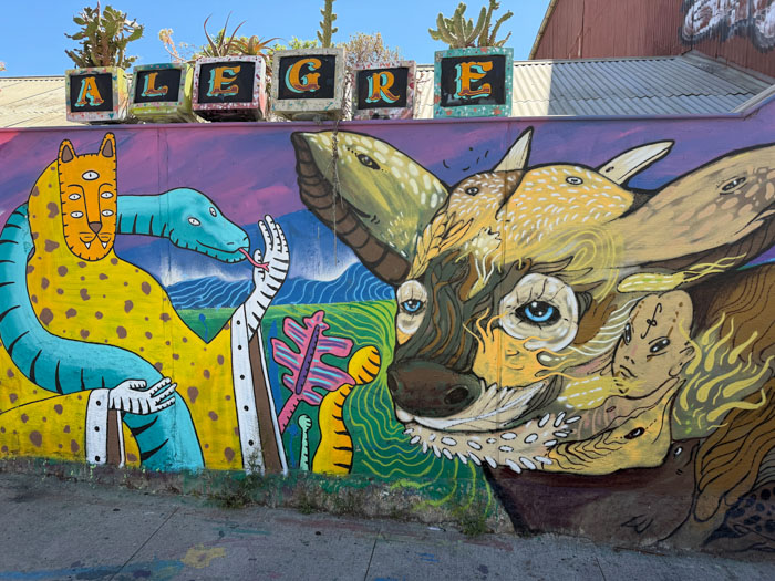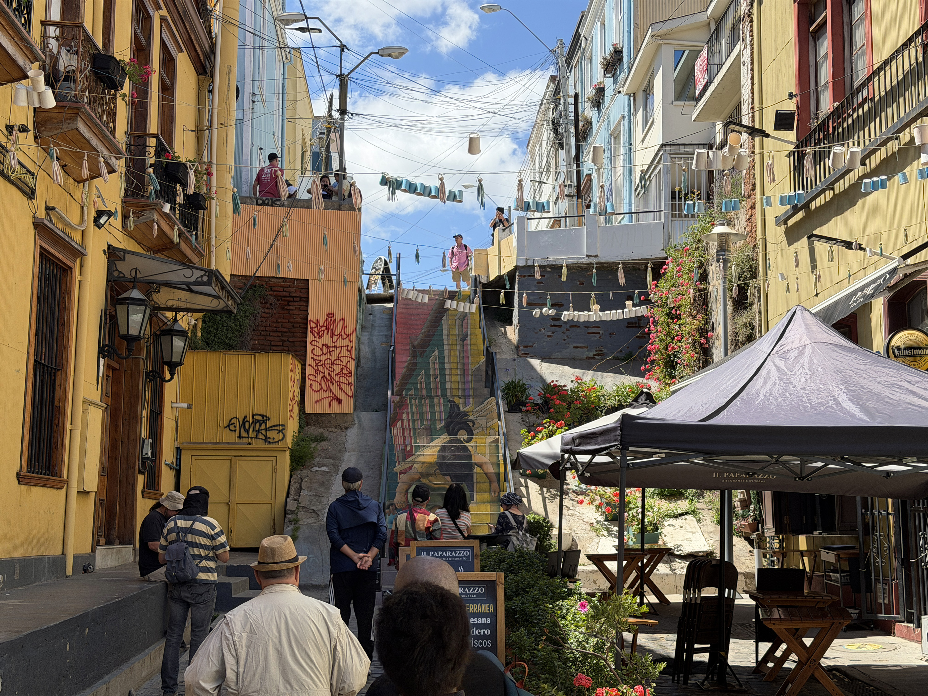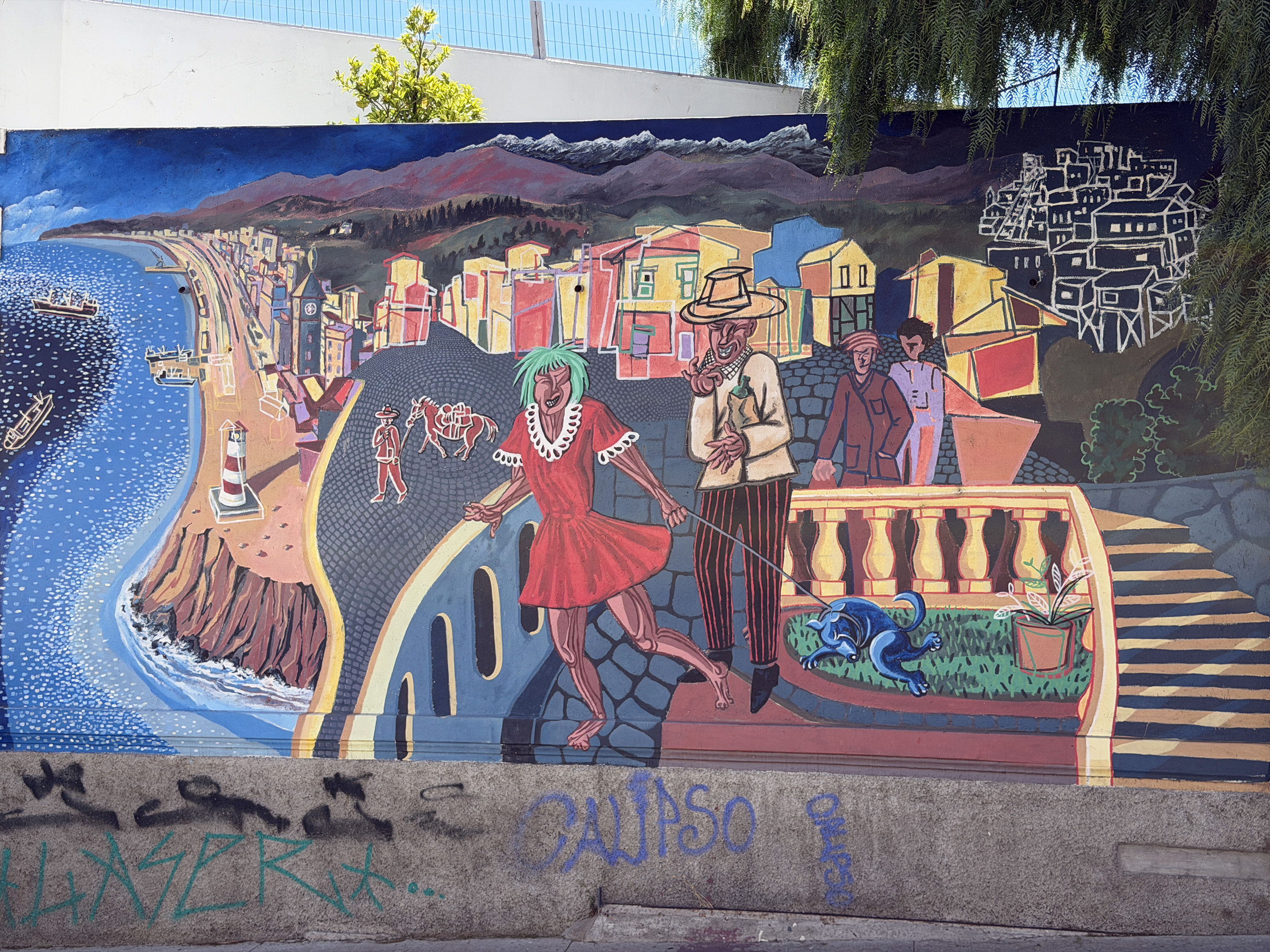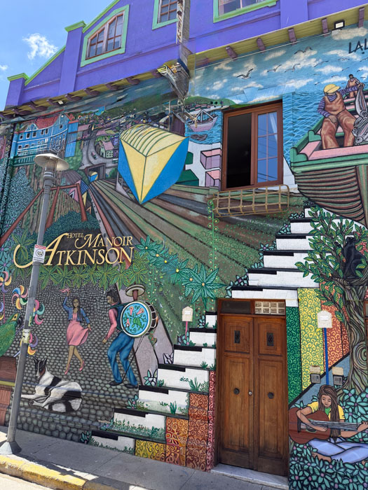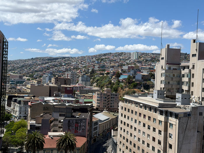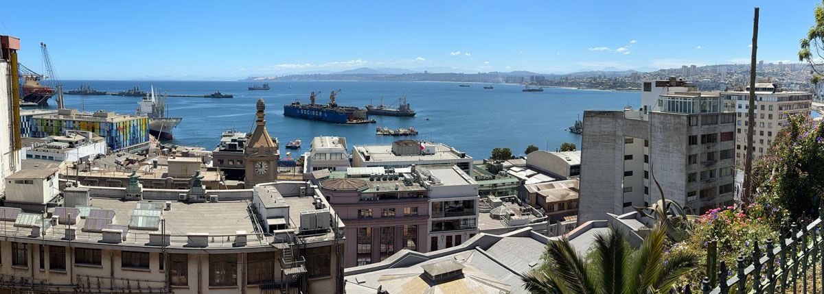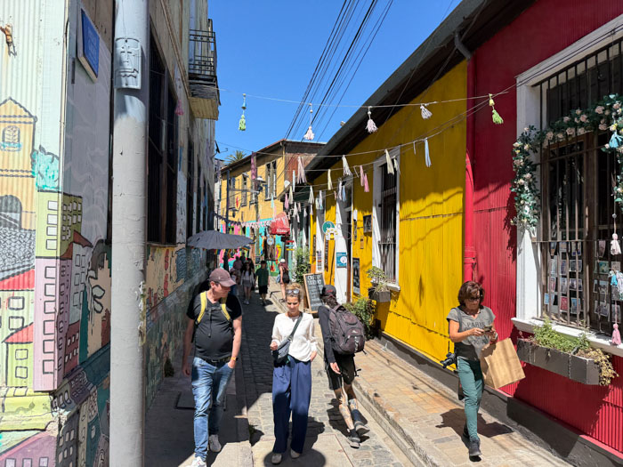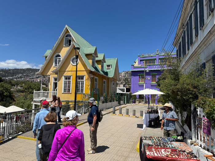 We drove about two hours west to the Pacific port of Valparaíso (val-para-EE-so), which was a critical place in international shipping until the Panama Canal opened in 1914. It was devastated by an 8.2 earthquake in 1906, the same year as San Francisco. The downtown in the flat area is uninteresting and marred by ubiquitous vandalous graffiti. Elsewhere in the city, there is some beautiful “street art,” but not this stuff. We drove up winding streets on really steep hills (in a bus smaller than we’ve had throughout the trip) and reached the Concepción district, where we started a walking tour at Seven Corners. This area is funky and colorful, similar to a San Francisco neighborhood like Telegraph Hill or Haight–Asbury, but shabbier. It is part of an area designated as a UNESCO World Heritage Site. We had to negotiate a lot of stairs, uneven cobblestone streets, and “dog mines.”