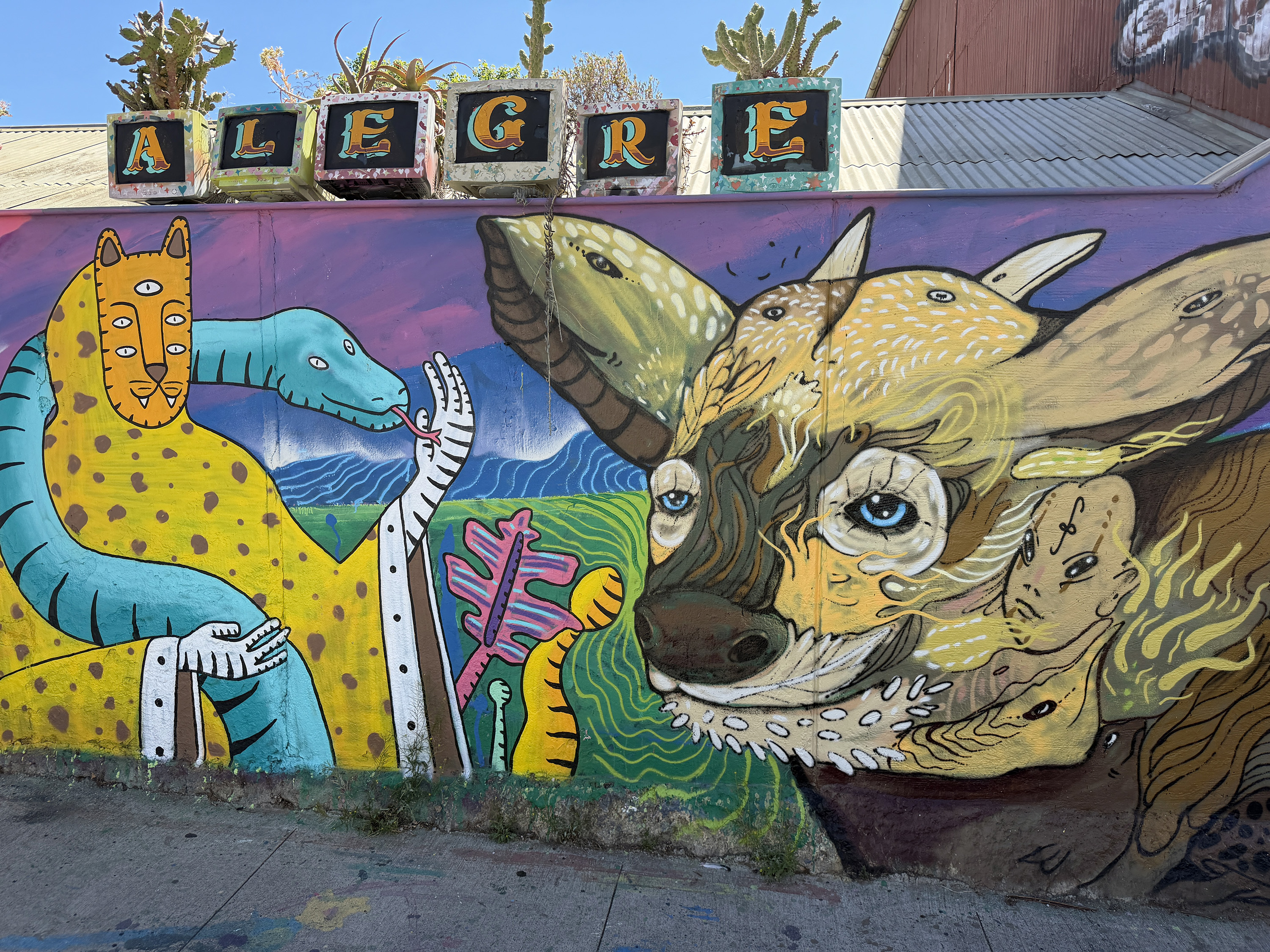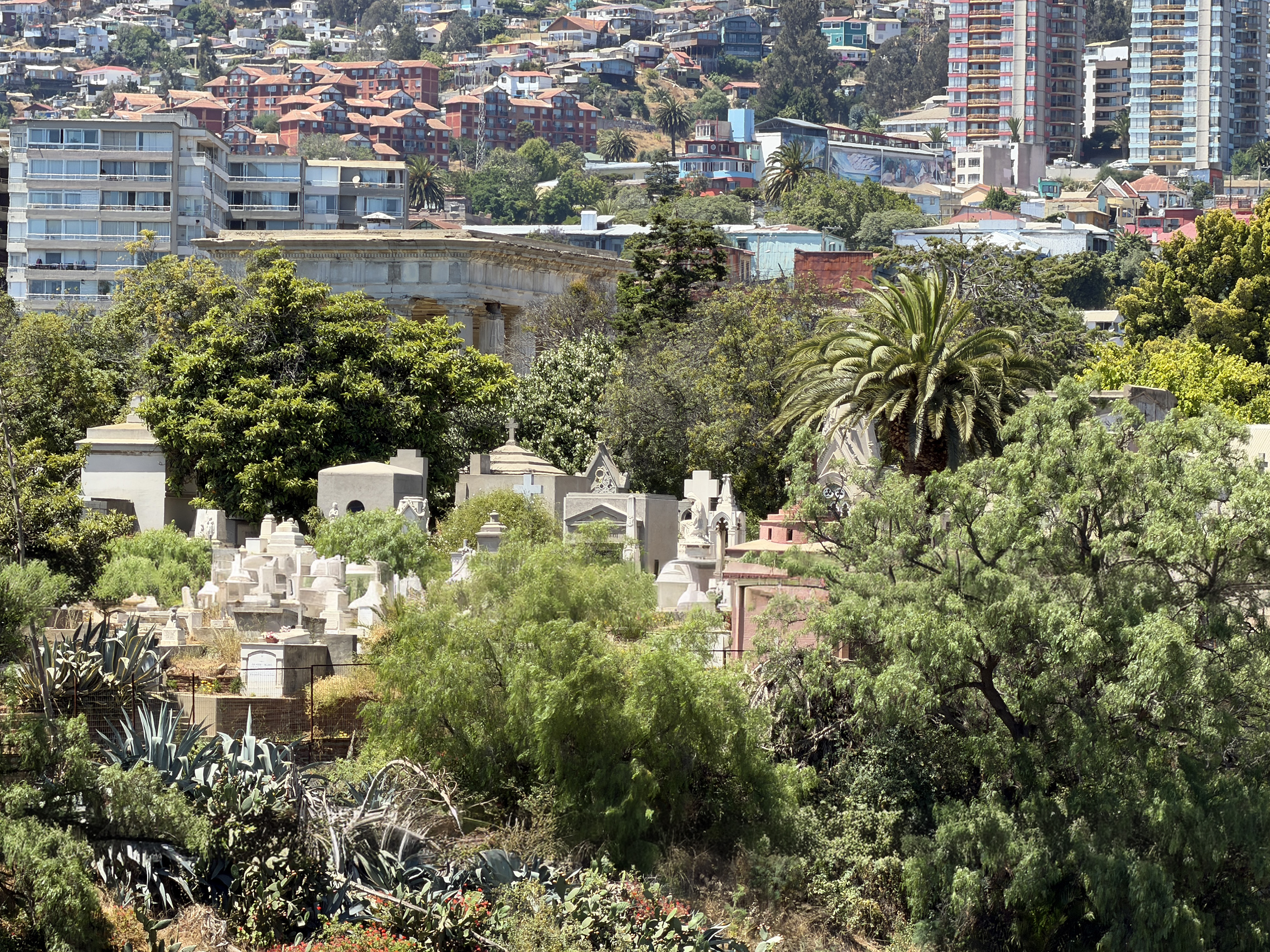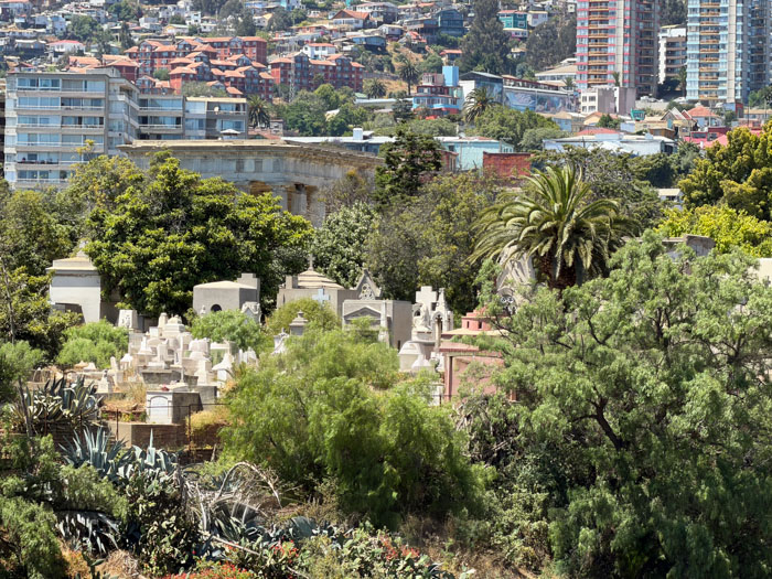 We got nice views of the harbor and the Chilean Navy home port. And of masses of homes spread over the impossibly steep hills. In the distance, we could see the peak of Ojos del Salado, the tallest mountain (22,615 feet) in the western hemisphere; Allen later told me that for various technical reasons, it is the mountain peak farthest from the center of the Earth. Across a wide ravine, we saw a cemetery that contains a mausoleum for the sailors killed during the British capture of USS Essex in 1814; her captain was David Porter, who later named the town of Valparaiso, Indiana. He was the father of Civil War Admiral David Dixon Porter. Along the way, we concentrated our attention mostly on some really beautiful murals.
