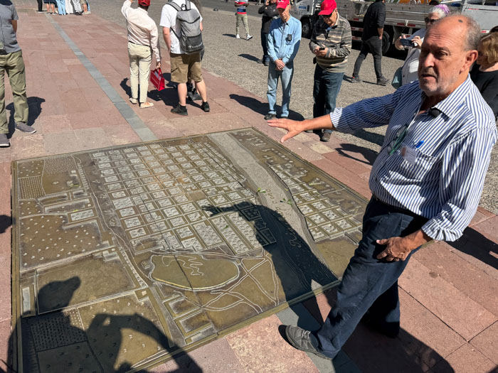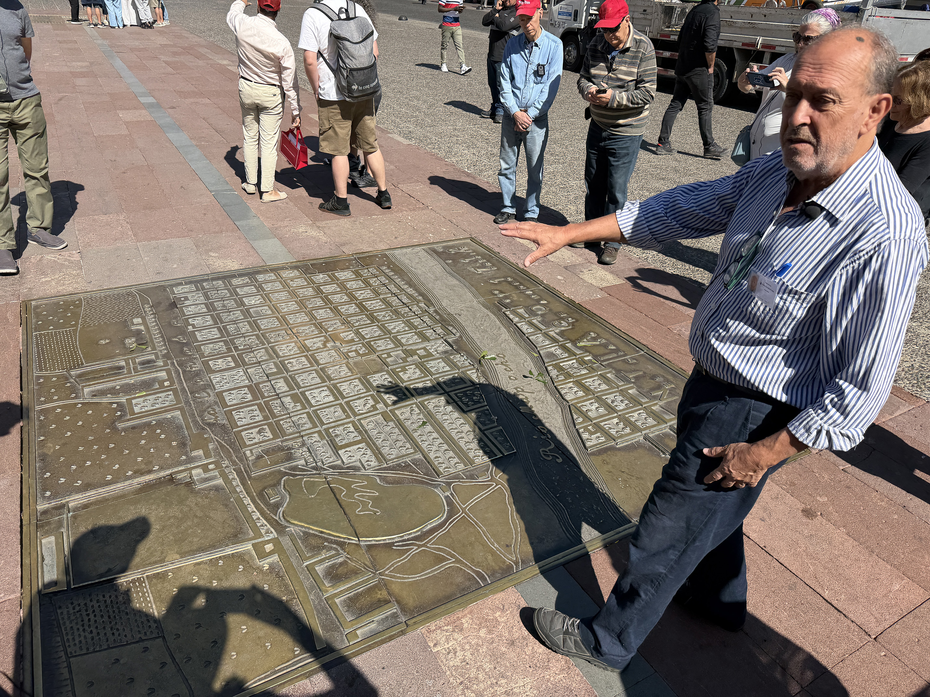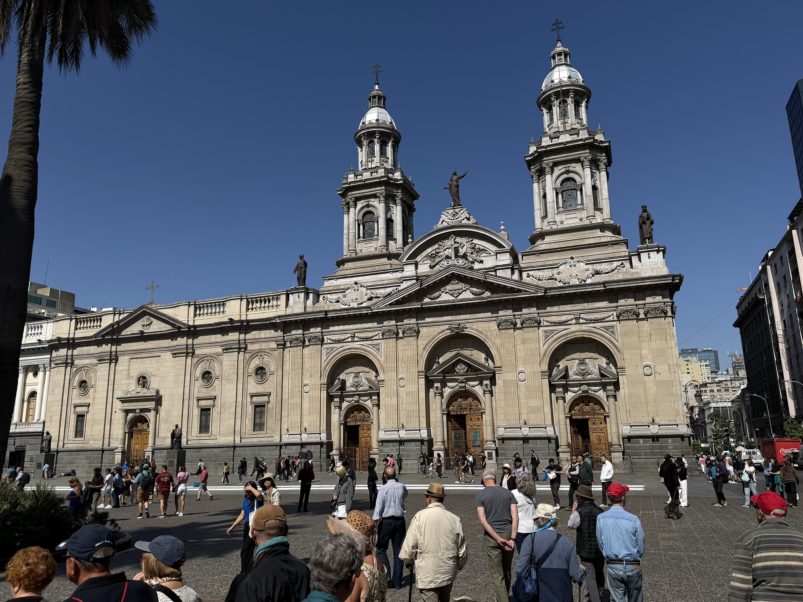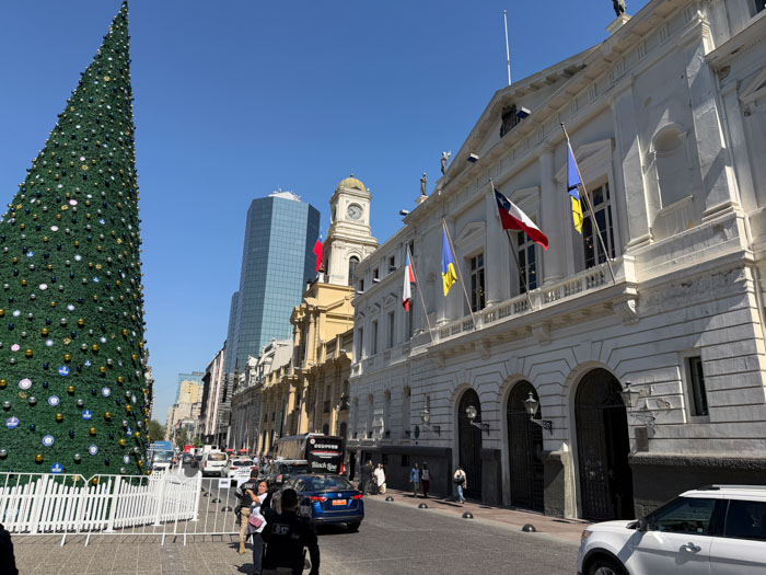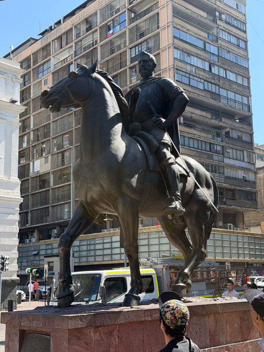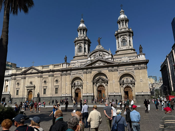 Our final day here started with a city tour of Santiago. Another beautiful day. Lu was adamant about not carrying passports, worrying about pickpockets. We saw no one like that, but I guess that’s their M.O. We walked around the Plaza de Armas, the main square where the city was founded in 1541. They used to conduct bullfights here, but now it’s a park surrounded by official buildings. We examined a brass map of the city in the 1700s and walked past the Metropolitan Cathedral. As our walk continued, we passed the Supreme Court, the Pre-Columbian art museum (which we were originally intended to visit, but all museums seem to be closed on Mondays), the Central Bank, and Constitution Square.