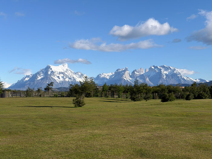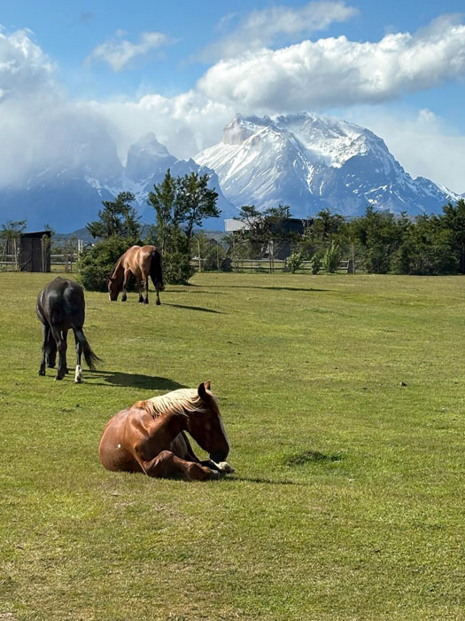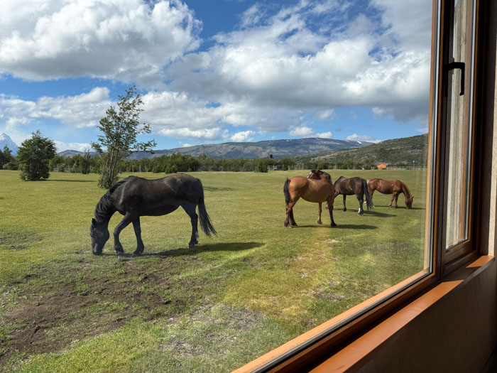 Our room at the Rio Serrano is directly facing the impressive Paine Massif, but this morning the peaks are partially covered by low clouds. Nancy was excited to see a small herd of horses being run by a gaucho. (Ray decided yesterday to buy a gaucho’s distinctive large floppy beret. I resisted a similar temptation, although Ray later reported that it was quite suitable for walking into high winds.)
