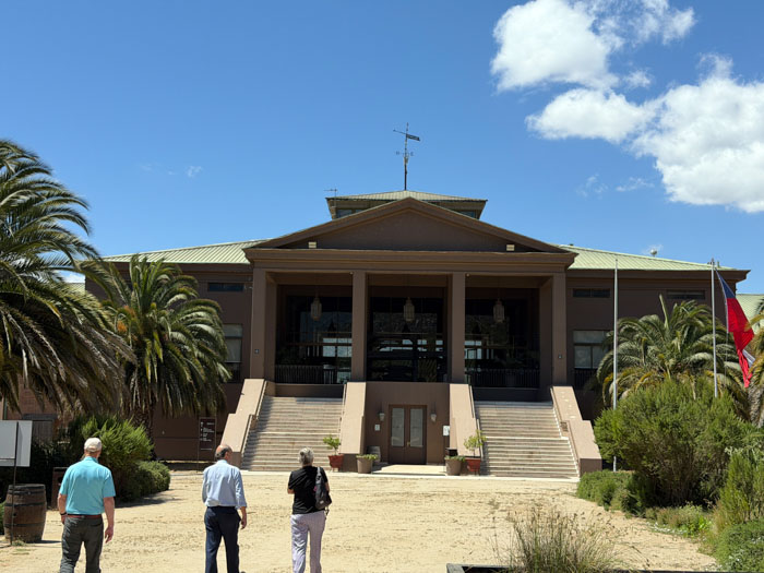 We had lunch on our own at a small restaurant called La Bruschetta, serving mediocre pizza and really poor bruschettas. Then we descended from the steep hill on a funicular named in honor of Queen Victoria to rejoin our bus. We drove to the Casablanca Valley, an emerging wine region, to visit the rather modern Veramonte winery, owned by the Spanish company González Byass, primarily famous for their Tio Pepe sherry. In addition to a typical wine production tour, we engaged in a fun competition to blend three red wines into a single bottle by adjusting percentages of the grape varietals. Nancy’s group won; she designed an original label for the bottle, and Ray was the primary architect of the blend. My group came in a close second. The sommelier of the winery judged the results and provided expert commentary. The winning bottle was gifted to Nacho, celebrating his birthday today. We plowed through 12 bottles of wine to do this exercise, but none of them were expensive.