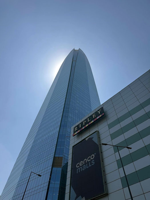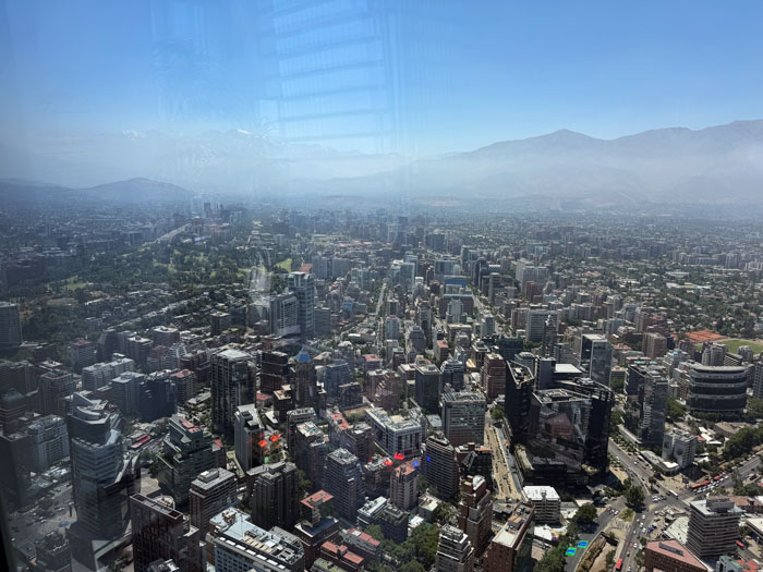 Back on the bus, we drove down the Alameda, where lots of the rich folks used to live, and passed by virtually the only remaining colonial building, a church from 1622. We drove back toward the hotel to the modern Providencia district, where we visited Sky Costanera, the tallest building in South America at 300 meters, 62 floors. It is quite similar in appearance to the Salesforce Tower in San Francisco. Unfortunately, the good weather of the last couple of days meant that the smog enveloping the city had not been blown away. From what we could see, the large city is fully surrounded by mountains, so it is quite reminiscent of Los Angeles. A difference is that here there is a paucity of single-family homes in view, replaced by numerous mid-sized apartment buildings.