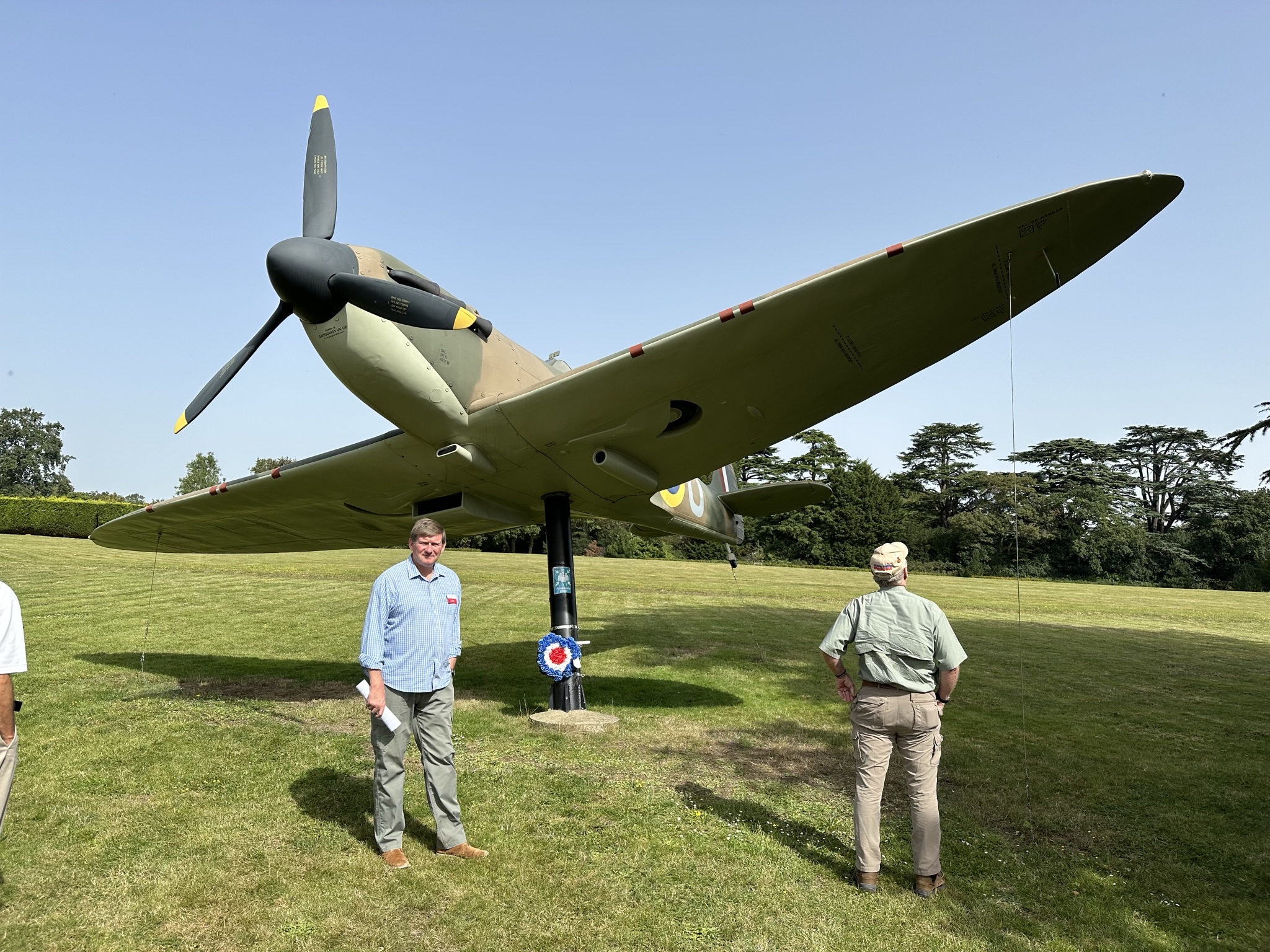 We had lunch on our own and I selected a delicious sausage roll. Then we met up again and visited the Aircraft Restoration Company, who put on a dog fighting demonstration for us using a Spitfire (one of the relatively rare two seaters, which they normally rent out at astronomical prices for joyride flights) and a Messerschmitt Bf-109 (which was actually a Spanish version of the plane, built in 1959, with a Merlin engine, which appeared in the film Battle of Britain). The maneuvers were rather impressive, including one in which a plane would fly vertically, stall out, and then swoop down around the enemy. I attempted to video pieces of it, but had a lot of difficulty actually seeing the view finder screen on the phone in the bright sunshine, so I did not always keep the planes in frame. (It is amusing to see how the video frame rate affects the appearance of the rotating propellers.) Today was another hot one in the upper 80s, and we viewed the hour long demonstration in the direct sunshine. After the planes landed, the two pilots, Mo and Rats (Messerschmitt and Spitfire, respectively), came to answer questions. One described the Messerschmitt 109 as “an angry hornet in a jar,” with characteristics that made it very dangerous to take off or land. He said that 33,000 of these planes were destroyed in the war, and 11,000 of them were lost in takeoffs and landings, not combat. I was interested to learn that Rats, a former RAF officer, is currently a pilot with Virgin Atlantic. Sort of a Busman’s Holiday.
