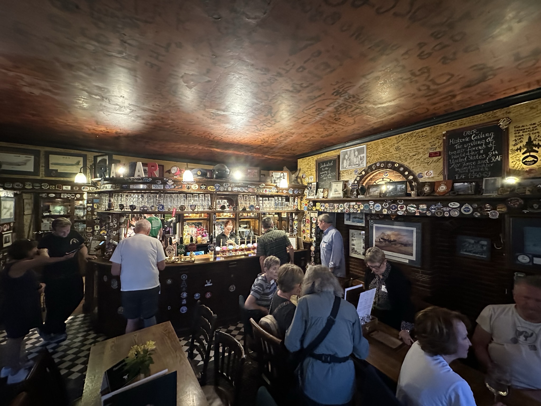 After a three-hour break at the hotel, we met for dinner at the historic Eagle Pub, established in the 14th century, and one of the main venues for RAF officers to relax during the war. The walls and ceiling are completely plastered over in military unit patches and graffiti. Of historical note, Krick and Watson announced their discovery of DNA at the pub. And within one block, there is a historical plaque recognizing Alan Turing. There is also an extremely odd clock showing time being consumed by a monstrous grasshopper, the gift of a donor who spent over $1 million building it. Dinner was steak and ale pie, which was excellent.