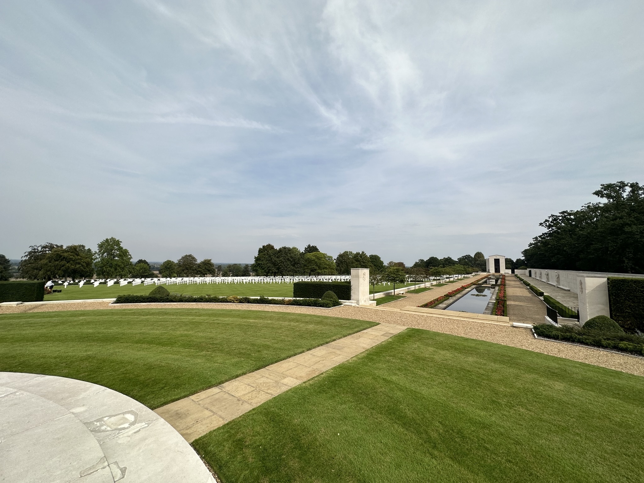We bused to the Cambridge American Cemetery, where 3,812 are buried and 5,127 unknowns are listed on a long marble wall. The former include a large number of UK training accidents, like Slapton Sands in 1944. The latter are mostly airmen lost on missions and seamen from the Battle of the Atlantic. I found Major Glenn Miller’s name in the list. The chapel has a stupendous map of Europe and the Mediterranean, which is beautifully designed. Our visit was marred by an accident, which caused us to postpone a planned memorial wreath laying. One of our ladies tripped and conked her head on the pavement, requiring help from one of our group, a doctor, and she was evacuated by an ambulance. The hospital discharged her at 2 AM and she returned to the hotel; she and her daughter ended up missing a couple of days of the tour.