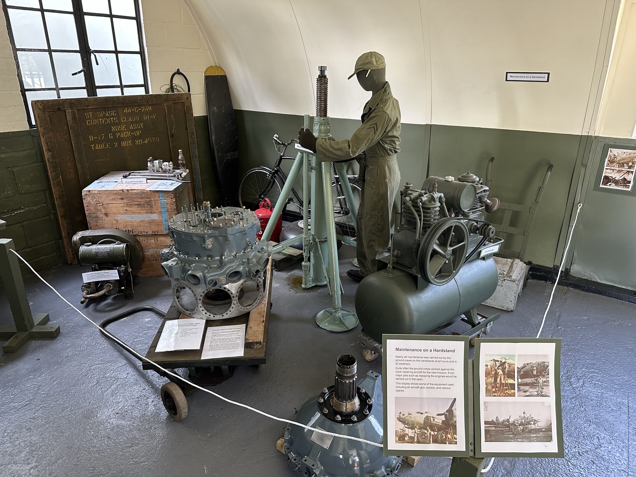 We bused about 45 minutes on mostly country roads to Thorpe Abbots, home of the 100th Bombardment Group, the “Bloody One Hundredth.” It was not in fact the BG that had the deadliest record of losses, but was given that nickname after two back to back disastrous missions to Bremen and Münster; in the latter, 13 planes went on the mission and only one returned. Different docents told us different casualty figures, but it seems that about 757 were killed in action. This BG is the primary subject of the upcoming Tom Hanks, Steven Spielberg Apple TV+ miniseries, Masters of the Air, based on the book of the same name by Donald Miller, which I read prior to joining the tour. Our tour guide Bob Shaw was involved in boot camp training the actors for this series.