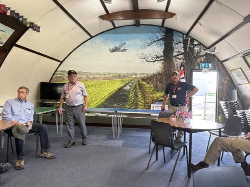 We were summoned outside for a memorial wreath laying ceremony. The WW II Museum intended for us to place the wreath at the Cambridge American Cemetery, but because of the medical emergency that day, we postponed until today. I then retired to a portion of the museum devoted to the British Resistance Organization, aka Auxiliary Units, which is an organization that remained a secret until years after the war and I had never heard of. Wikipedia has a summary article about these civilians trained to be guerrilla fighters in the case of a German invasion of England, and it all looked very interesting, including an informative five minute film, but all of a sudden the bus departure time was moved up and it was visit interruptus for me. As we departed, we got another guided tour around the large expanse of the air station. There are more building surviving than in the previous BG, including a restored hangar, one headquarters building, and a few Nissen huts that seemed to be in use as farm buildings.