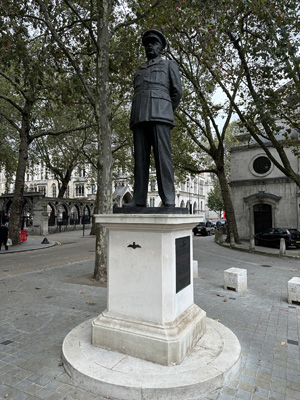 We walked down the street to the Three Stags pub where most of the folks had fish and chips, but since we had that last night at the Union Jack, the pub accommodated me with a lamb burger. Then off to St. Clement Danes Church, the official church of the RAF. It was originally there in the 9th century, named after the patron saint of mariners, was absorbed by the Danish Vikings, burned in the Great Fire, rebuilt by Christopher Wren, and destroyed in the Blitz. After the war the RAF restored it. It contains many memorials to units and individuals, including books with casualty lists and almost 900 squadron-level emblems/badges on the floor, carved from Welsh slate. There is a small section commemorating the American contribution to the air war, framed by a portion of the Gettysburg Address! In front of the church are two large statues of Hugh Dowding and (the controversial) Bomber Harris.