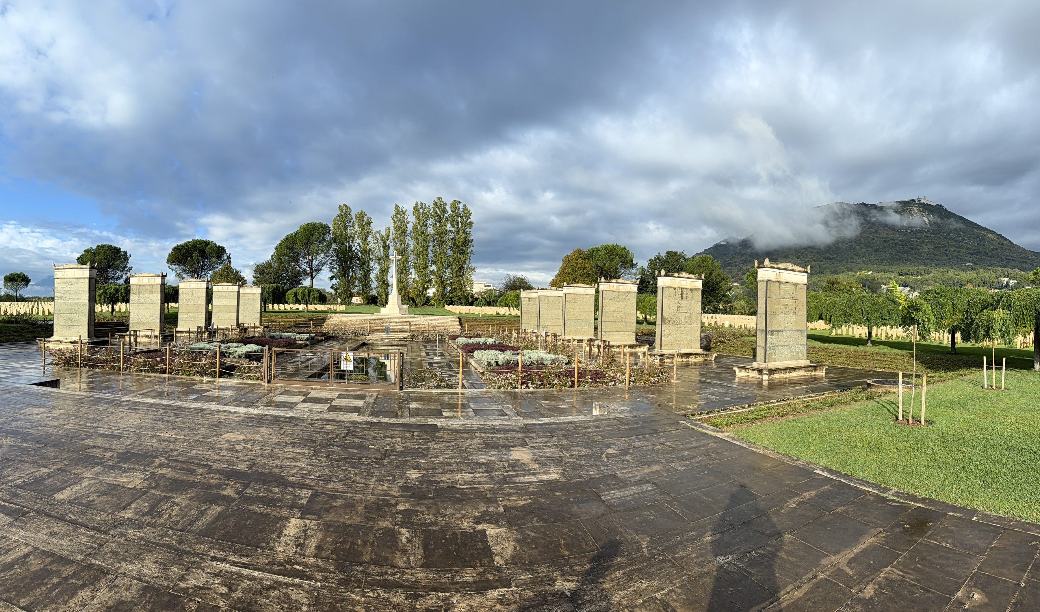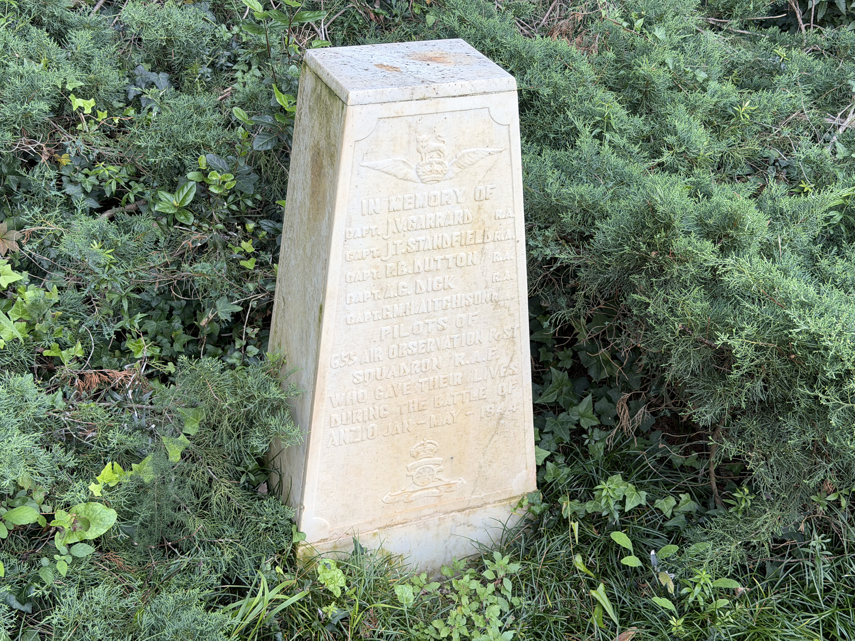 We started in Cassino at the Commonwealth War Graves Commission cemetery where there are 4,500 interred. It is split into two parts, with the British soldiers in front and the Commonwealth in the rear, and there is an Indian style to some of the monuments. We drove north on Route 156 and then passed through the Lepini mountains to the coast, where we drove north on the Anzio Plain.