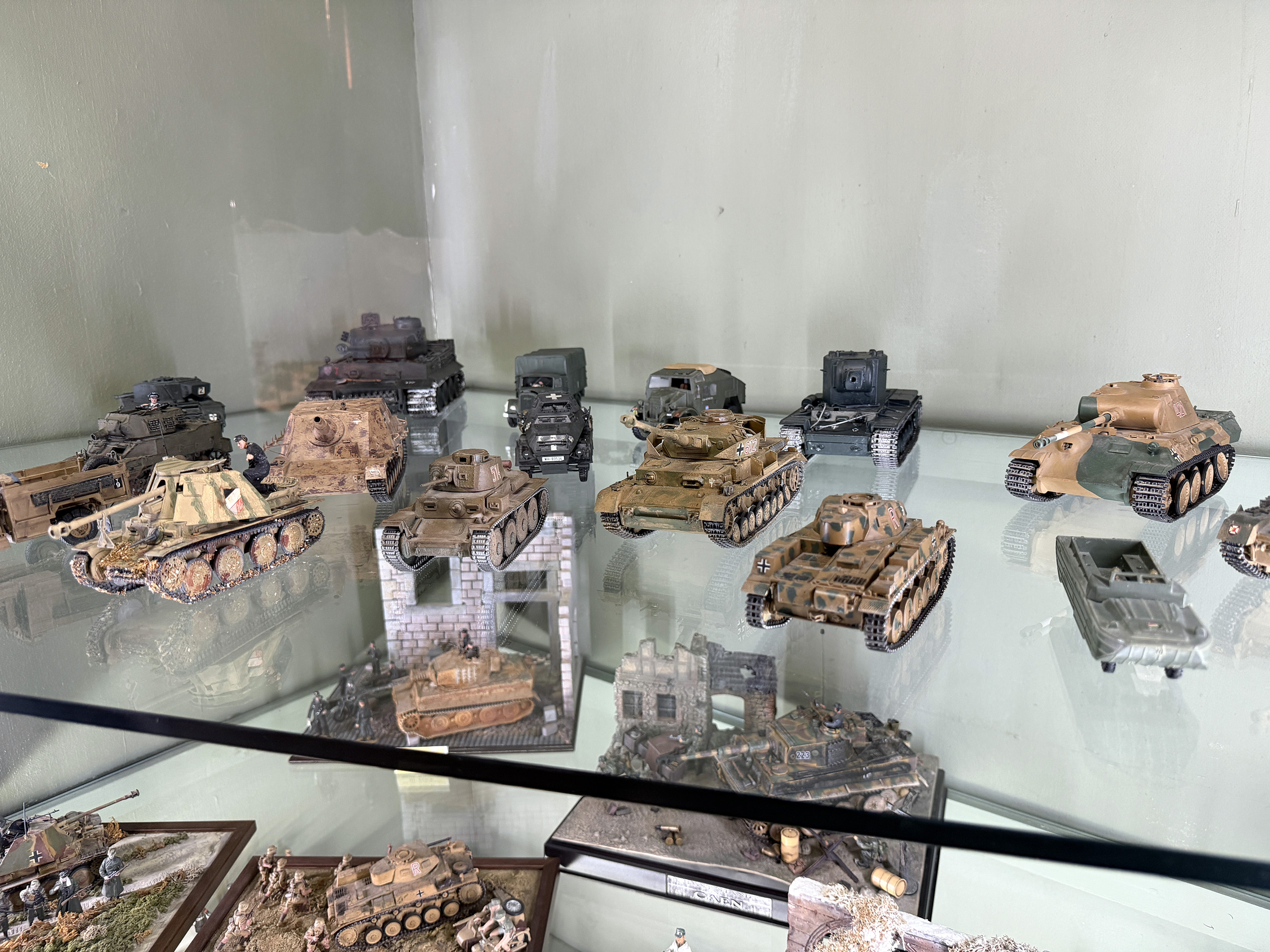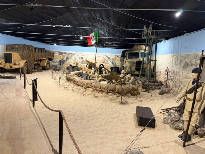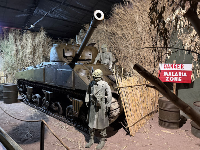 Then there were three sheds on the campaigns of the war involving Italians. The shed entitled "El Alamein to Messina" featured huge dioramas with life-size mannequins and military equipment, some with thunderous sound effects. (The exhibits also covered Italian activities in Africa well before El Alamein.) The campaign and battle descriptions were multilingual and very detailed with decent maps. One of my favorite parts was a Sherman DD tank that had been fished out of the sea, so it was a little rusty, but it had a full canvas flotation screen in place.