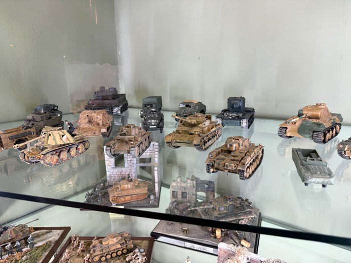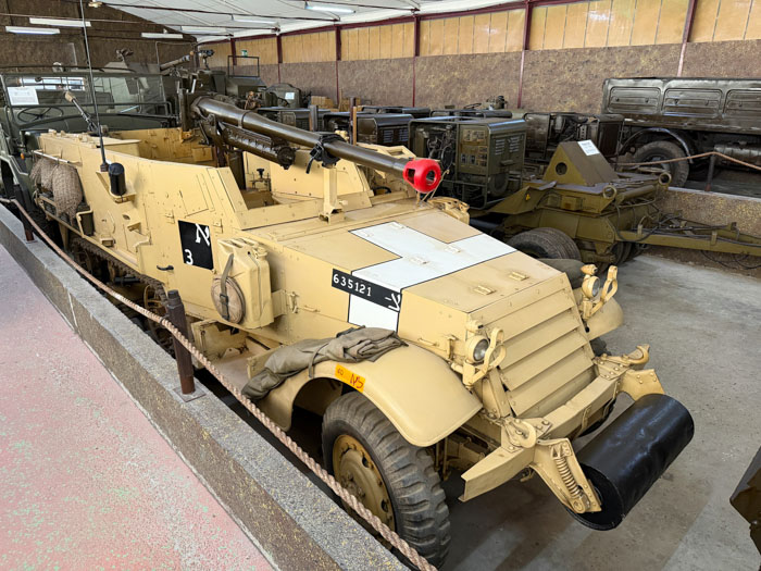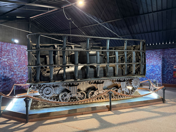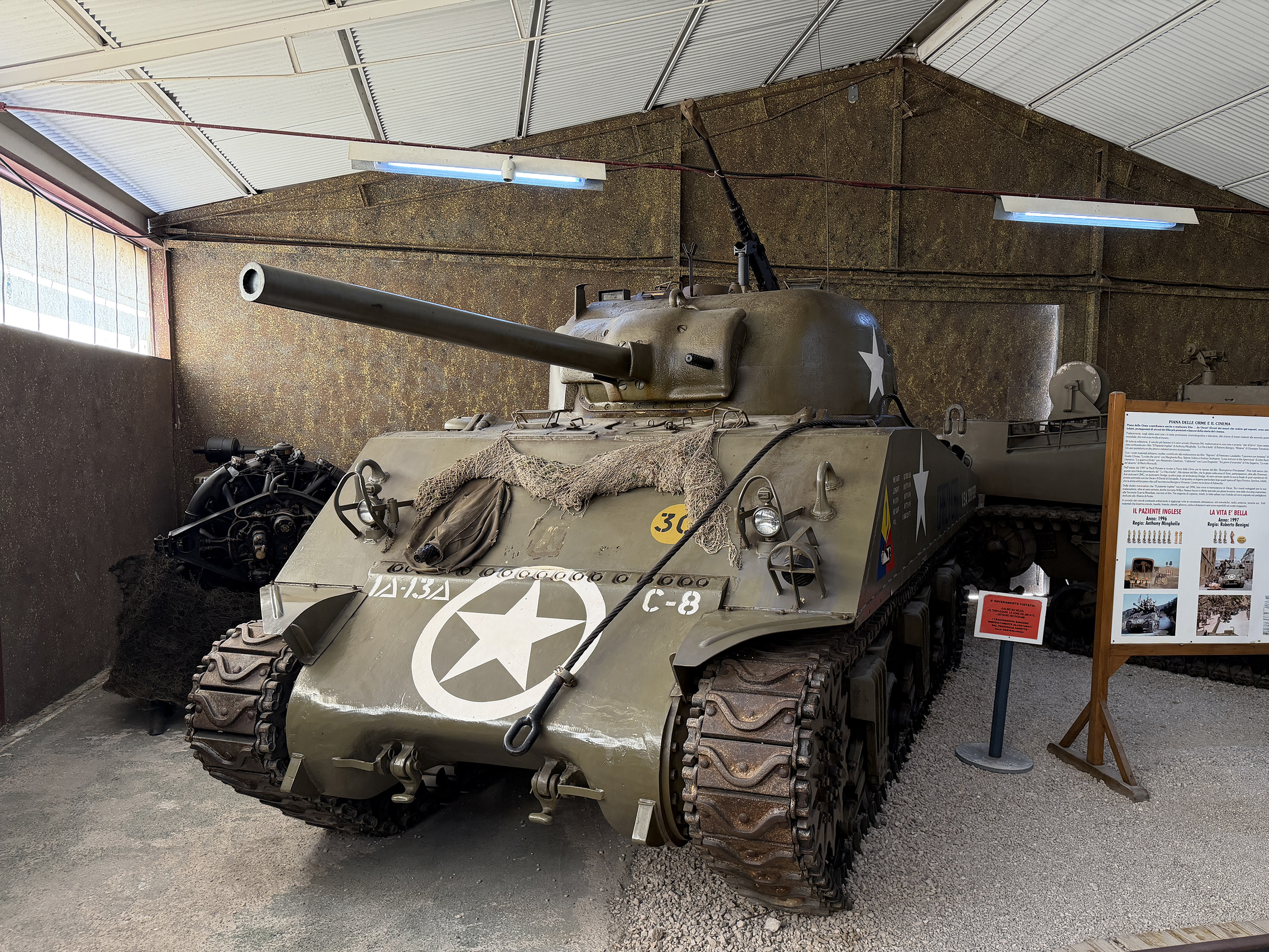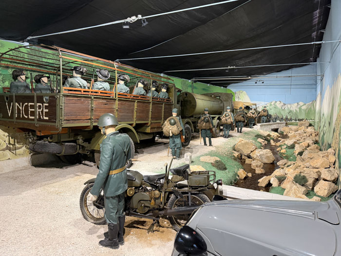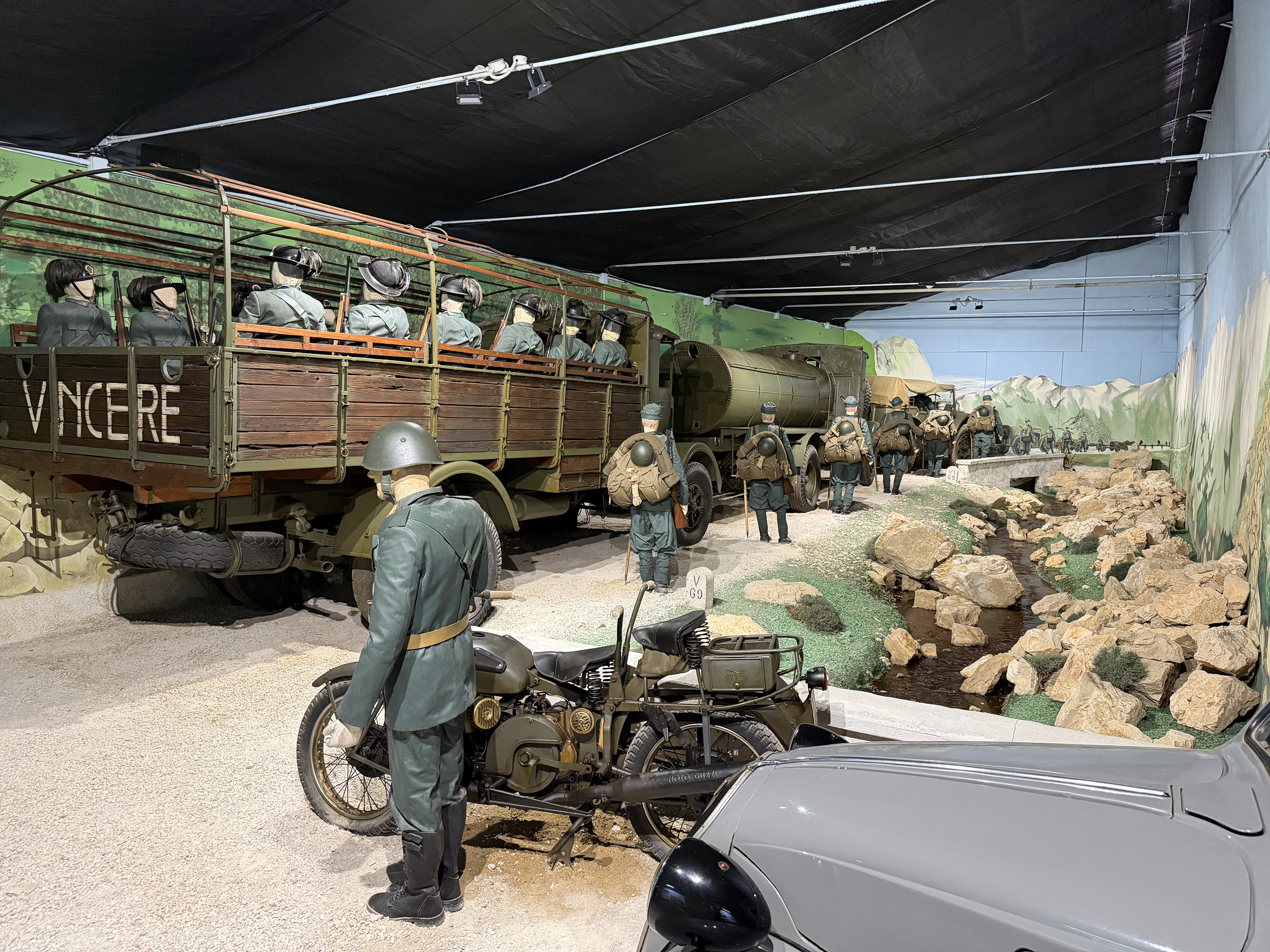 The second half of the camp is focused on military history, like a Disneyland of World War II. There were exhibits about Italian concentration camps and rounding up the Jews after the German occupation. They described the transition from Italian prisoners of war to Italian Military Interned, IMI, and the brutal treatment they received from the Germans. Outside was a mock railway platform with a locomotive and train cars showing mannequins of Nazi officers and Jews being taken away. The shed about "Vintage Means of War" was mostly trucks and half-tracks, but they had a Sherman M4 and an M7 Sexton.