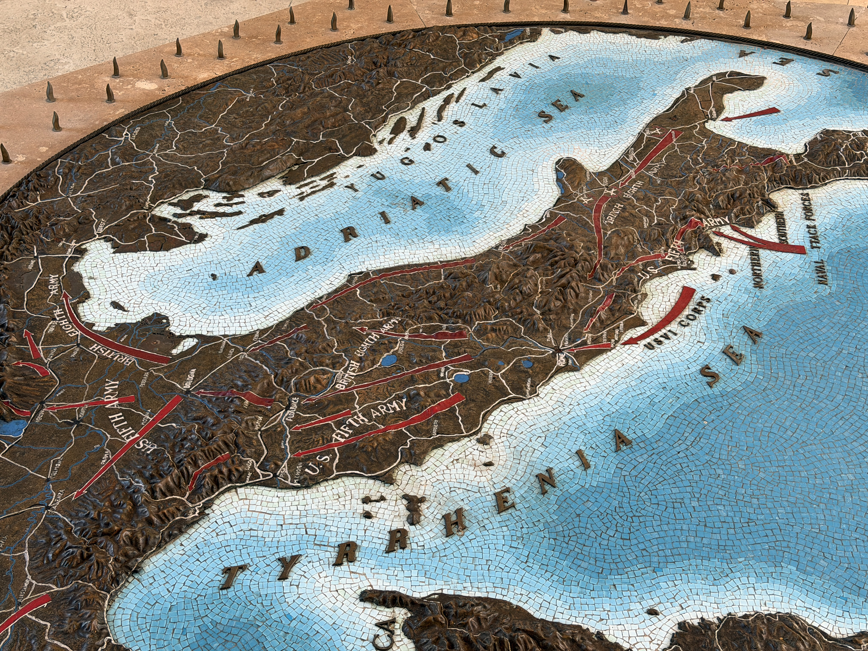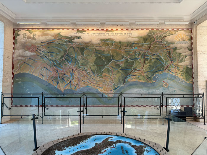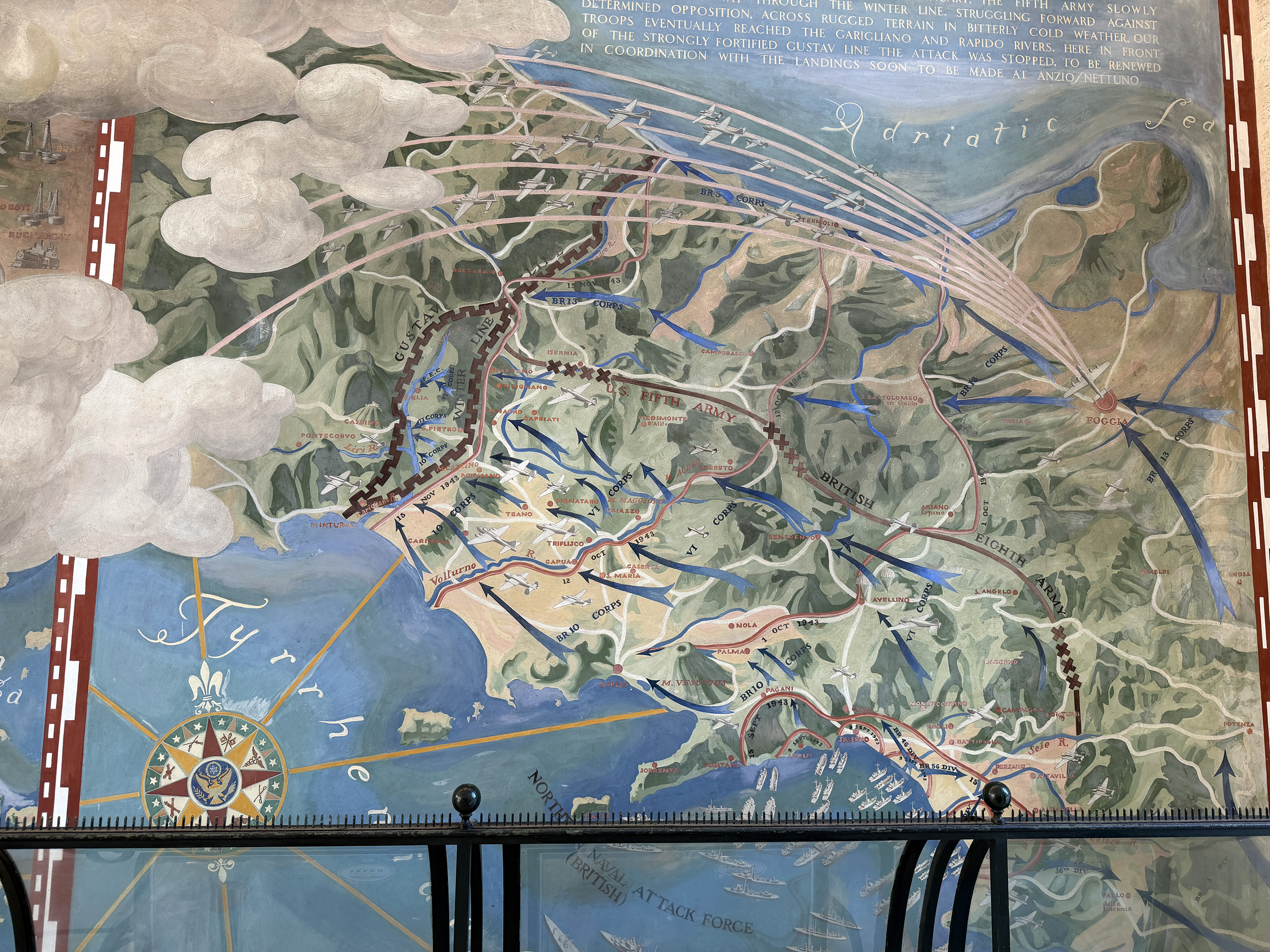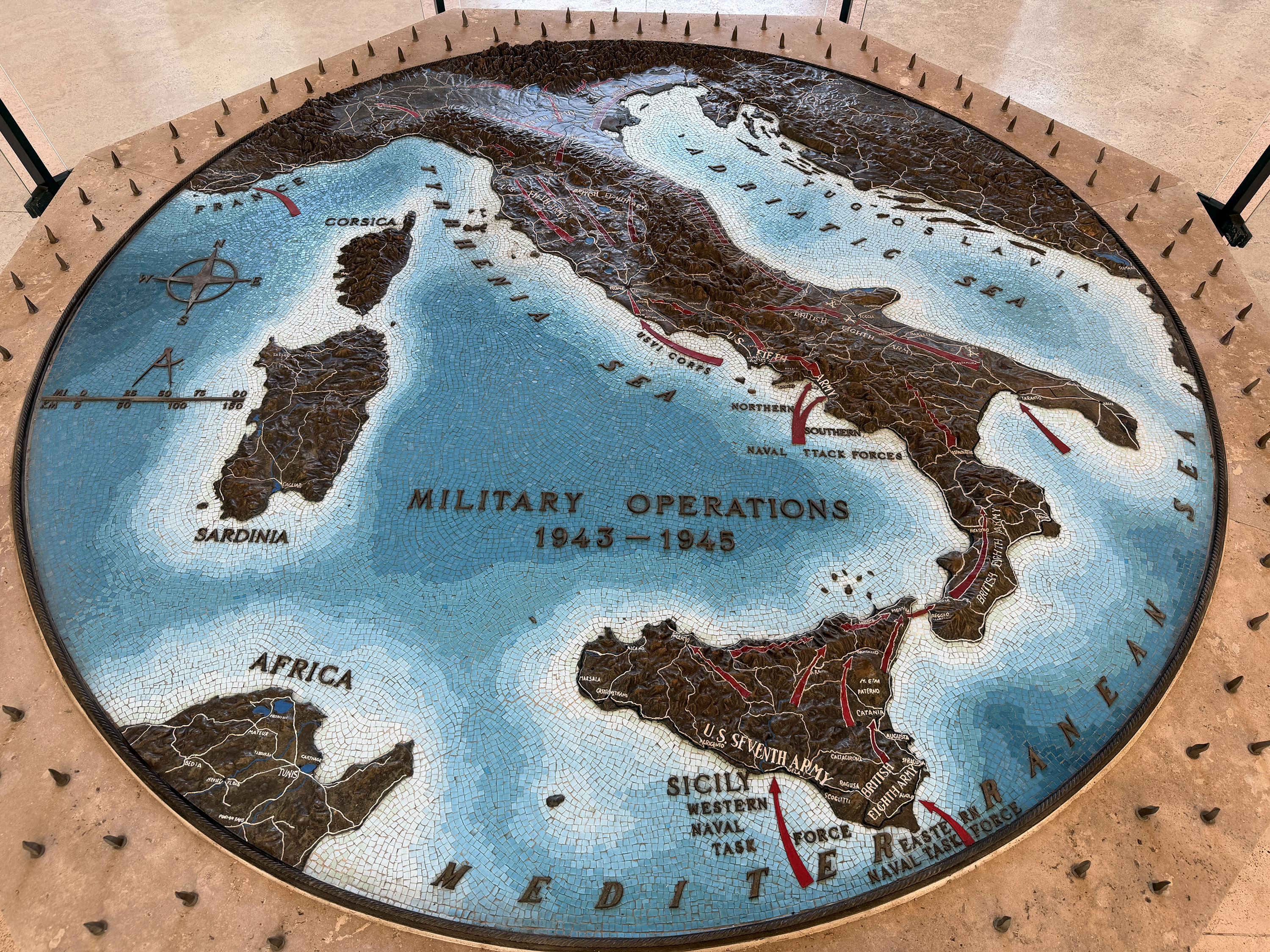 We started at the Sicily-Rome American Cemetery and Memorial in neighboring Nettuno. The grounds and facilities are immaculate. There is a video in the visitor center about the campaigns in Sicily and up to Rome (north of Rome is handled by the Florence cemetery), highlighting some of the men and women killed, now buried here. There are 7,861 graves and 3,095 names in the memorial hall for those missing. Many of the dead were relocated back to the States based on family preferences. Although everything was very moving, the highlight for me was at the far end of the property where a building held that memorial hall as well as a giant map room. The memorial hall has a large ceiling artwork that depicts the sky—stars, planets, and constellation symbols—exactly as they were at 2 a.m., January 22, 1944, the start of the Anzio landings.