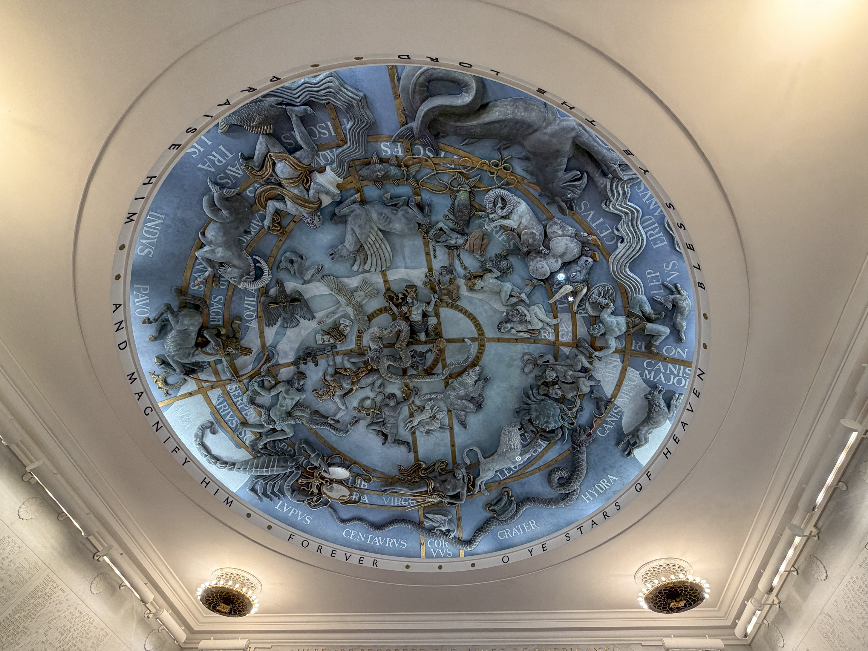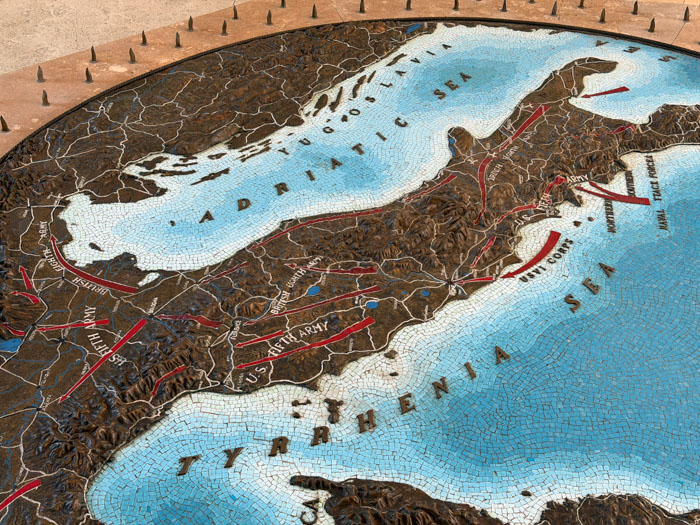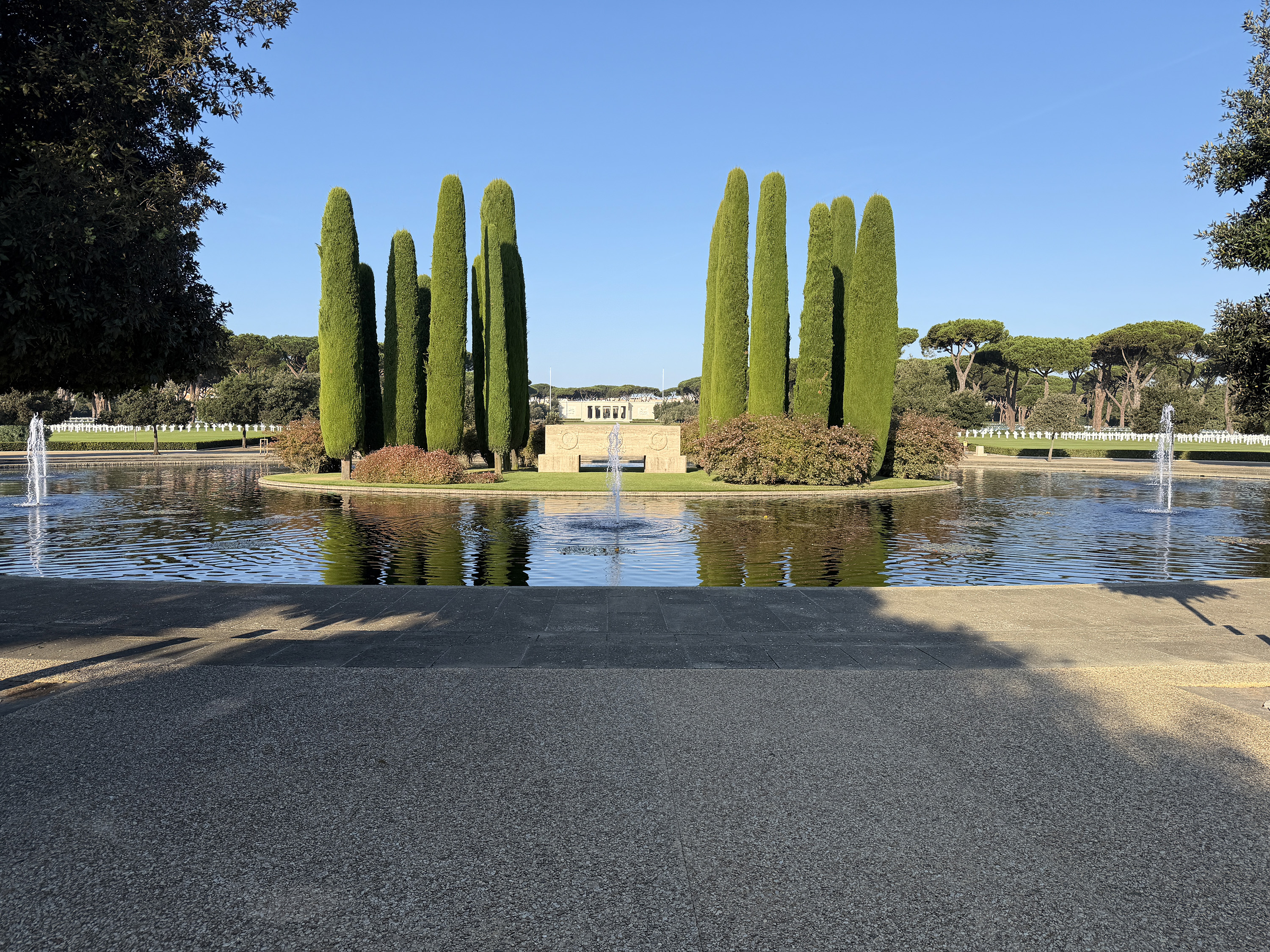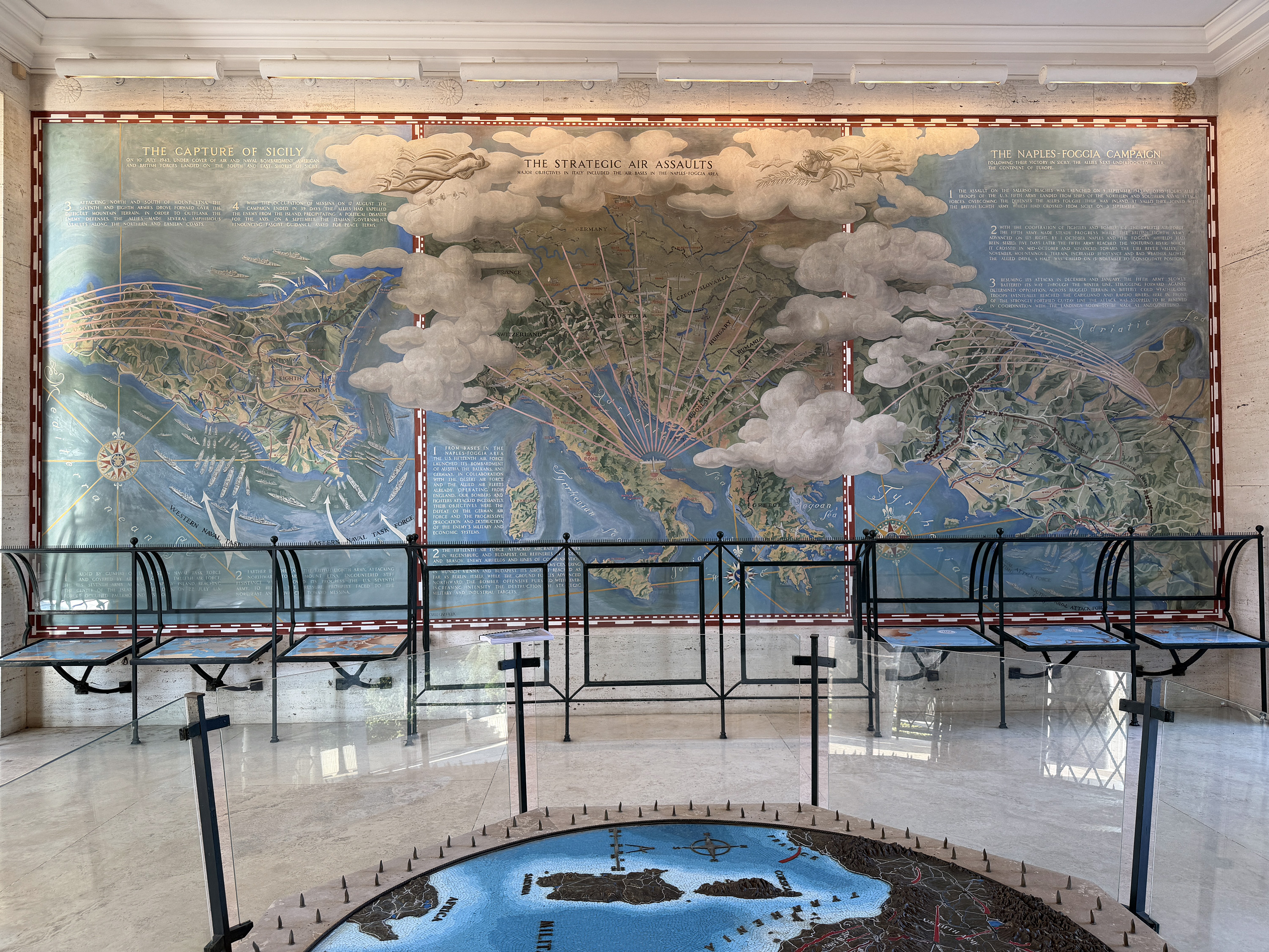 We started at the Sicily-Rome American Cemetery and Memorial in neighboring Nettuno. The grounds and facilities are immaculate. There is a video in the visitor center about the campaigns in Sicily and up to Rome (north of Rome is handled by the Florence cemetery), highlighting some of the men and women killed, now buried here. There are 7,861 graves and 3,095 names in the memorial hall for those missing. Many of the dead were relocated back to the States based on family preferences. Although everything was very moving, the highlight for me was at the far end of the property where a building held that memorial hall as well as a giant map room. The memorial hall has a large ceiling artwork that depicts the sky—stars, planets, and constellation symbols—exactly as they were at 2 a.m., January 22, 1944, the start of the Anzio landings.