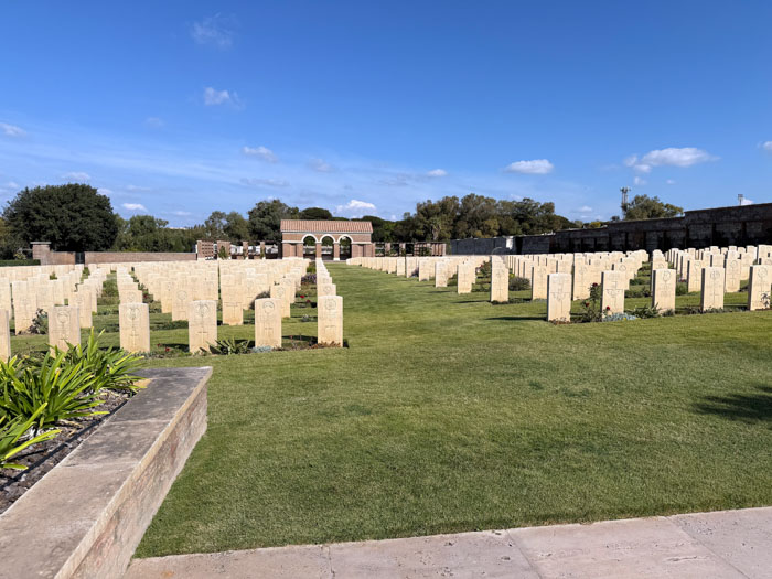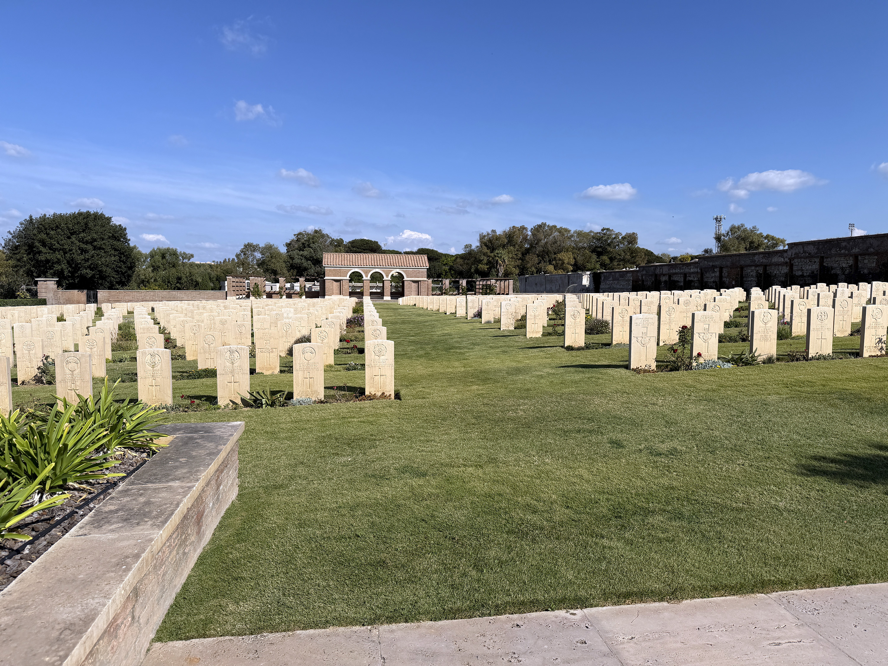 Sitting in the beautiful weather on the cemetery grounds, Frank started a lengthy and informative session analyzing the key terrain of the Anzio battlefield and the planning for the invasion, Operation Shingle. Although the conventional wisdom is that Maj. Gen. John P. Lucas, the VI Corps commander, was deficient in command and too timid to advance beyond the beachhead until he had built up a large force, Frank took the opposite view and was quite supportive of him. He described any effort to immediately advance to the Alban Hills with his small two-division force, as his orders from Mark Clark suggested, would have been snuffed out by the Germans within 48 hours. We also made a brief visit to a British cemetery for Anzio that had only about 1,100 graves. This one included soldiers only from the 1st British Division.